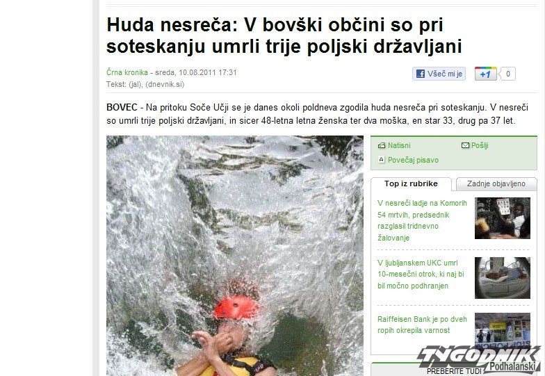W czasie dzisiejszej wycieczki do wody wpadła 48-letnia Polka. Ratownicy TOPR rzucili się jej na pomoc. Jeden zginął w nurcie potoku Učja, drugi zmarł na brzegu mimo prób reanimacji - podaje słoweński portal www.dnevnik.si Zginęła także ratowana przez nich Polka.