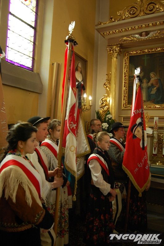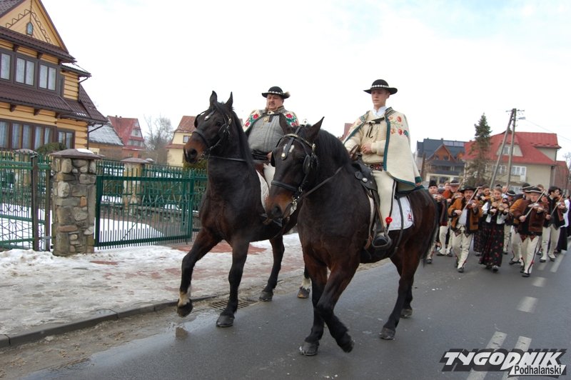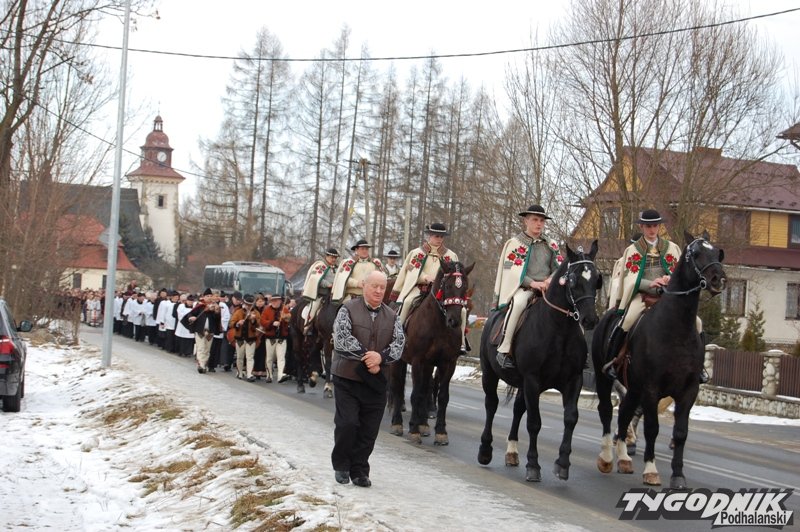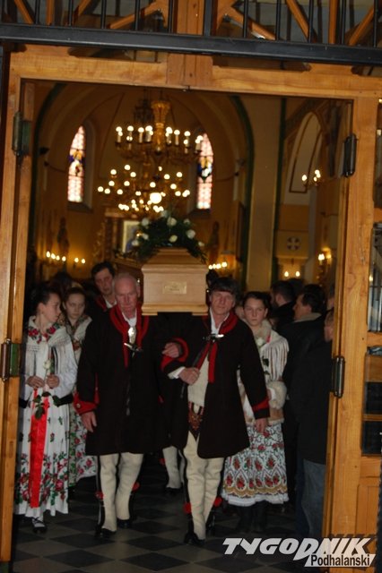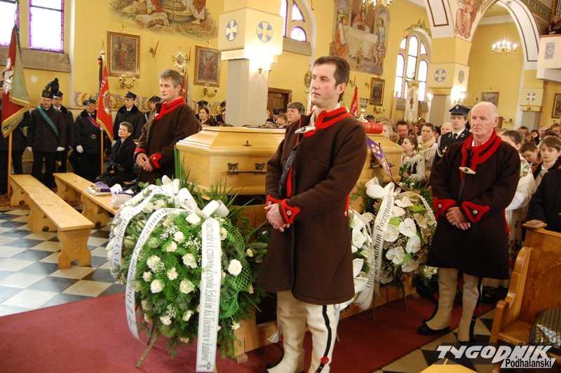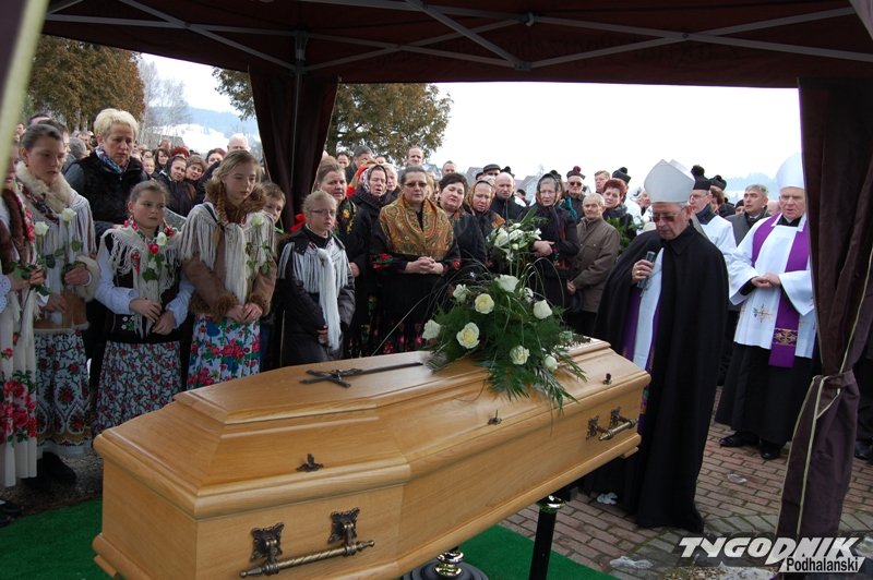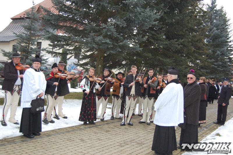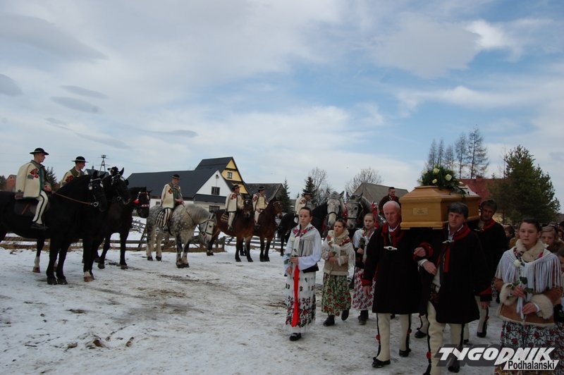 Muzycy z kapeli, regionalny zespół, banderia konna i zaprzęg wiozący zmarłego proboszcza - górale z parafii w Cichem – Miętustwie pożegnali dzisiaj swojego proboszcza ks. Józefa Ślazyka, który przez wiele lat sprawował swoje obowiązki jeżdżąc na wózku inwalidzkim.