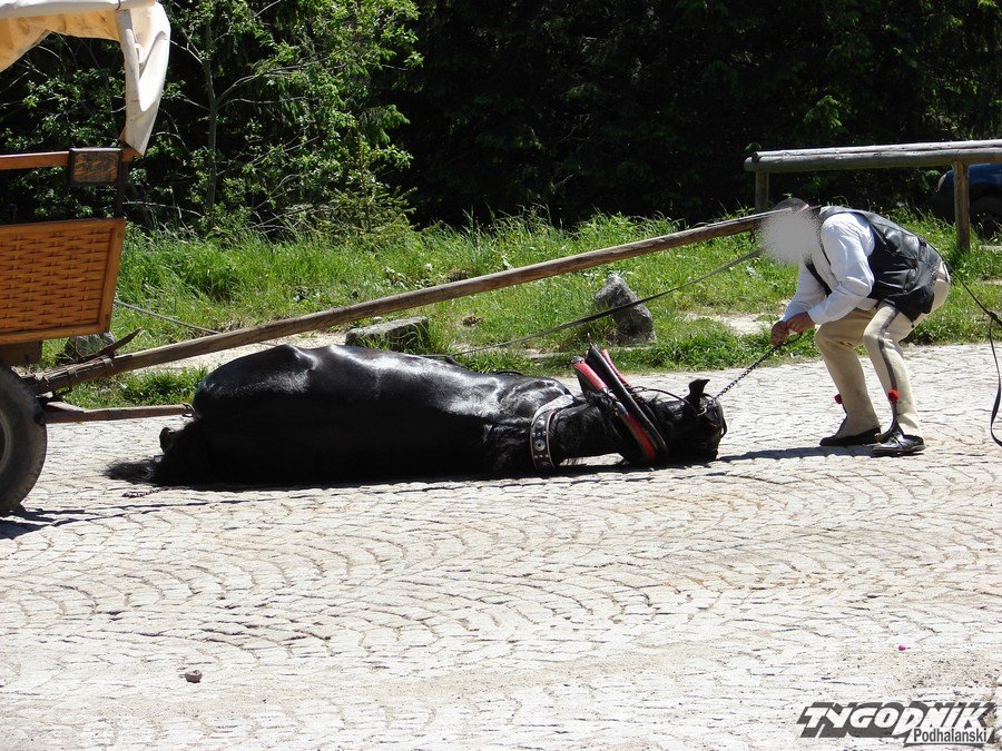Górale bagatelizują wszelkie uwagi odnośnie przemęczenia koni. Osobiście komentowałam głośno, że oni siedzą schowani w cieniu a konie stoją w upale wiele godzin zaprzęgnięte. Ta sama sytuacja jest na Krupówkach. Twierdzą,że \"koń sobie z tego nic nie robi\". Biiorą do wozu po 14 osób + dzieci+ bagaż-wózki. W ubiegłym tygiodniu było bardzo gorąco, byłam w drodze na Morskie Oko i widziałam jak przy jednym wozie 2 konie ledwo szły do góry. Napewno obracały tą trase 2-3 razy. DLACZEGO WSIADACIE W TE WOZY??? NIE PRZYJEMNIEJ IŚĆ I PODZIWAĆ WIDOKI? Dlaczego inni potrafią z małymi dziećmi, wózkami przejść całą trasę a inni duwy wożą i przyczyniają się do takich wydarzeń. Ludzie szanujcie zwierzęta i nie pozwalajcie im padać z przemęczenia. Mówię i mówię, nikt mnie nie słucha, śmieją się ze mnie a na efekty długo nie trzeba czekać. Ręce mi opadają. Mam nadzieję, że konsekwencje będą wyciągnięte wobec woźnicy. Psy też tu biegają po ulicach głodne... ech!