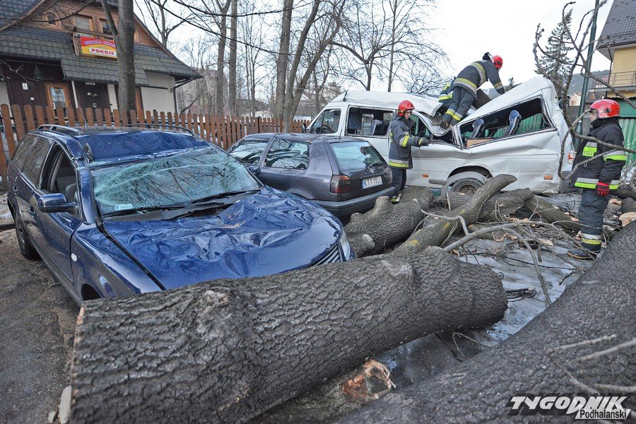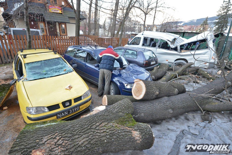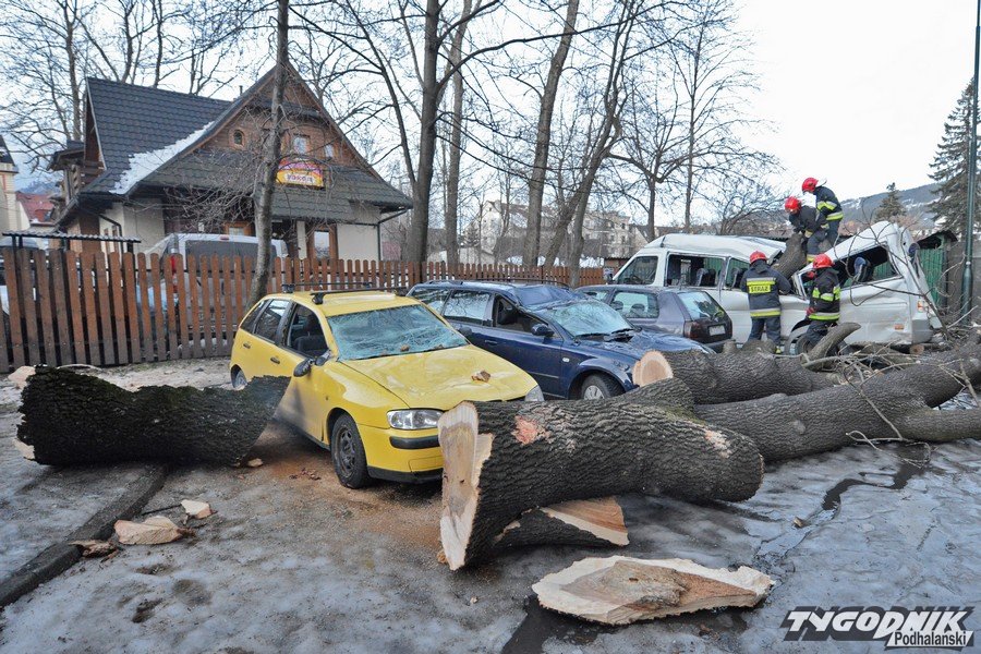 Godz. 16.33 Oto garść najnowszych informacji: Halny na szczęści trochę osłabł, ale strażacy wciąż mają pełno pracy. Na ul. Makuszyńskiego na samochód zawaliła się parkingowa świata. Wciąż padają drzewa w Kościelisku Sobiczkowej, na Nędzy Kubińca i Zakopanem na Krzeptówkach