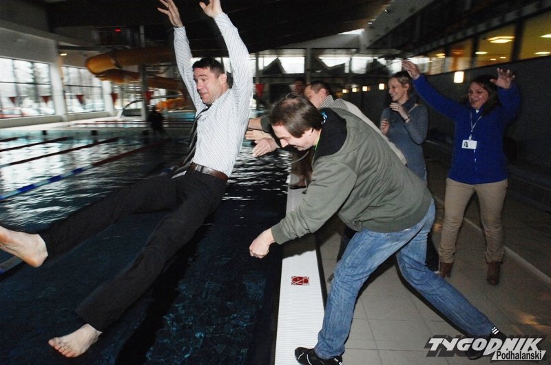 Dziś punktualnie o godz. 8 otwarta została miejska pływalnia przy pl. Evry. Kilkanaście minut później Bartosz Ścisłowicz - dyrektor Miejskiego Centrum Sportu i Rekreacji, jak na gospodarza obiektu przystało, wleciał do wody w koszuli, spodniach i krawacie.