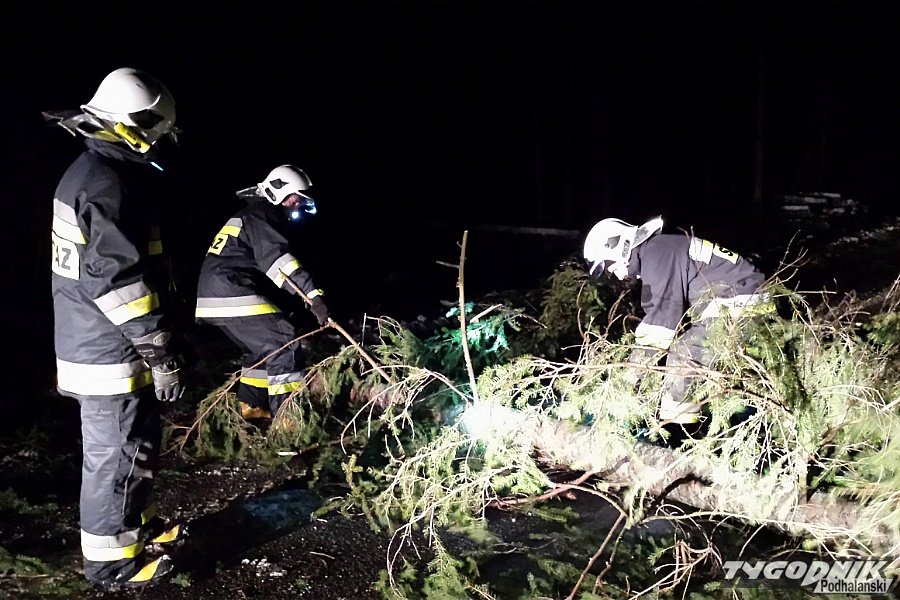 Na drodze z Zakopanego w stronę Łysej Polany drzewo spadło na jadący samochód. Strażacy usuwają kolejne powalone w tym rejonie drzewa.