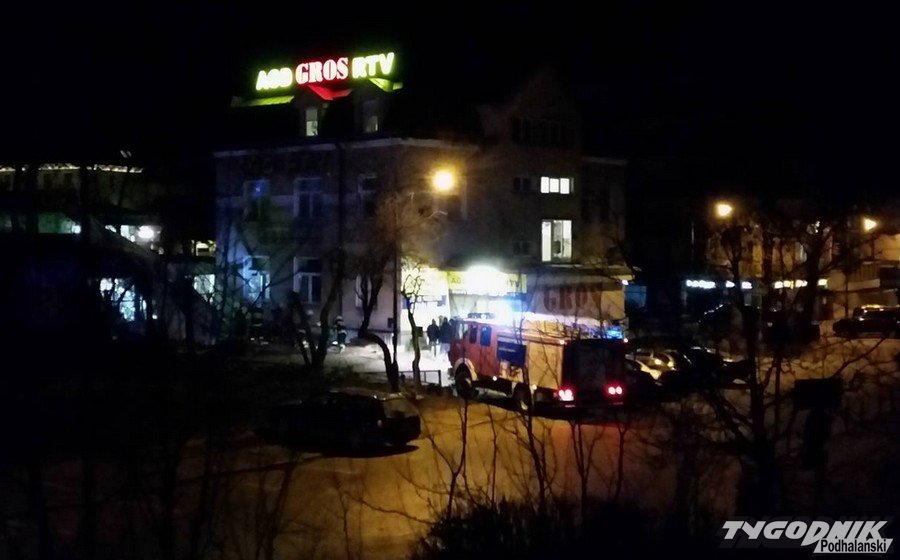 Godz. 00:29 Powalone rusztowanie na sklepie Gros przy ul. Zborowskiego