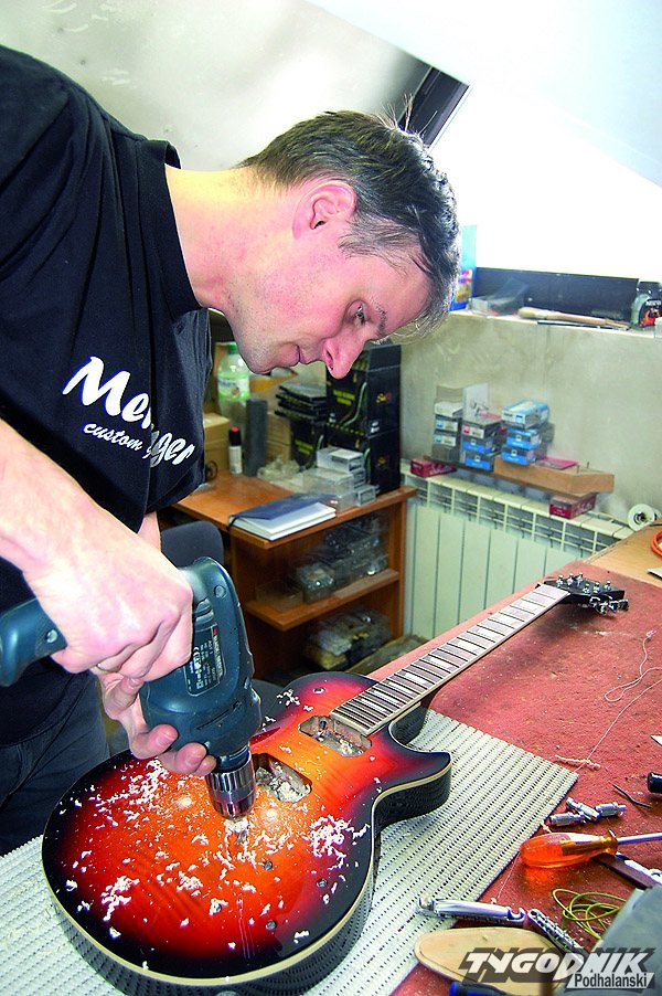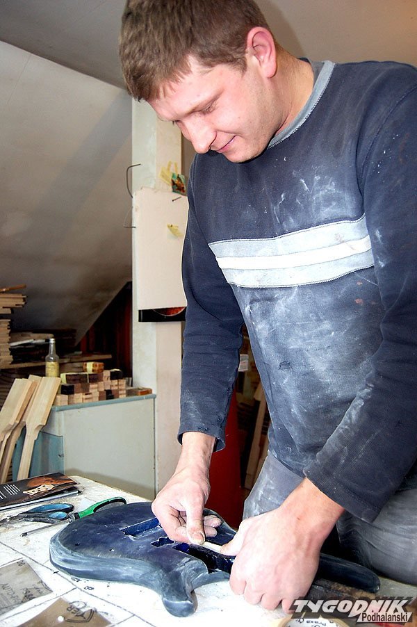 Marcin Kaleta pokazuje mi już gotowe gitary. – Nieraz zamawiający gitary przyjeżdżają do nas i obserwują proces powstawania ich przyszłego instrumentu muzycznego. Robimy także zdjęcia po każdym etapie i wysyłamy listem elektronicznym – mówi Marcin Kaleta. Oglądam razem z nim kilka gitar, na których widnieją ozdoby z macicy perłowej. – Kiedyś klient uczestniczył w procesie obrabiania szyjki. Cały czas sprawdzał jej długość i szerokość, przykładając sobie ją do swojej ręki. Za którymś razem orzekł, że pasuje znakomicie – wspomina lutnik.