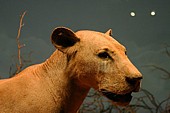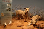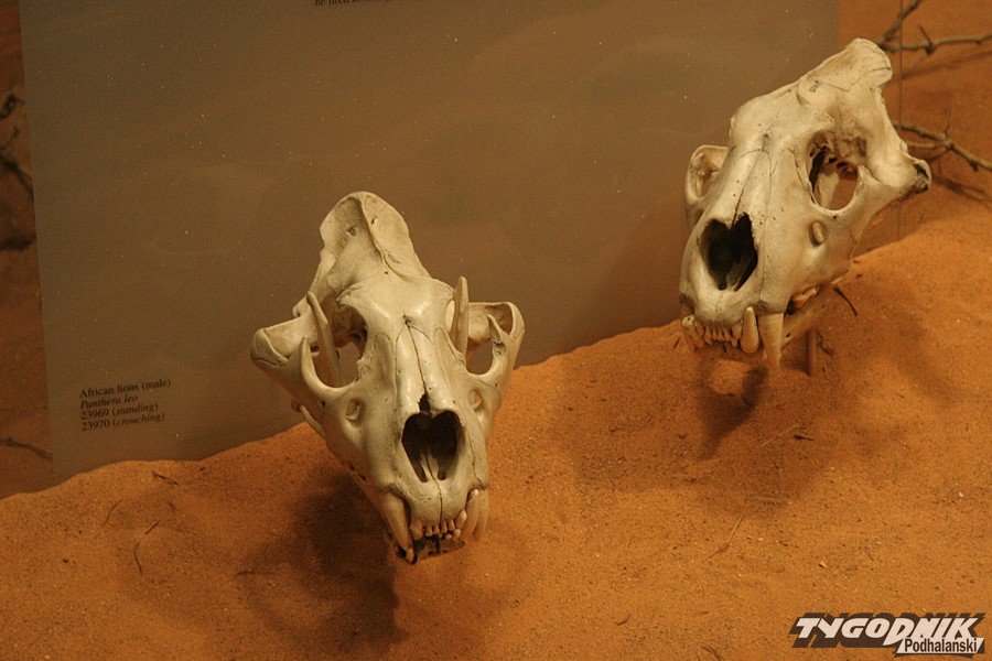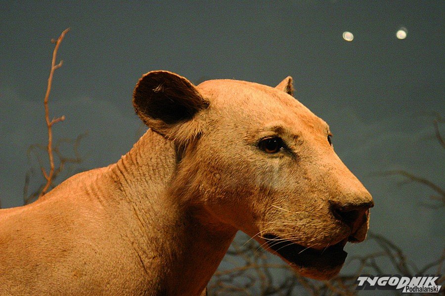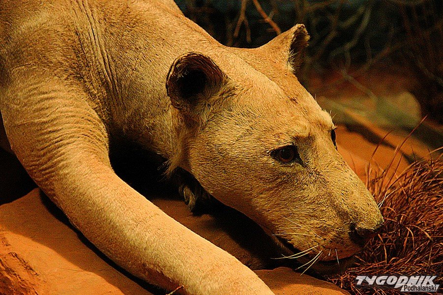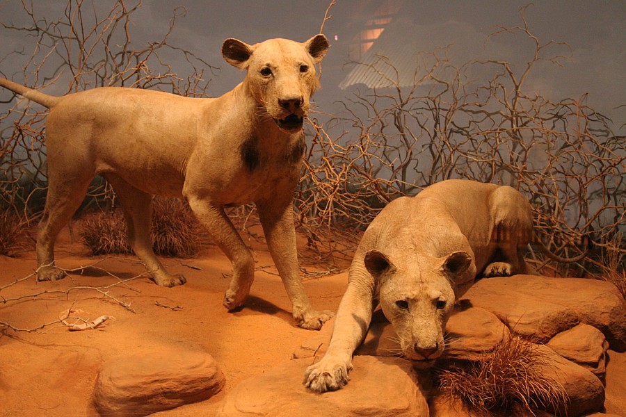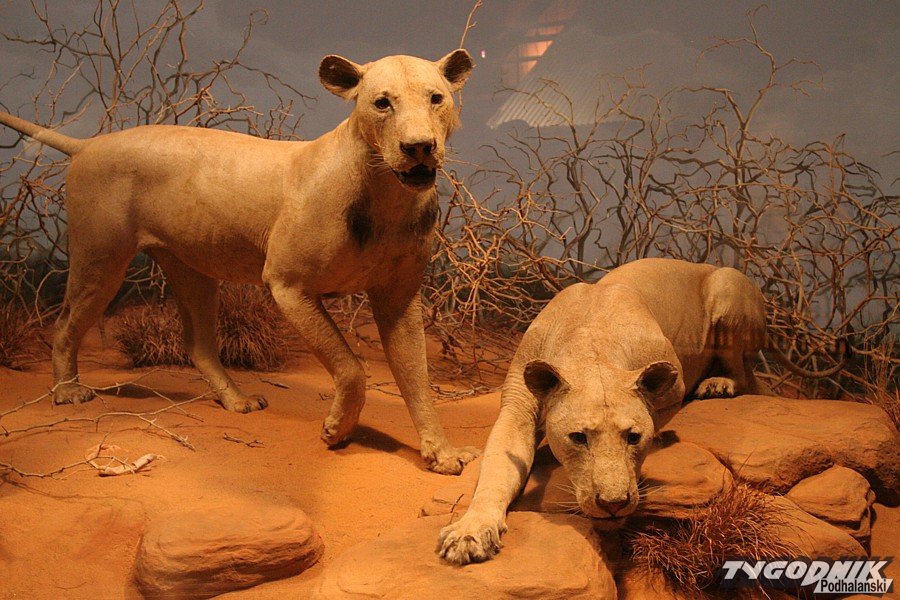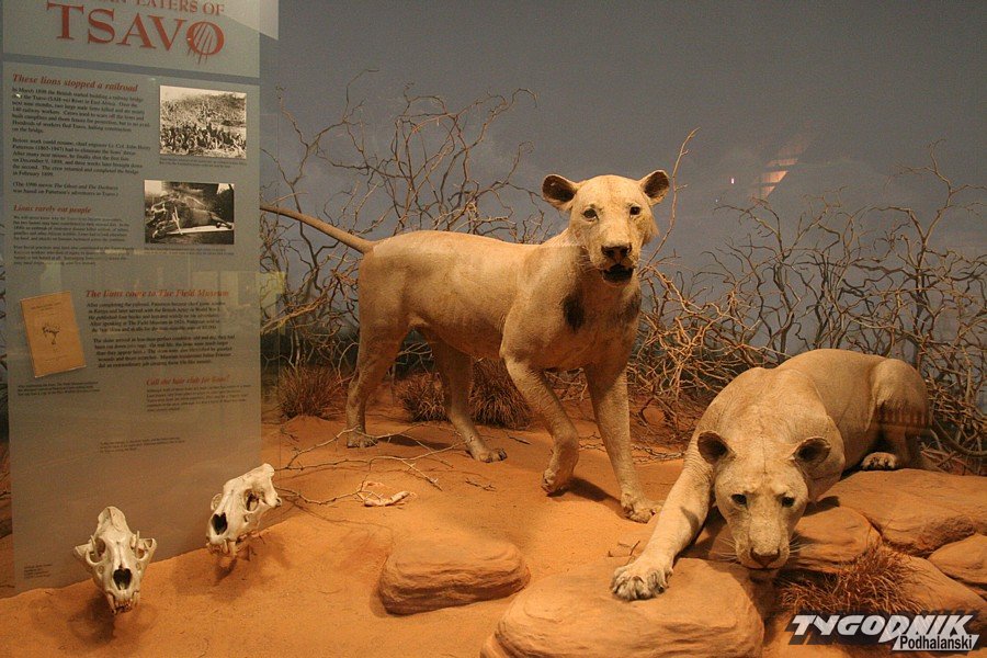 Długi korytarz otoczony gablotami, z których łypią szklanymi oczami smoki z Comodos, krokodyle, aligatory, pytony, prowadzi do obszernej zaciemnionej sali. Kolejna tabliczka nie pozostawia złudzeń: „The Man-eaters of Tsavo”. Ludojady są jasno-płowe i wcale nie sprawiają upiornego wrażenia. W ogóle nie wyglądają jak dumne lwy – królowie zwierząt. Brak im podstawowego atrybutu – bujnej grzywy. Brak owłosienia to charakterystyczna cecha populacji lwów żyjących nad Tsavo. Dumne ludojady nie różnią się zbytnio od lwic, w dodatku nie imponują rozmiarami. Eksperci twierdzą, że za życia prezentowały się bardziej okazale. Henry Patterson kazał przerobić straszne bestie na dywaniki. Przy okazji brzuszna, mniej cenna część obu futer została nieco uszczuplona, nie pozostawiając zbyt wiele możliwości preparatorowi. Aż nazbyt groźnie prezentują się z kolei eksponowane tuż obok oryginalne czaszki ludojadów. Zgryz jednego z lwów jest wyraźnie zdeformowany. Jak przypuszczają naukowcy, właśnie ten feler i związane z nim kłopoty w zdobywaniu normalnego pożywienia mogły być główną przyczyną tego, że koty znad Tsavo zeszły na złą drogę, zostały ludojadami. A później wyemigrowały za Wielką Wodę, by zrobić oszałamiającą karierę w iście hollywoodzkim stylu.