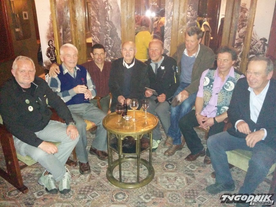 Takiego grona dawno w Zakopanem nie było w jednym czasie. Po premierze "Zakopiańczyków". Od lewej: Jerzy Porębski, Ryszard Szafirski, Piotr Konopka, prof. dr hab. Lech Korniszewski, Maciej Pawlikowski, dr Roman Mazik, Jacek Berbeka, Ryszard Gajewski (brakuje występujących w filmie: Ewy Dyakowskiej- Berbeki, Jaśka Berbeki, Krzysztofa Oleksowicza, Andrzeja Osiki, Włodka Stoińskiego).