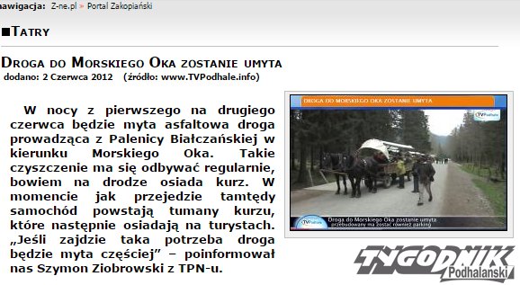 " Tysiące turystów, jakie w tym roku, szczególnie latem przechodziły tamtędy, fasiągi, liczne samochody zrobiły swoje. Na 9-kilometrowym odcinku drogi z Palenicy Białczańskiej do schroniska w Morskim Oku jest zwyczajnie brudno. A raczej było, bowiem wczoraj TPN zlecił firmie Tesko zamiecenie i umycie asfaltu, przede wszystkich z gromadzącego się na nim kurzu oraz igliwia.