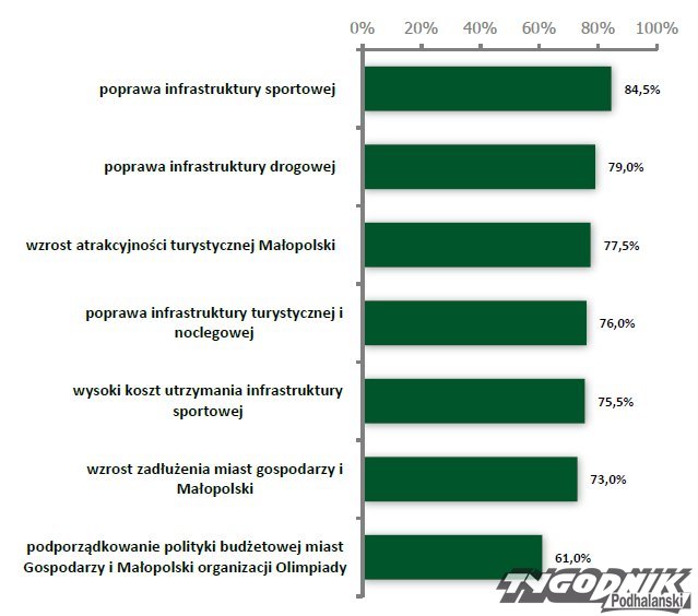 Pytani najczęściej deklarowali, że w związku z organizacją Olimpiady Zimowej w Małopolsce i na Słowacji poprawiłaby się infrastruktura sportowa. Tego zdania było 84,5% pytanych. Blisko ośmiu na dziesięciu pytanych oświadczyło również, że spodziewałoby się poprawy infrastruktury drogowej (79%). Niewielu mniej pytanych w związku z organizacją Zimowych Igrzysk spodziewa się wzrostu atrakcyjności turystycznej Małopolski oraz poprawy infrastruktury turystycznej i noclegowej (odpowiednio 77,5% oraz 76%).