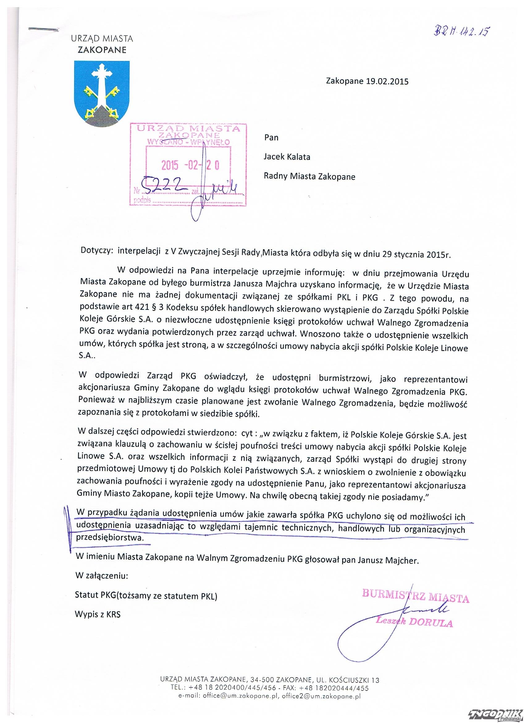 Na większość zadanych pytań niestety nie otrzymałem informacji , ponieważ Miasto Zakopane jako współwłaściciel PKG nie ma do tego prawa ??