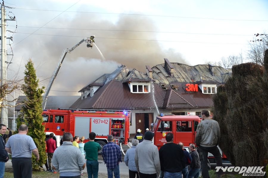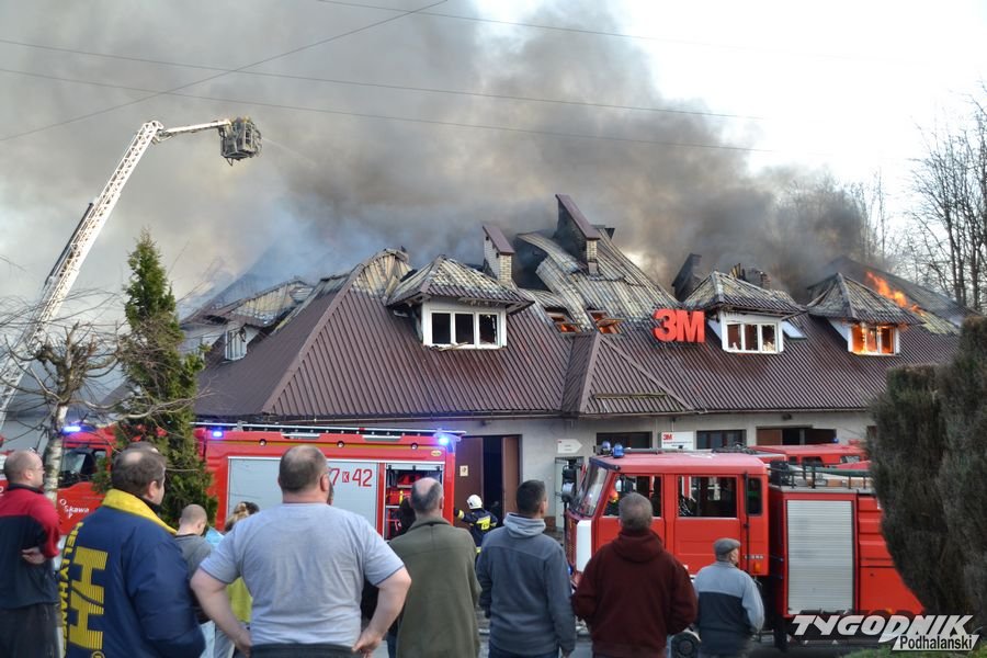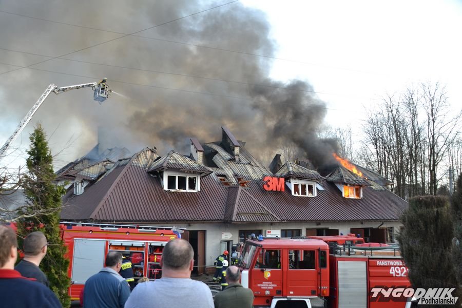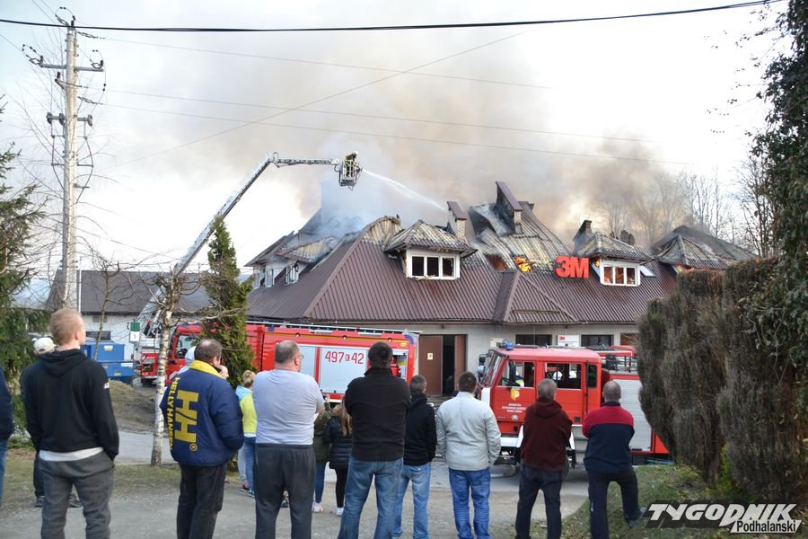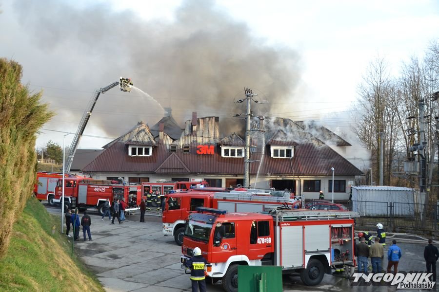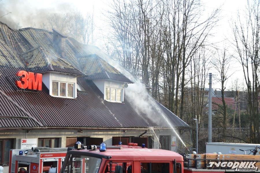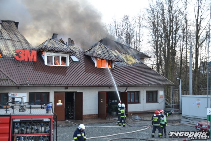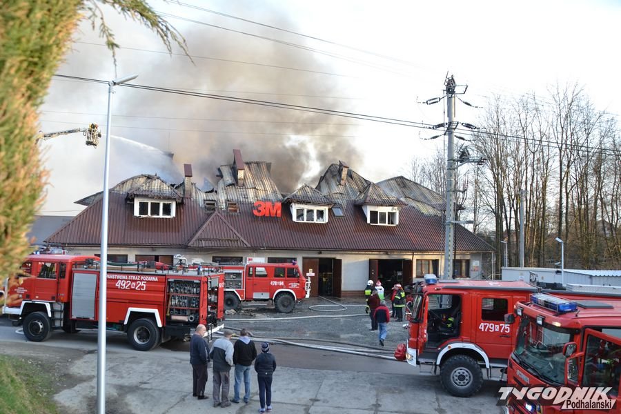 Przed godz. 16.00 wybuchł pożar fabryki 3M. Znajduje się ona w pobliżu skrzyżowania ze światłami w Skomielnej. Z budynku zaczęły unosić się kłęby dymu, z dachu wydobywały się płomienie. Na miejsce przyjechały strażackie zastępy z różnych miejscowości. W ogniu stanął budynek, w którym na dole była hala produkcyjna, a na górze biura. W pewnym momencie zaczęło brakować wody i strażacy czekali aż dowiezie ją cysterna.