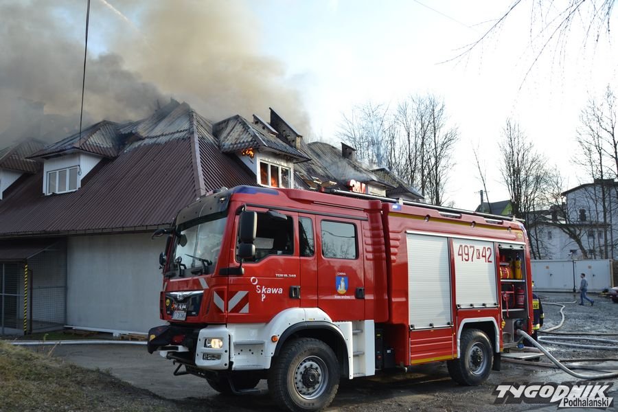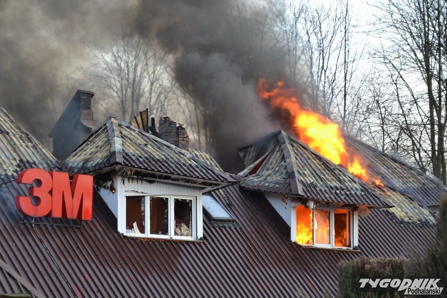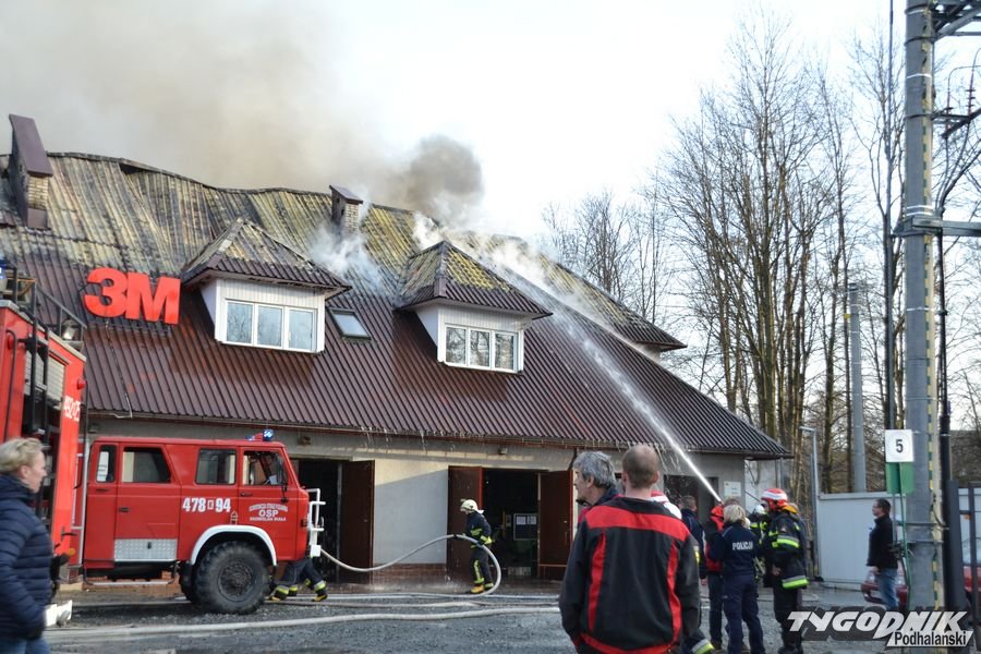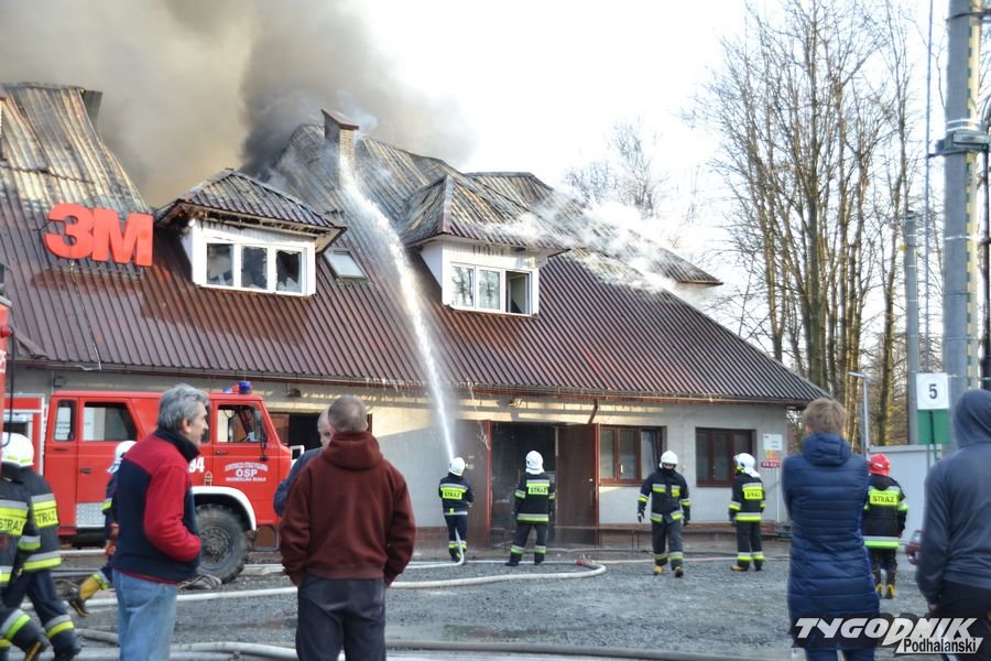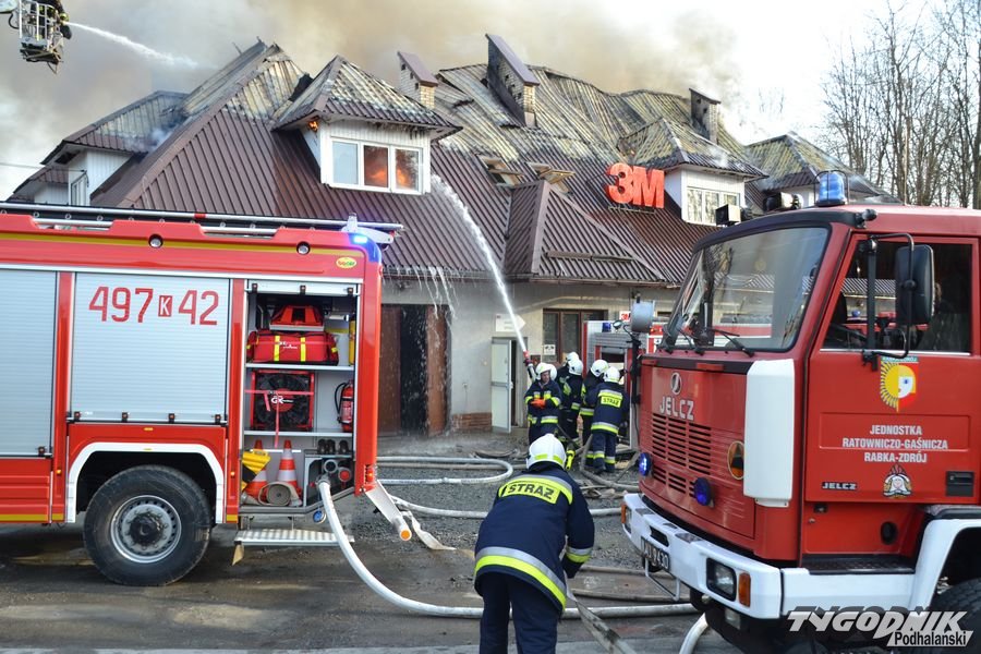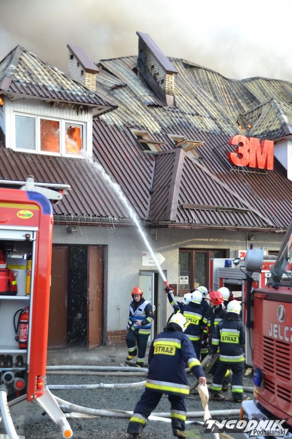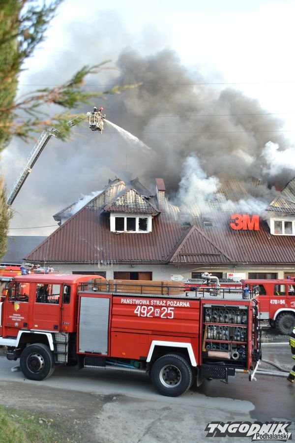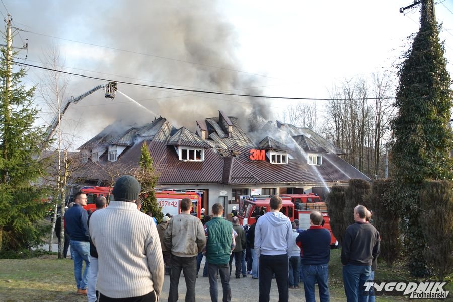 Przed godz. 16.00 wybuchł pożar fabryki 3M. Znajduje się ona w pobliżu skrzyżowania ze światłami w Skomielnej. Z budynku zaczęły unosić się kłęby dymu, z dachu wydobywały się płomienie. Na miejsce przyjechały strażackie zastępy z różnych miejscowości. W ogniu stanął budynek, w którym na dole była hala produkcyjna, a na górze biura. W pewnym momencie zaczęło brakować wody i strażacy czekali aż dowiezie ją cysterna.
