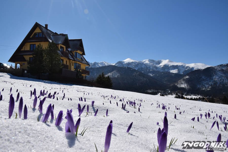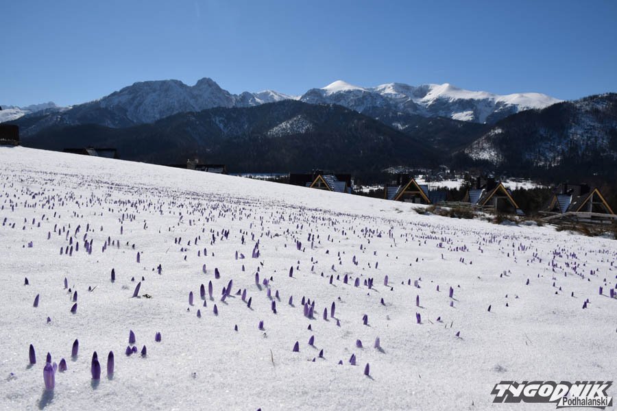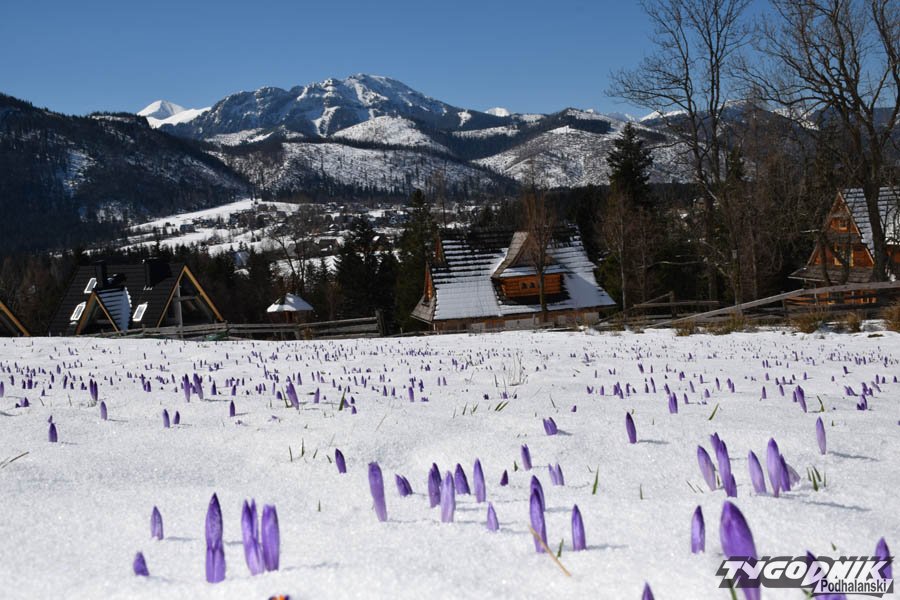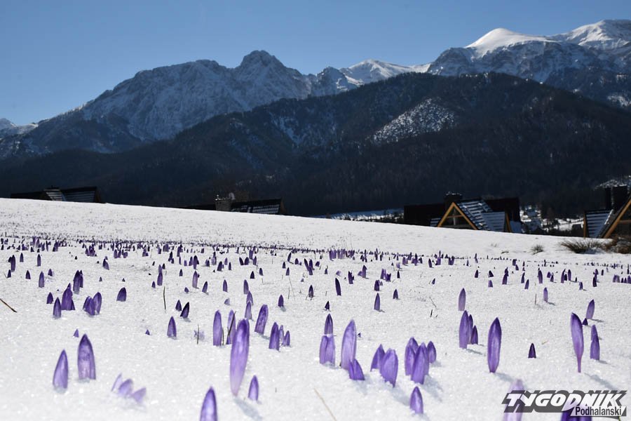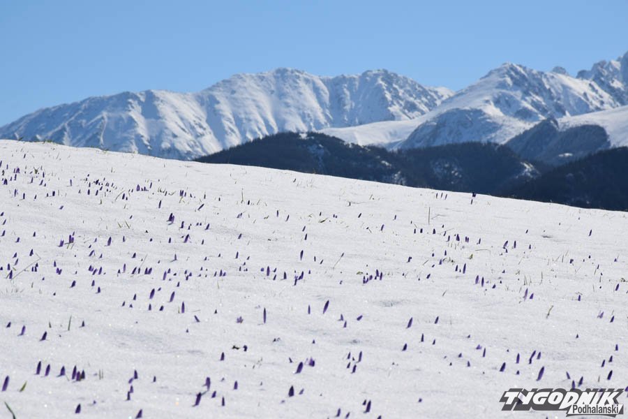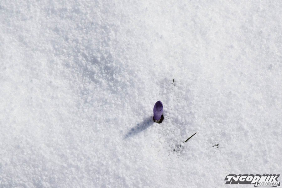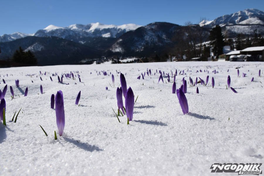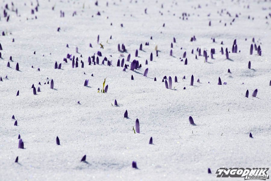 Dziś rano na podhalańskich łąkach zalegała cienka warstwa zmrożonego śniegu. Chwycił mróz, ale przysypane krokusy nie dają za wygraną. Wystarczy, że wyszło słońce, zrobiło się trochę cieplej, a łąki odzyskują swój fioletowy kolor.