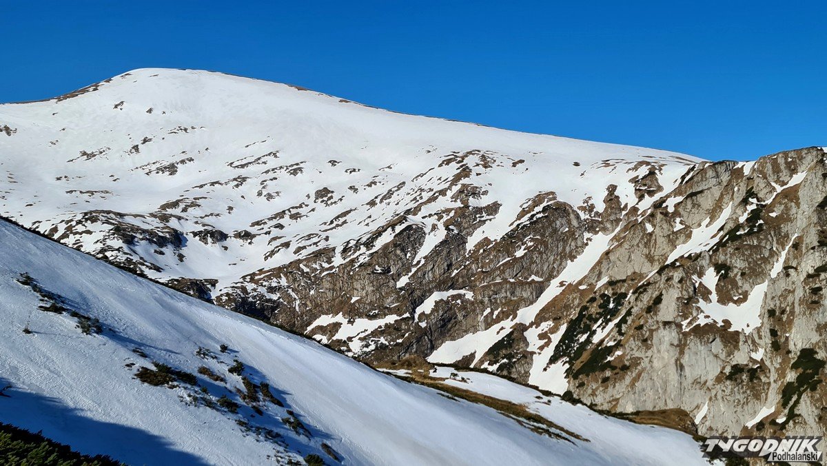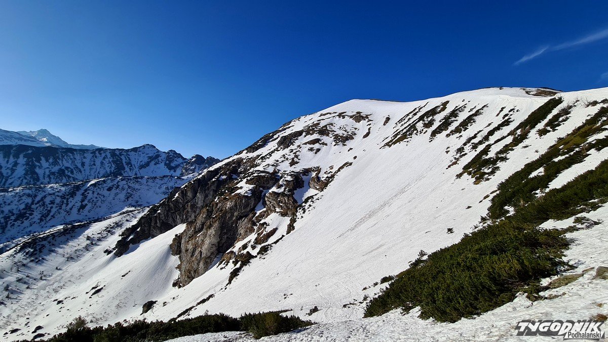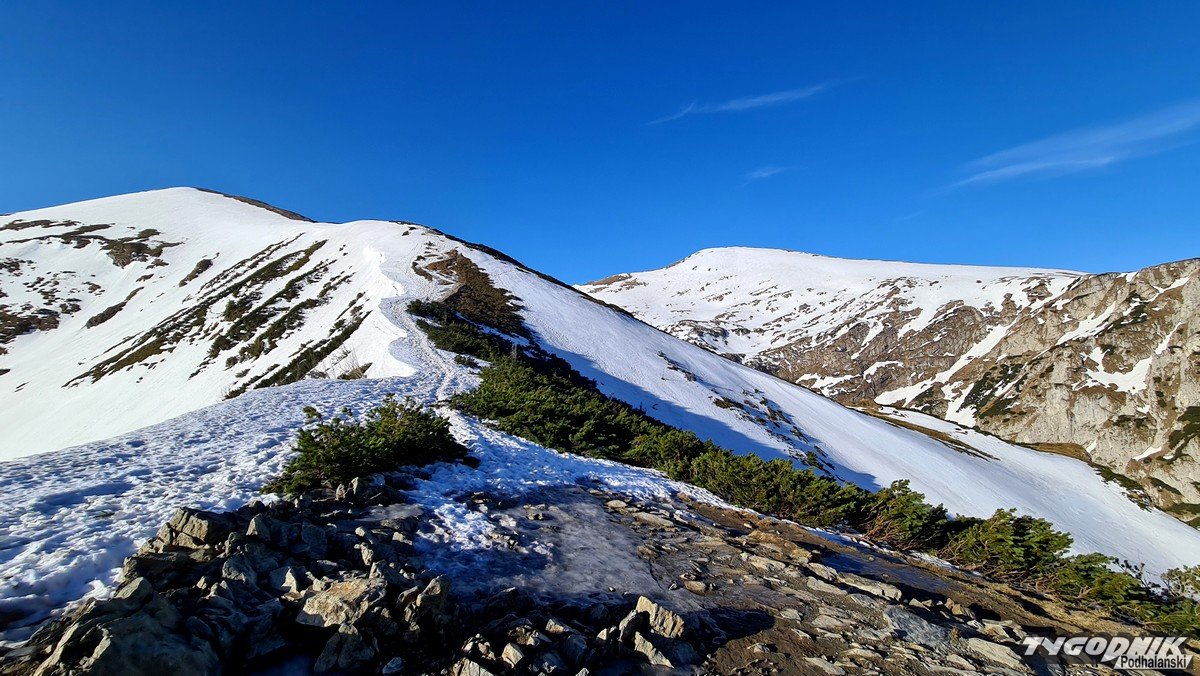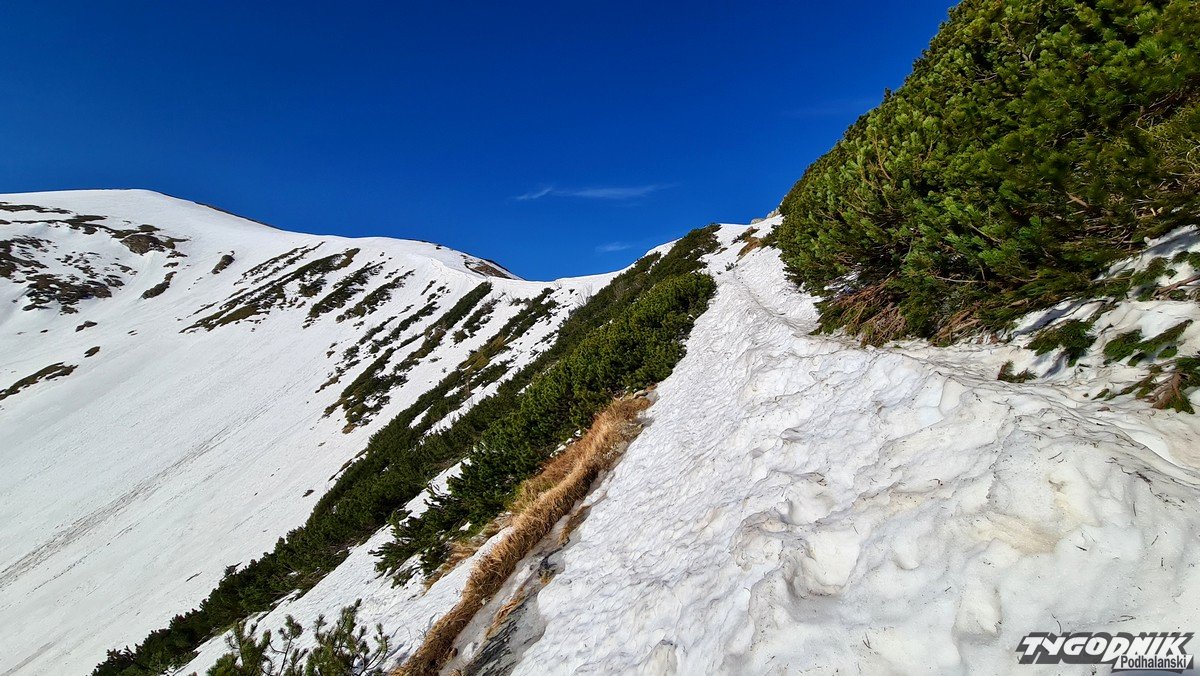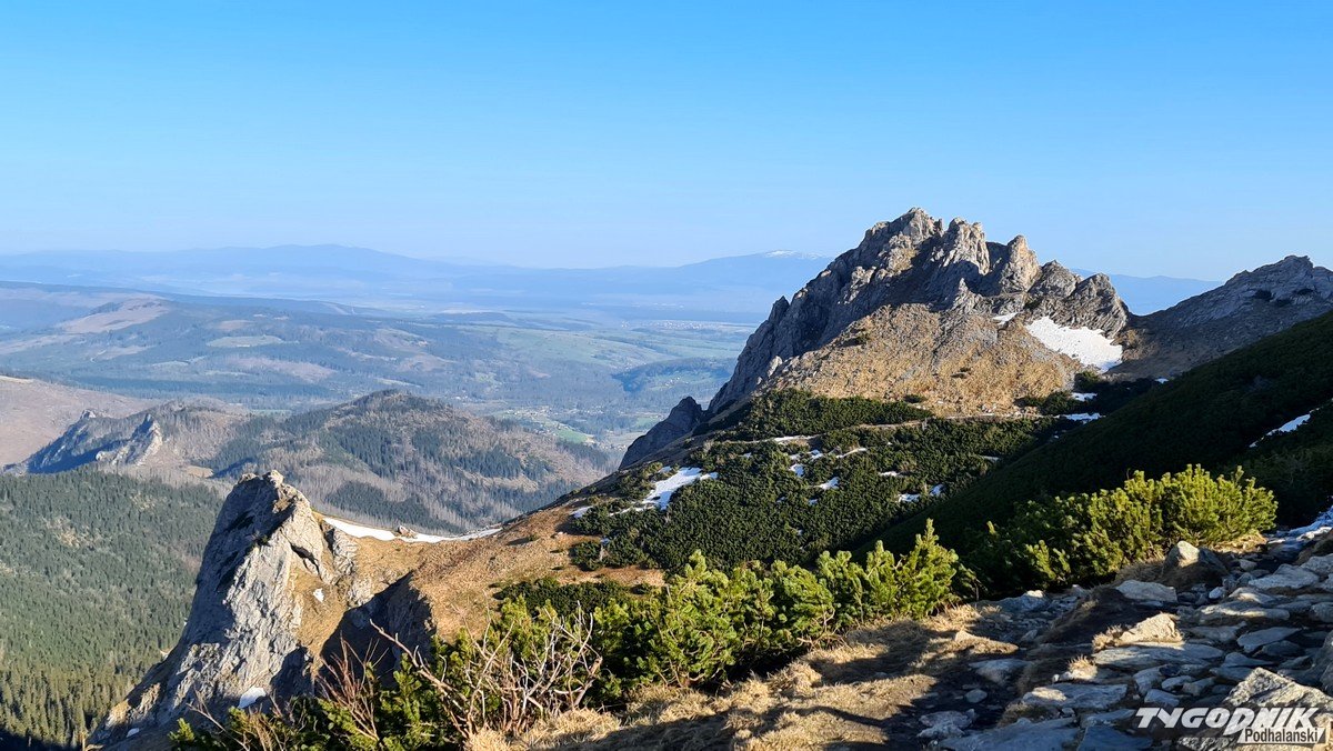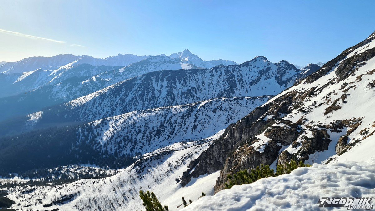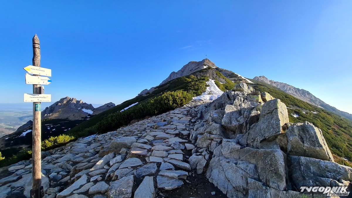 Panoramy z Przełęczy Kondrackiej (1725 metrów n. p. m.) oddzielającej Giewont od Kopy Kondrackiej zawsze zapadają w pamięć. Tym bardziej w takim słonecznym dniu. Na szlaku tymczasem coraz mniej śniegu, ale wcześnie rano na trasie poniżej Hali Kondratowej trzeba się liczyć z zalodzonymi odcinkami.