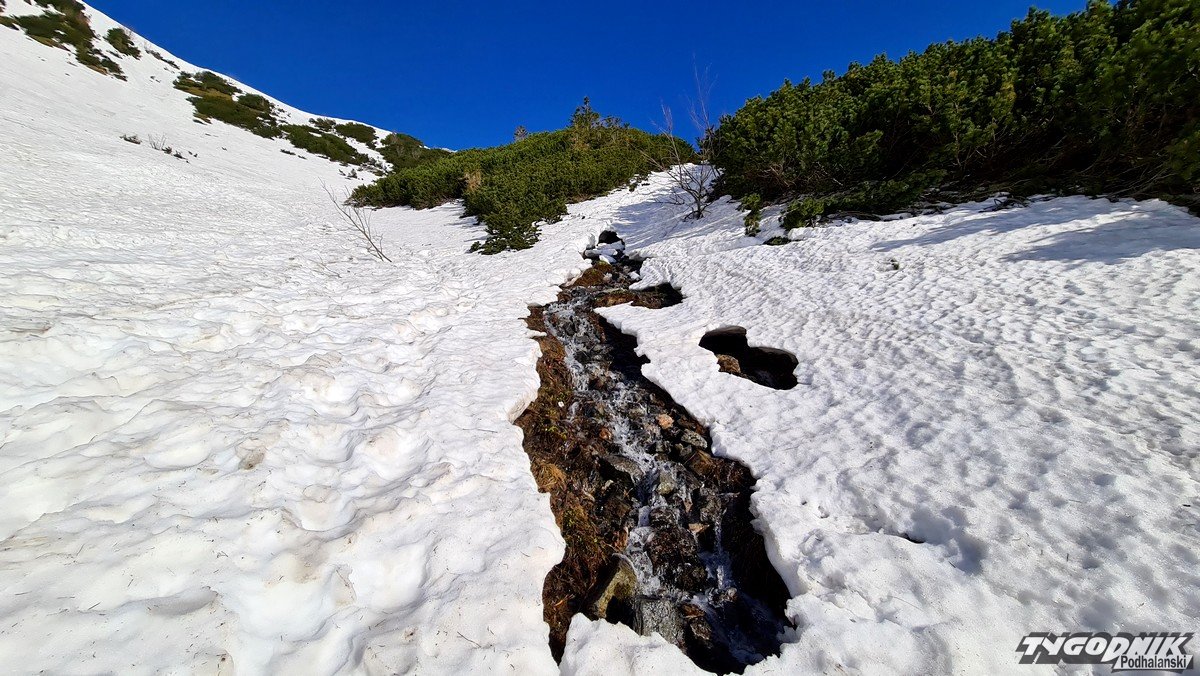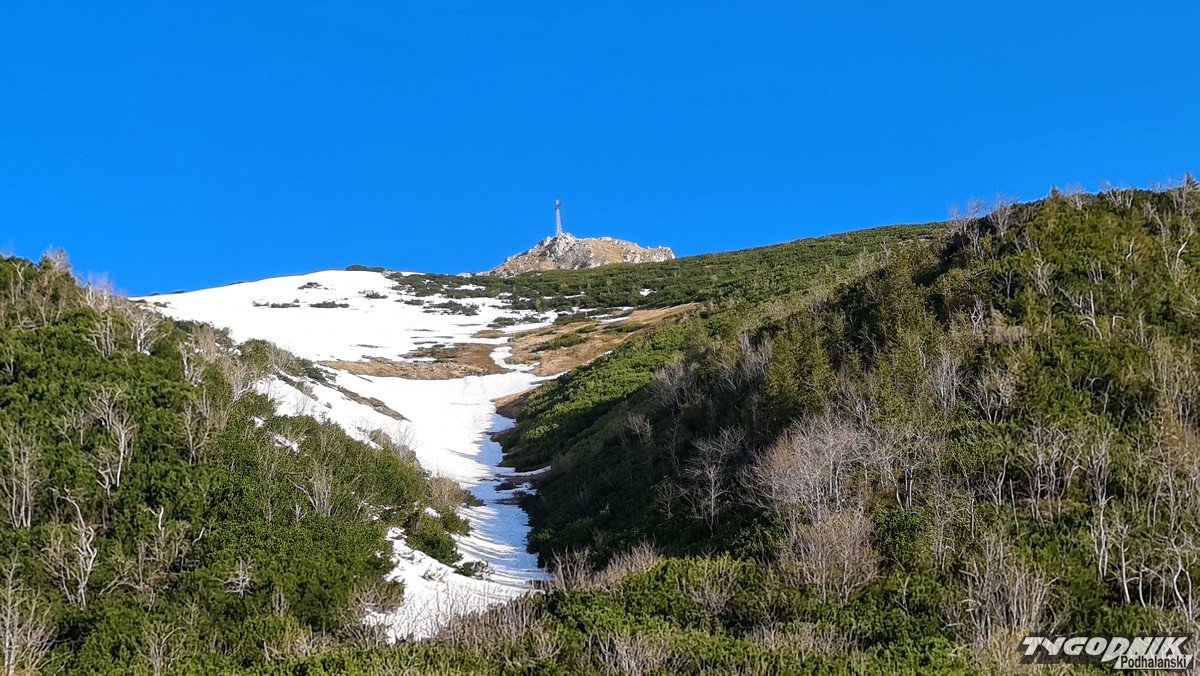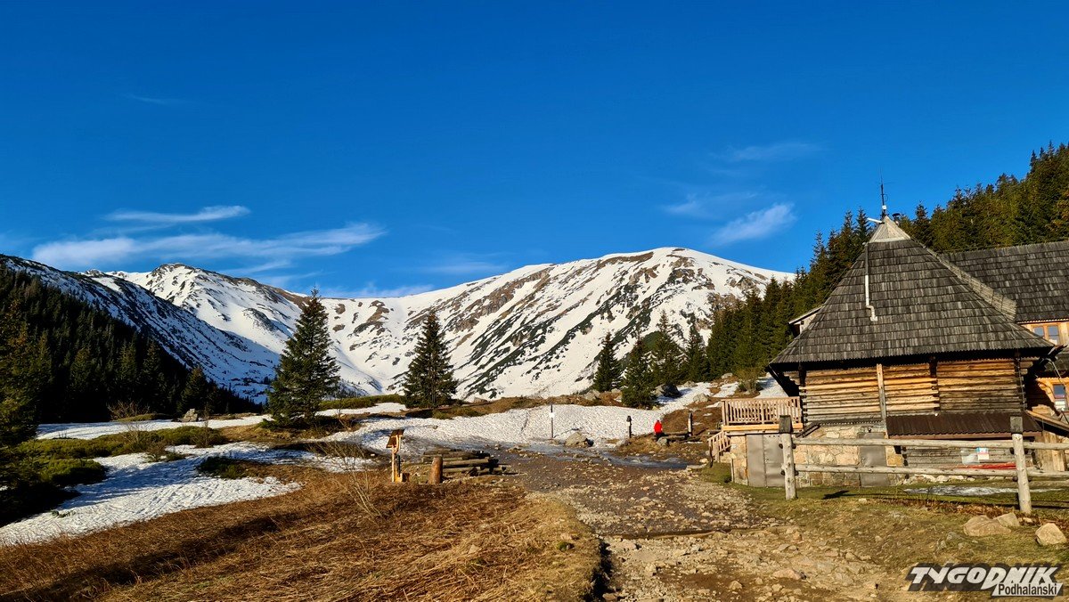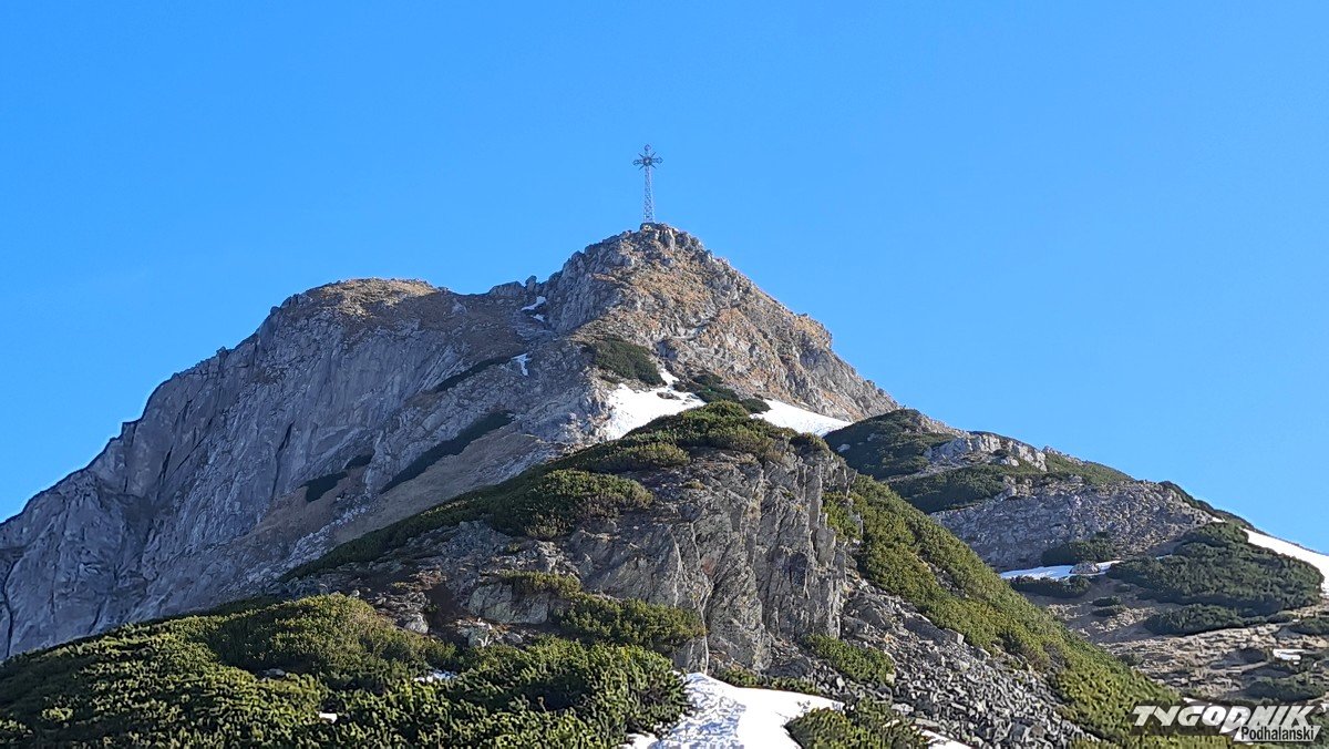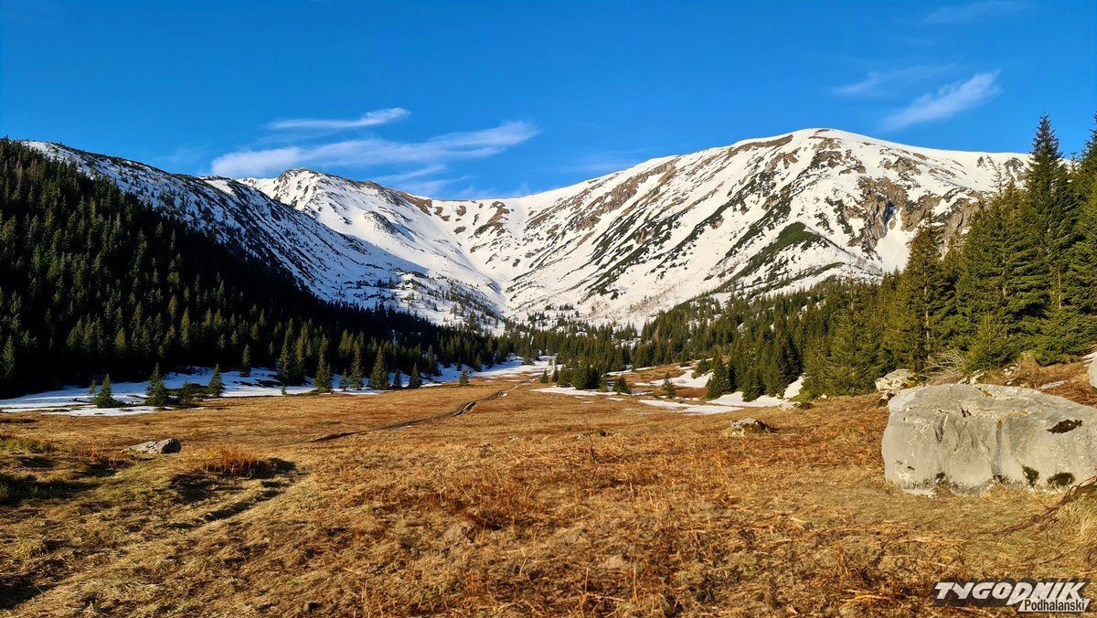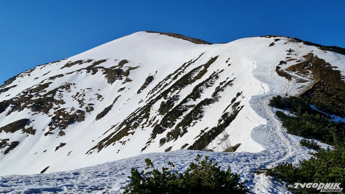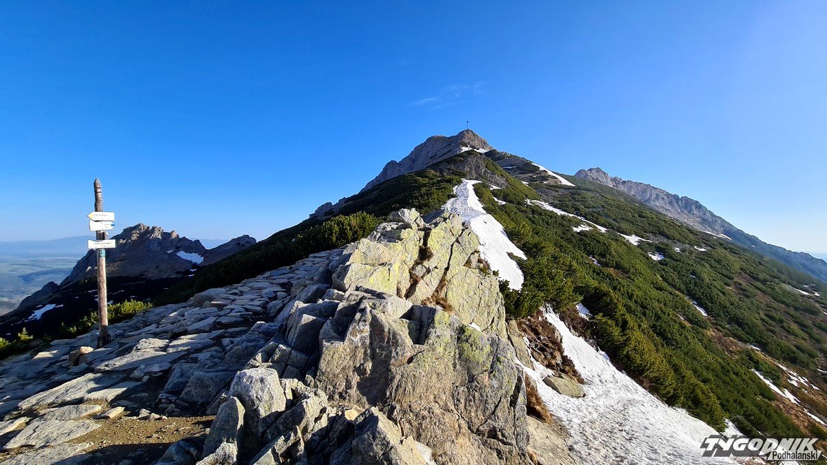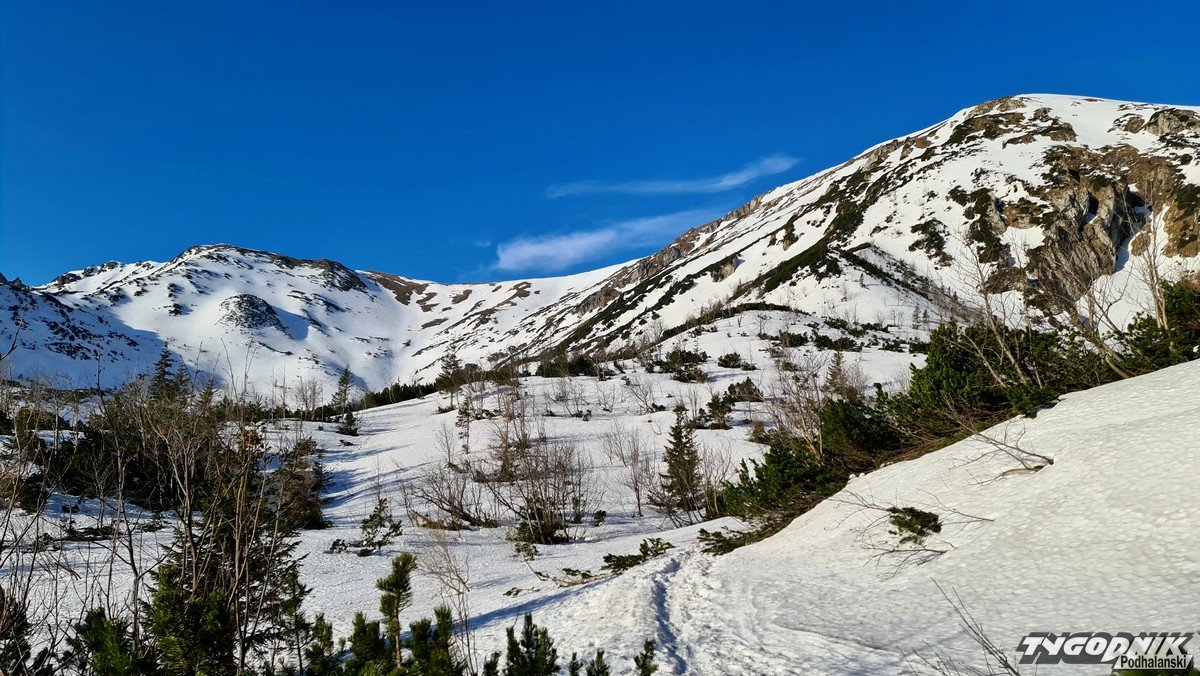 Panoramy z Przełęczy Kondrackiej (1725 metrów n. p. m.) oddzielającej Giewont od Kopy Kondrackiej zawsze zapadają w pamięć. Tym bardziej w takim słonecznym dniu. Na szlaku tymczasem coraz mniej śniegu, ale wcześnie rano na trasie poniżej Hali Kondratowej trzeba się liczyć z zalodzonymi odcinkami.
