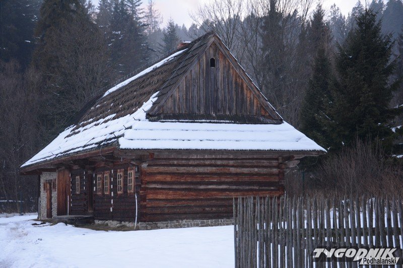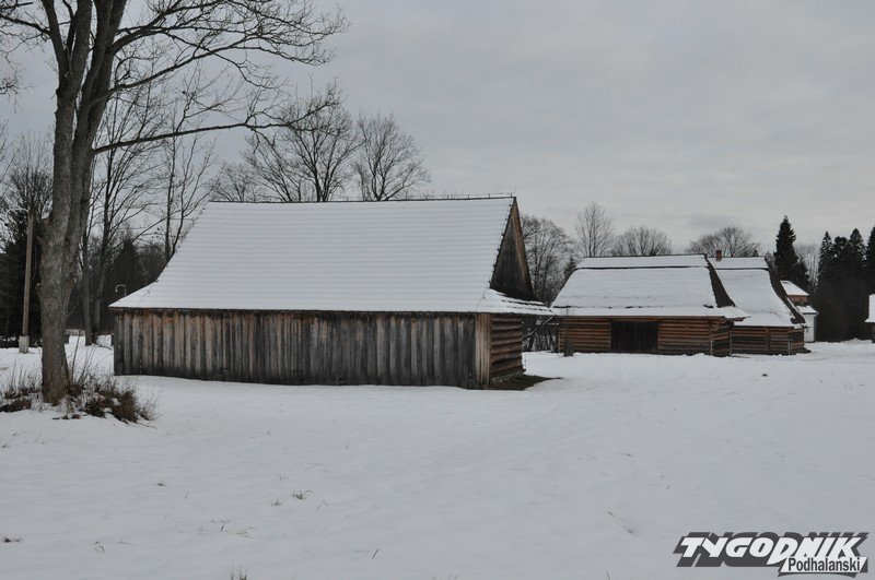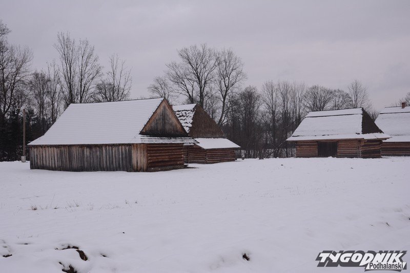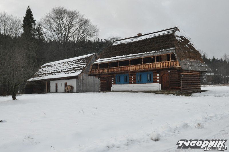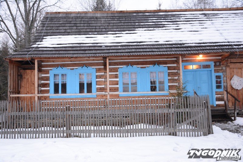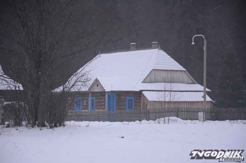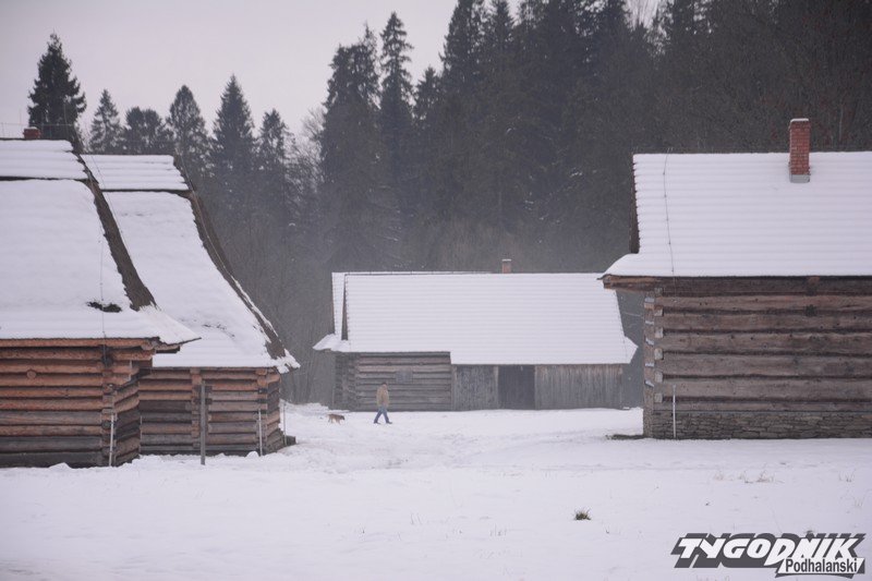 Smutno zrobiło się w Muzeum-Orawskim Parku Etnograficznym w Zubrzycy Górnej. Wszystko przykryte śniegiem. Ale czasem skansen ożywa. Ogień rozpalony w piecu ogrzewa izby.
