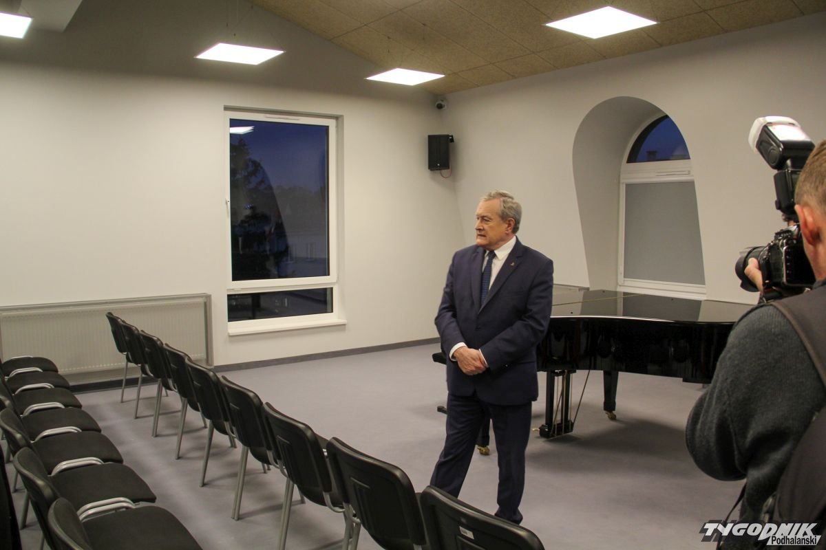 Na przecięciu wstęgi nie zabrakło oficjeli - w poniedziałek w błysku fleszy brakujące skrzydło zostało otwarte, a za przecinanie wstęgi zabrał się minister kultury Piotr Gliński pospołu z koalicyjnymi, lokalnymi politykami. Wnętrza nowej części robią wrażenie. Powstała szklana przewiązka łącząca oba skrzydła na wysokości piętra. Całość pochłonęła blisko 5 mln zł, za które powstało ponad 700 m kw. powierzchni nowej szkoły. Goście mogli zwiedzić pracownie, salę kameralną i zaplecze sali koncertowej, gdzie odbyły się główne uroczystości.
