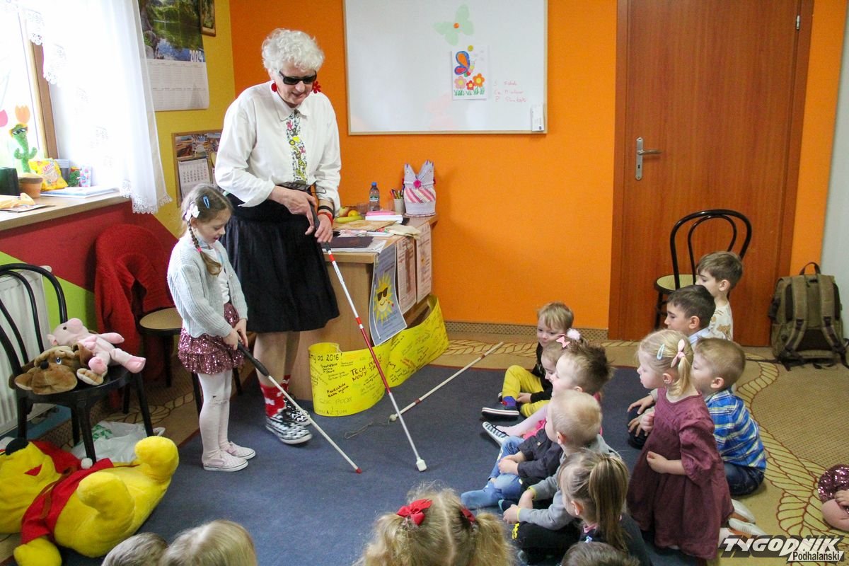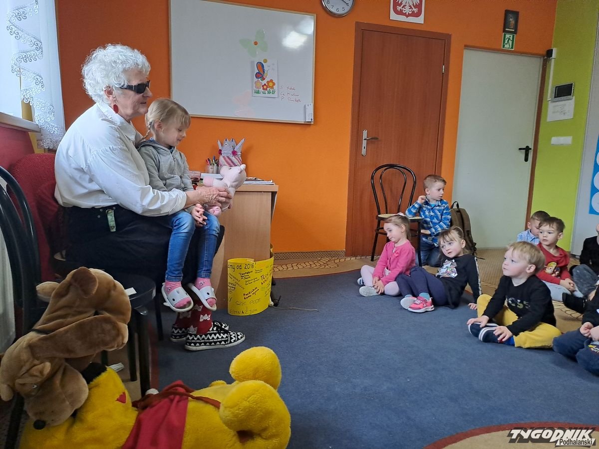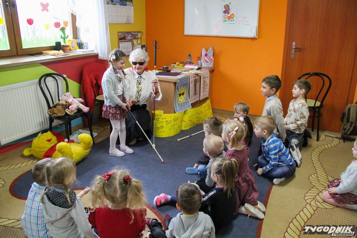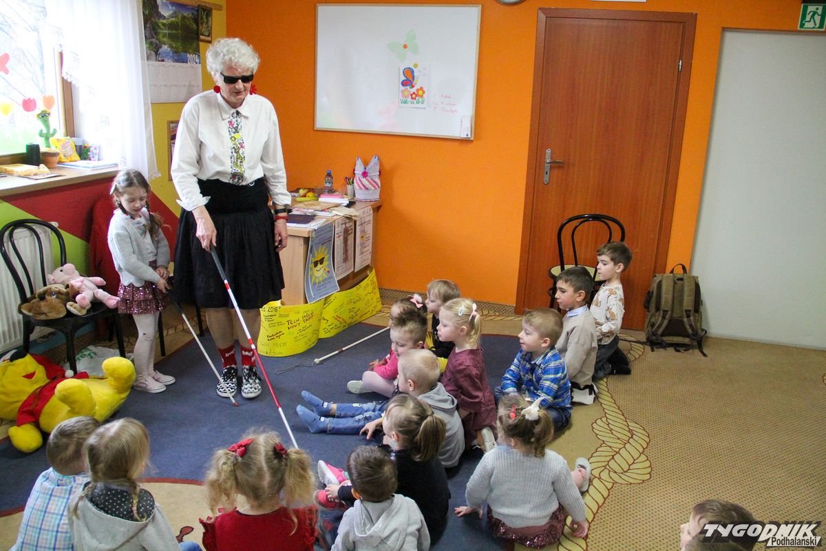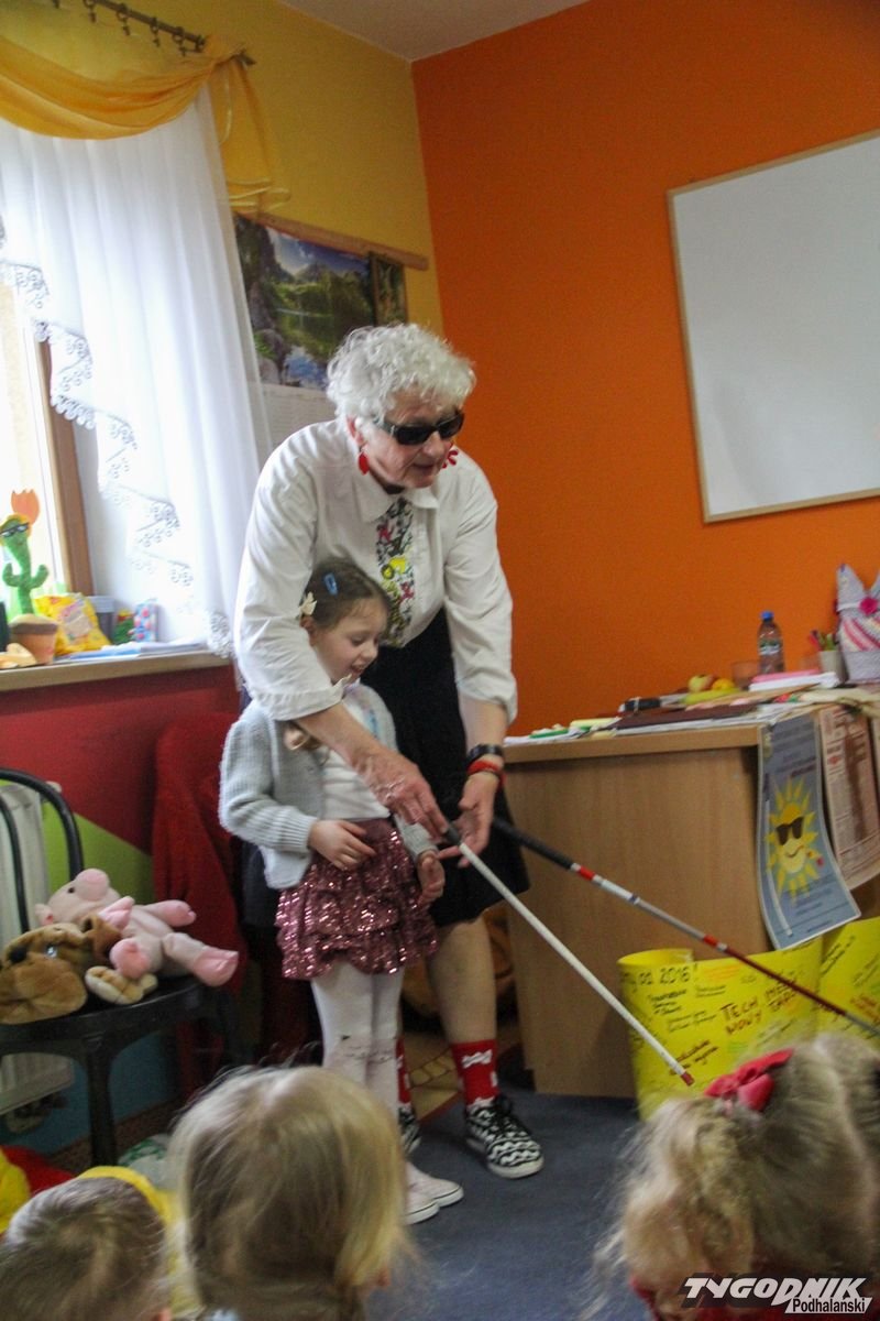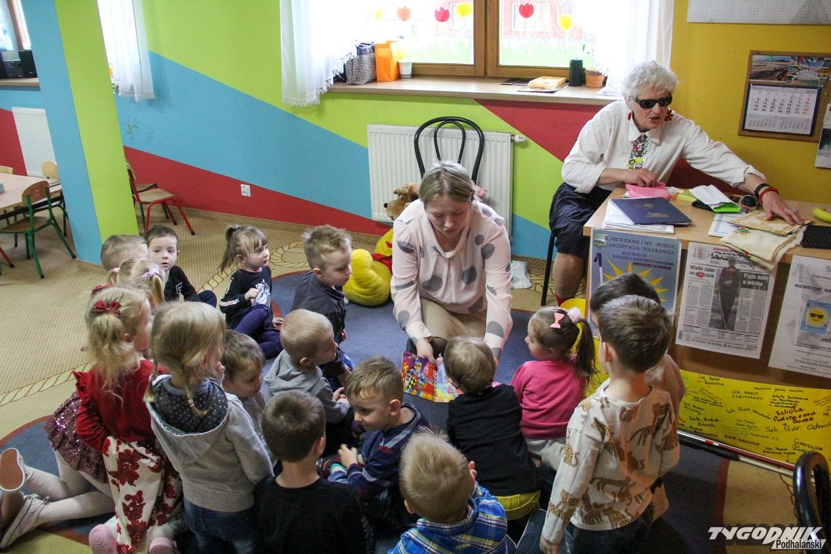 Początkowa rezerwa u maluchów szybko znika, gdy Pani Basia w ciemnych okularach prosi by zaśpiewać piosenkę, a potem siada z nimi na dywanie i opowiada o swoim świecie. Świecie, w którym nie widać nic, trzeba się umieć odnaleźć, a także potrafić prosić o pomoc. I tego jak pomóc niewidomemu uczyła przedszkolaki.