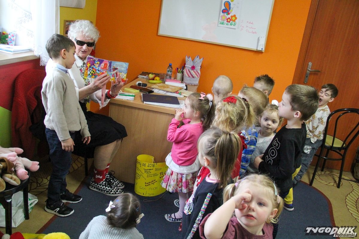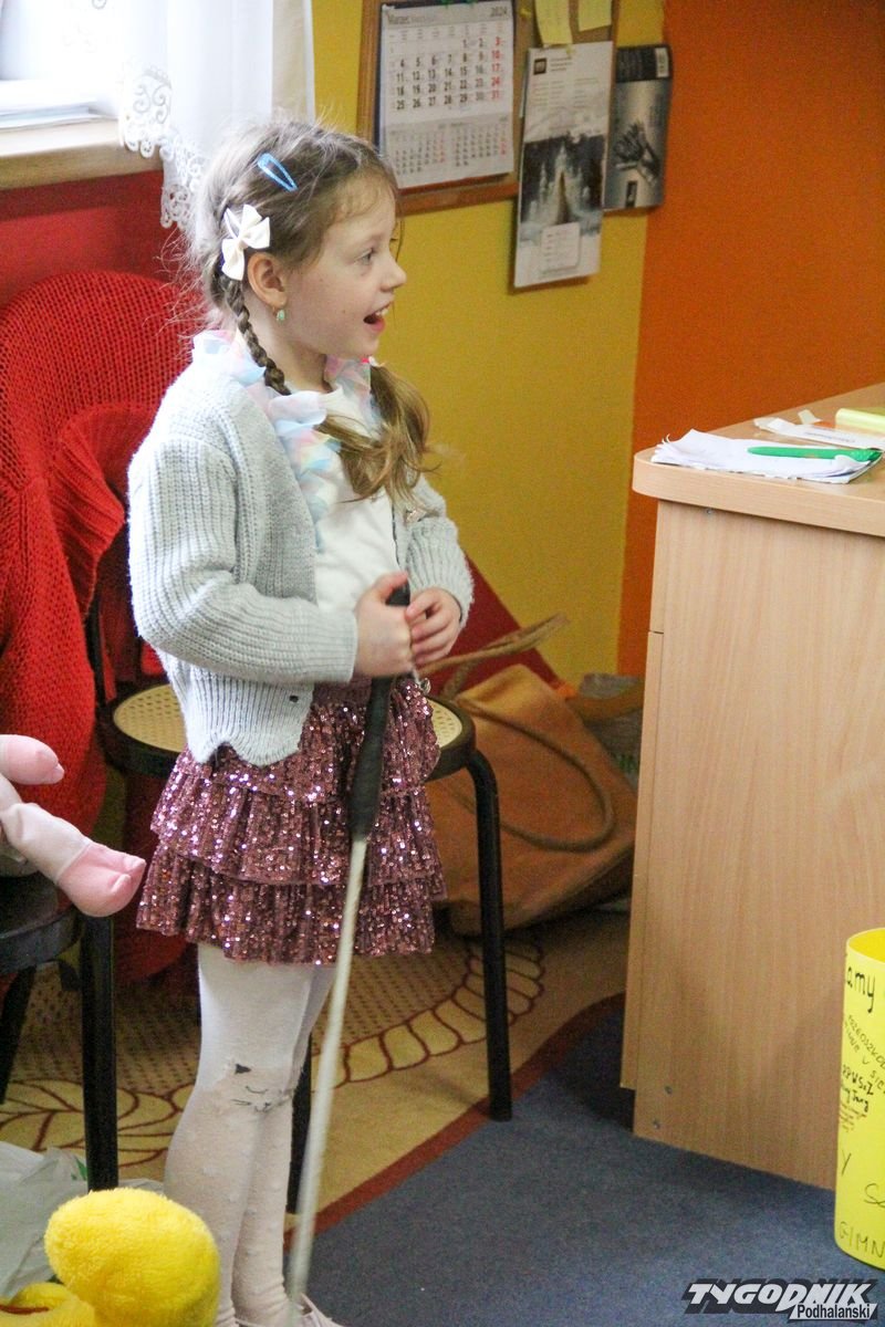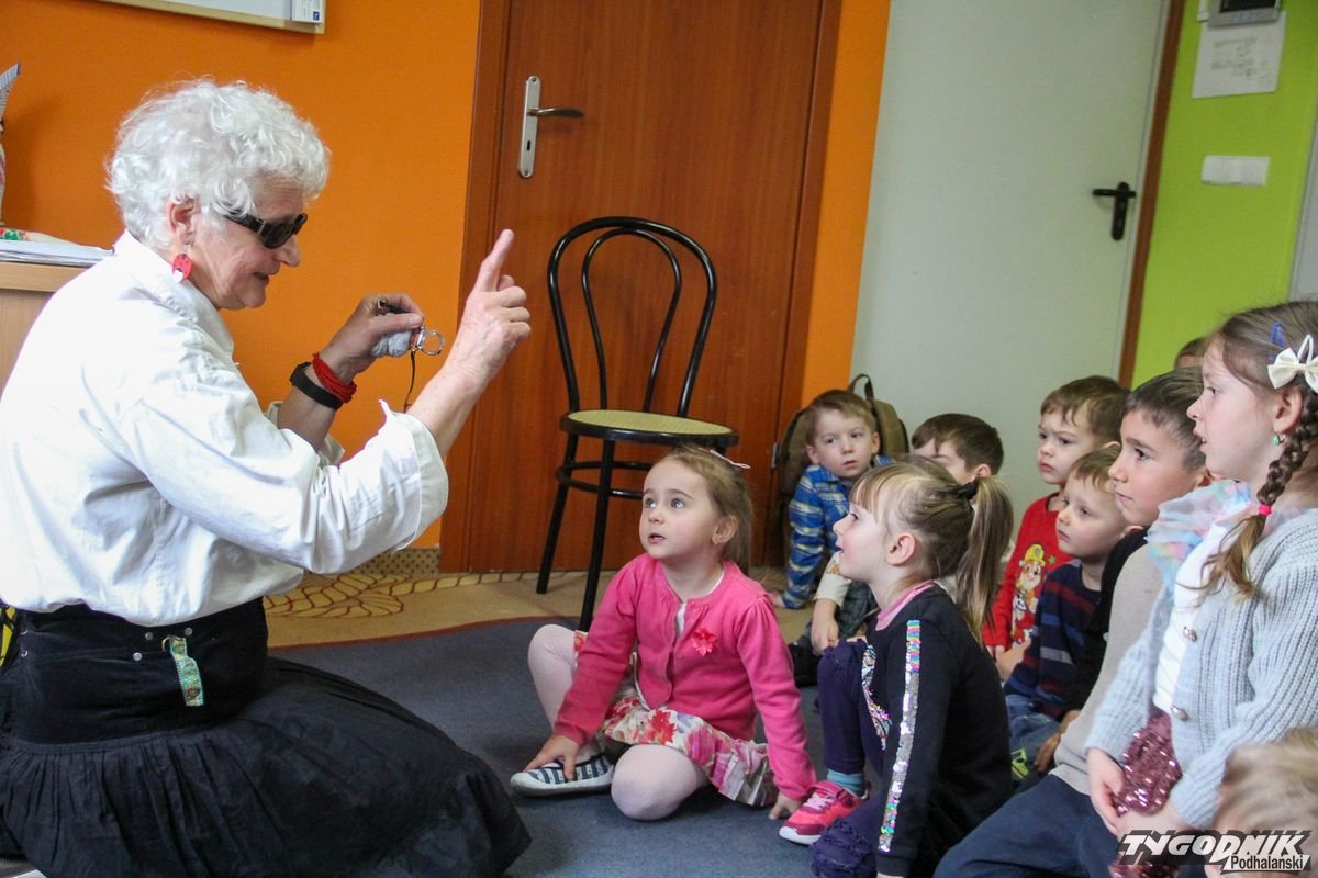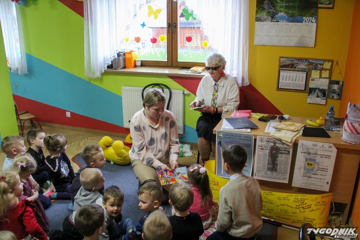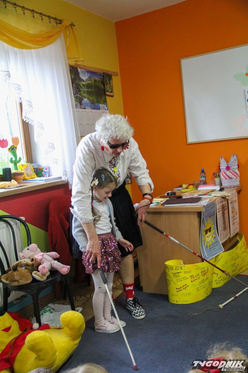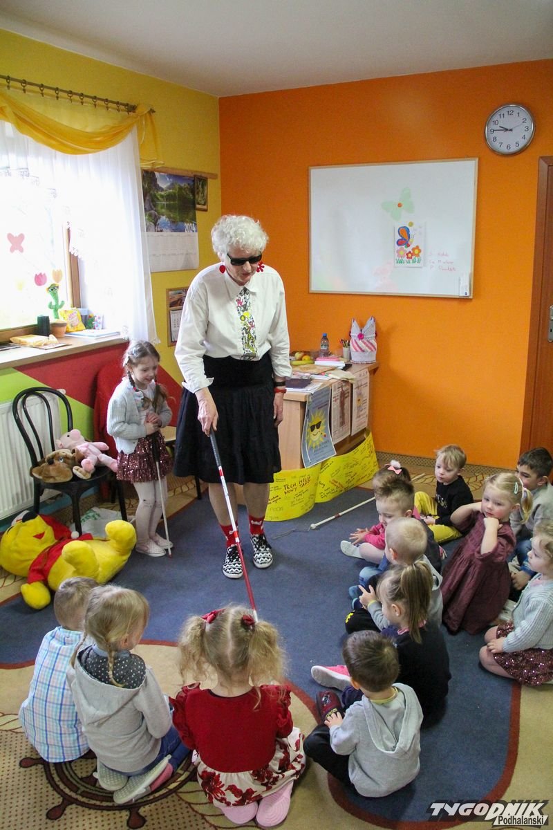 Początkowa rezerwa u maluchów szybko znika, gdy Pani Basia w ciemnych okularach prosi by zaśpiewać piosenkę, a potem siada z nimi na dywanie i opowiada o swoim świecie. Świecie, w którym nie widać nic, trzeba się umieć odnaleźć, a także potrafić prosić o pomoc. I tego jak pomóc niewidomemu uczyła przedszkolaki.