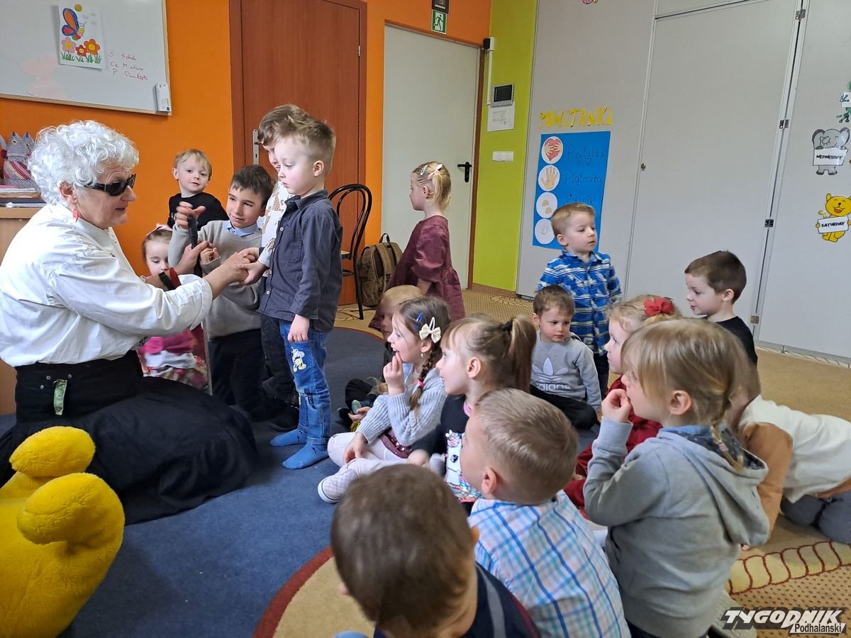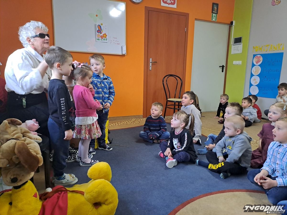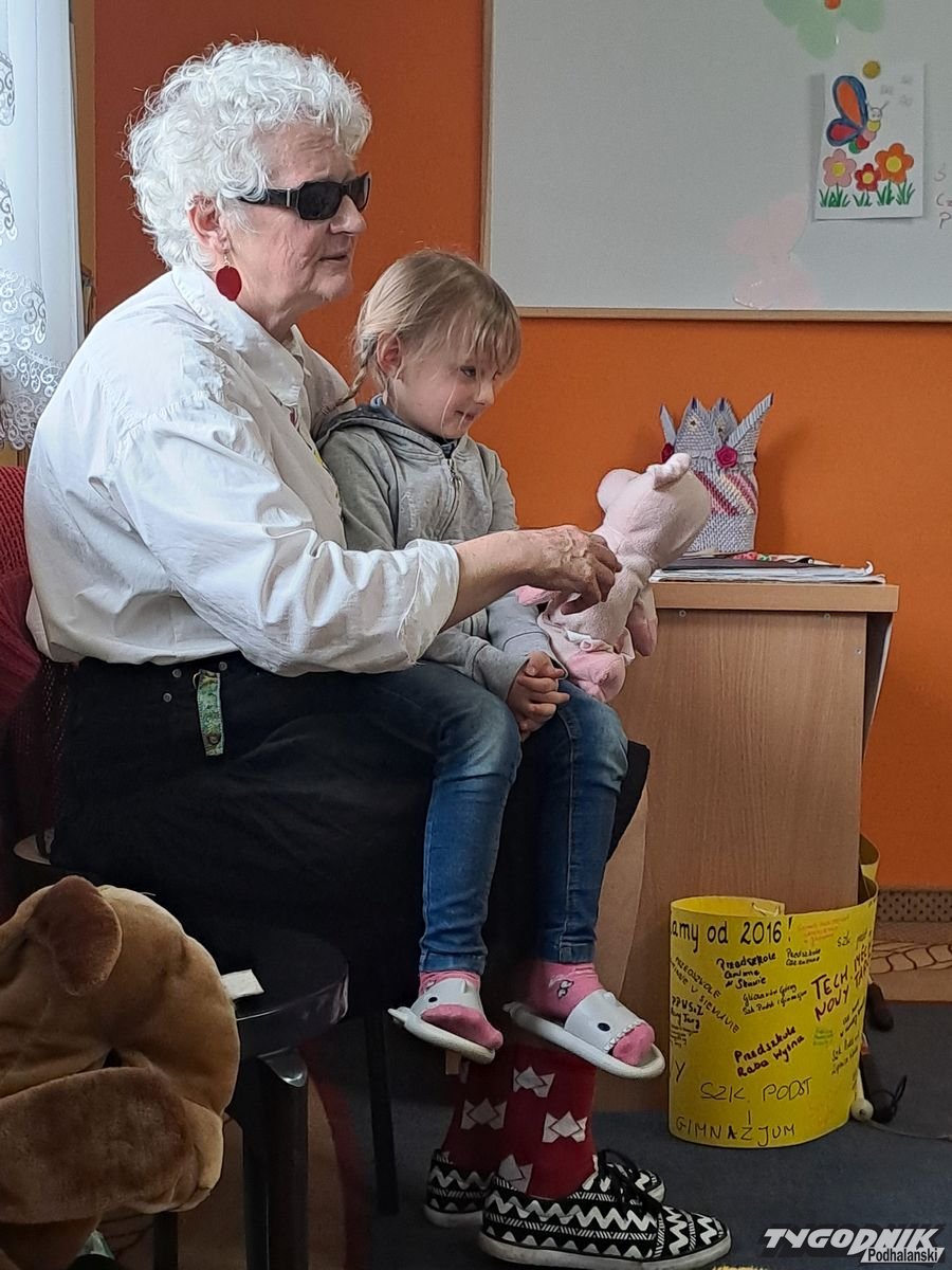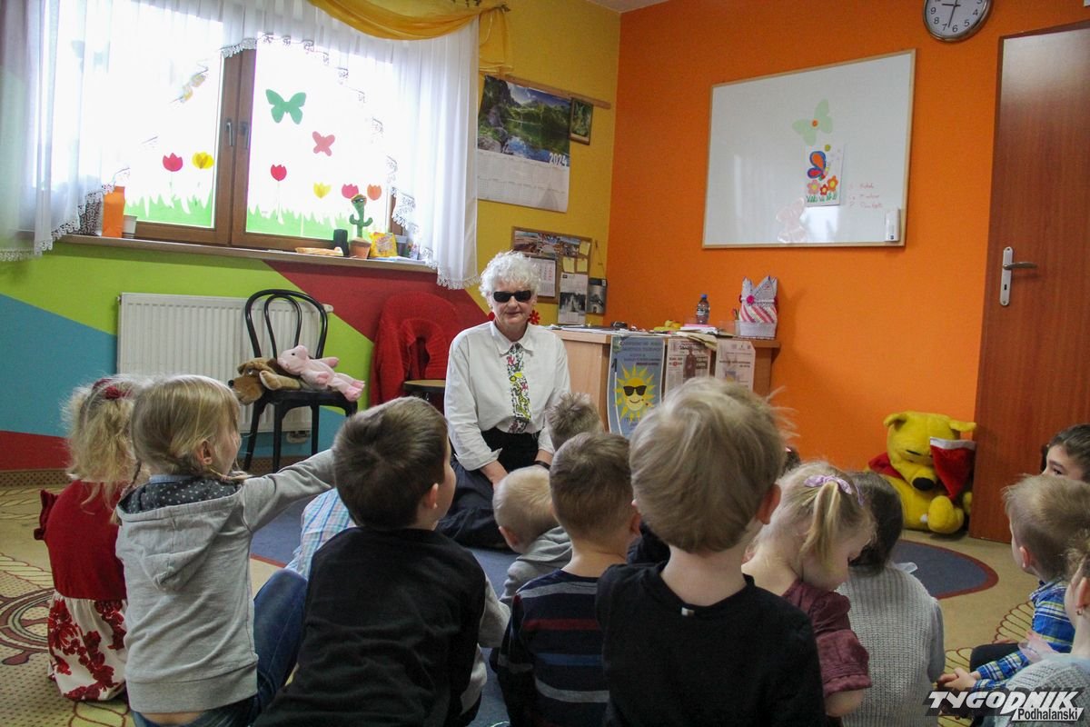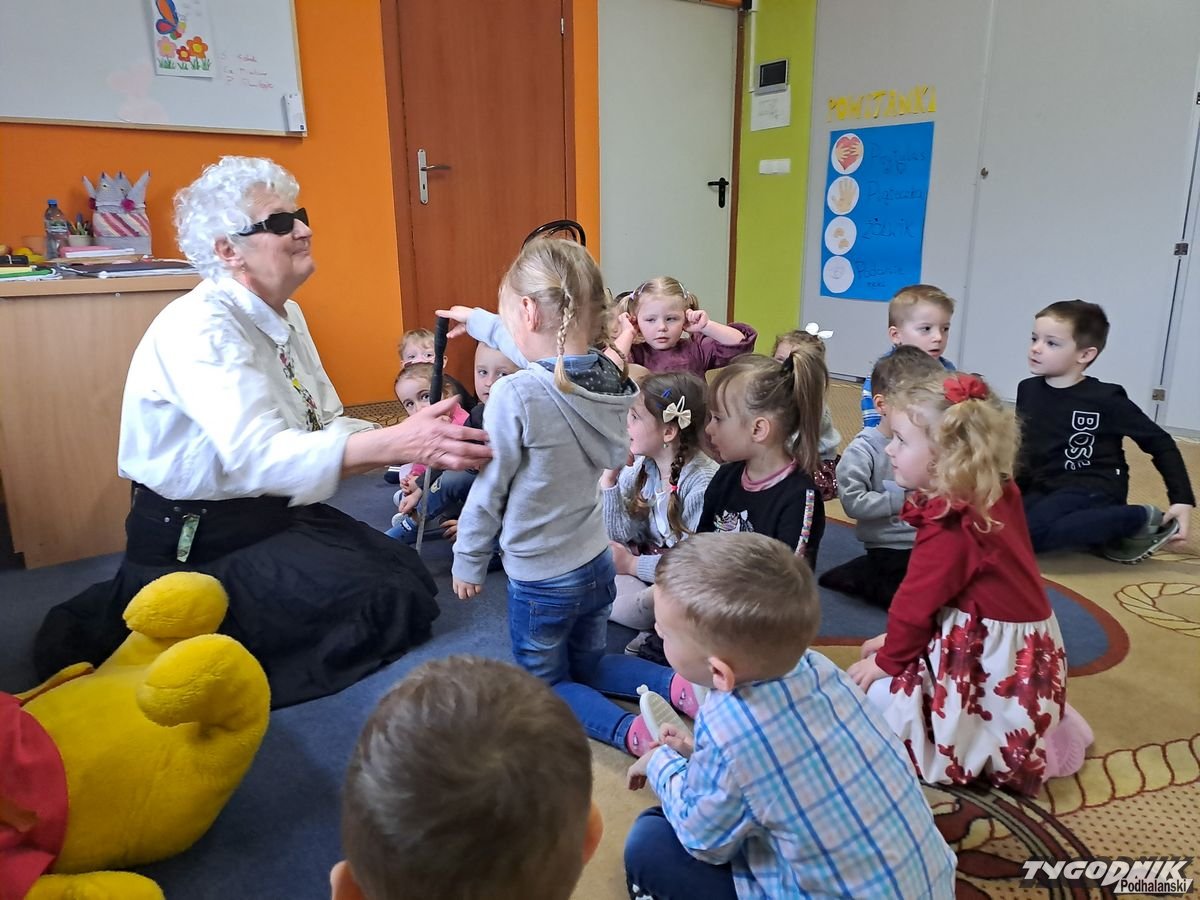 Początkowa rezerwa u maluchów szybko znika, gdy Pani Basia w ciemnych okularach prosi by zaśpiewać piosenkę, a potem siada z nimi na dywanie i opowiada o swoim świecie. Świecie, w którym nie widać nic, trzeba się umieć odnaleźć, a także potrafić prosić o pomoc. I tego jak pomóc niewidomemu uczyła przedszkolaki.