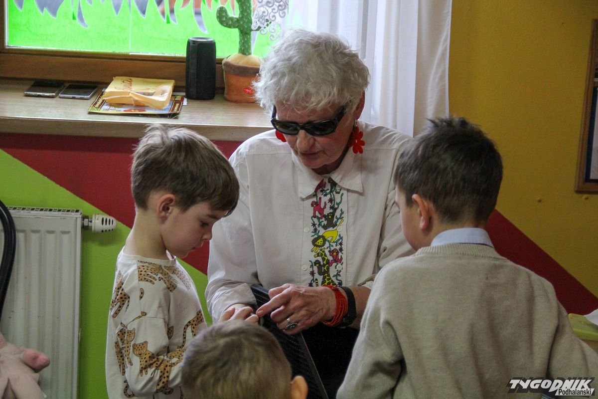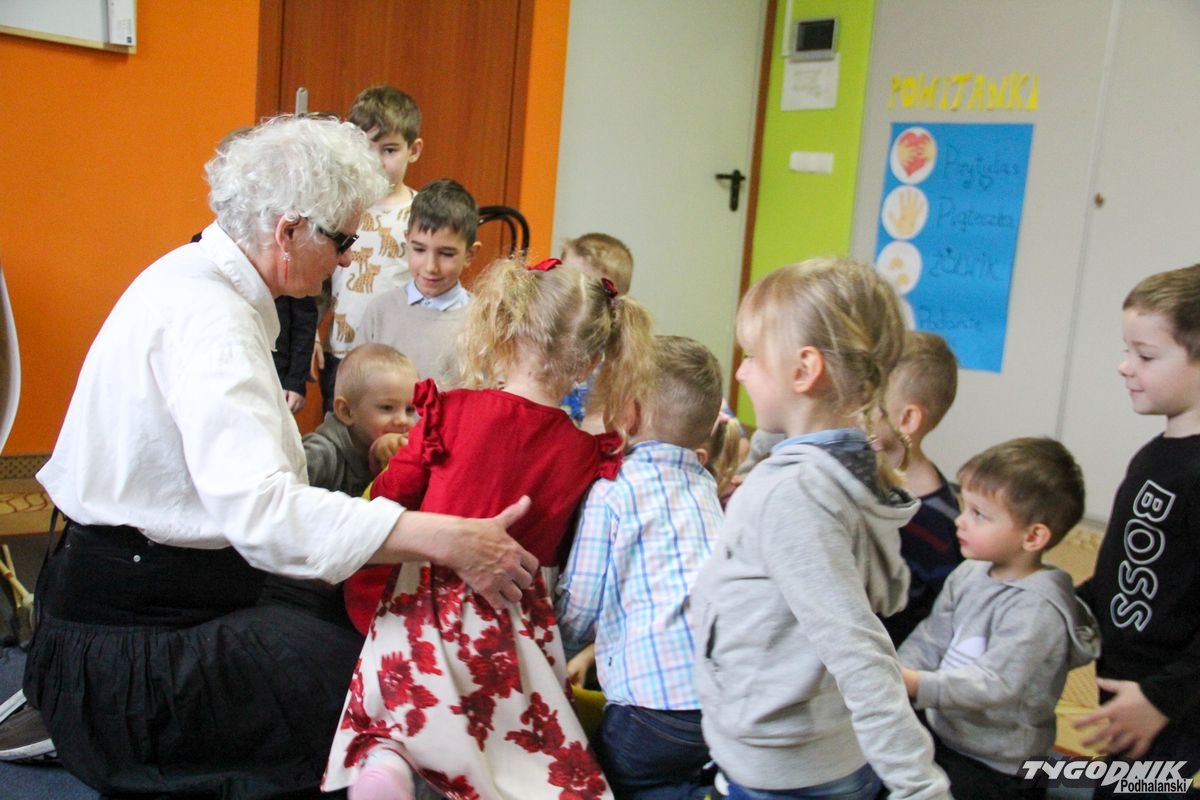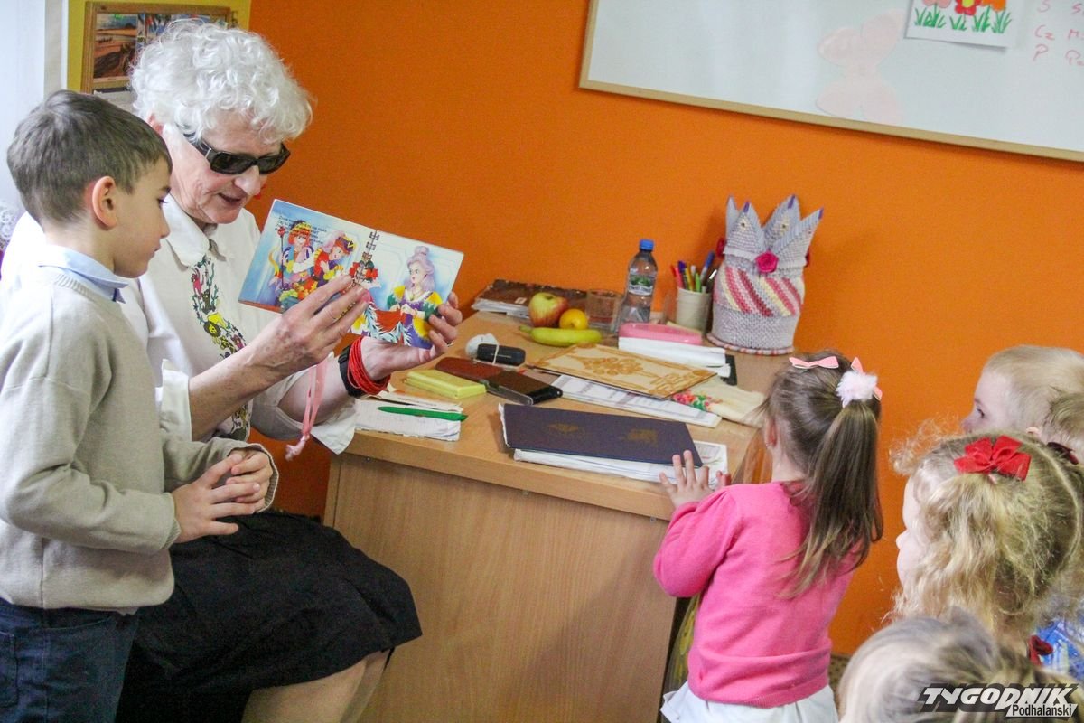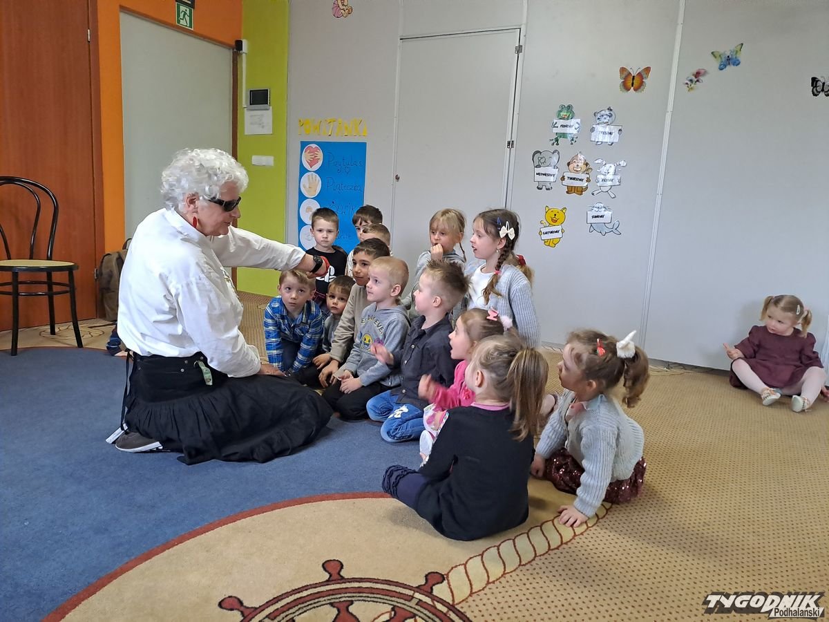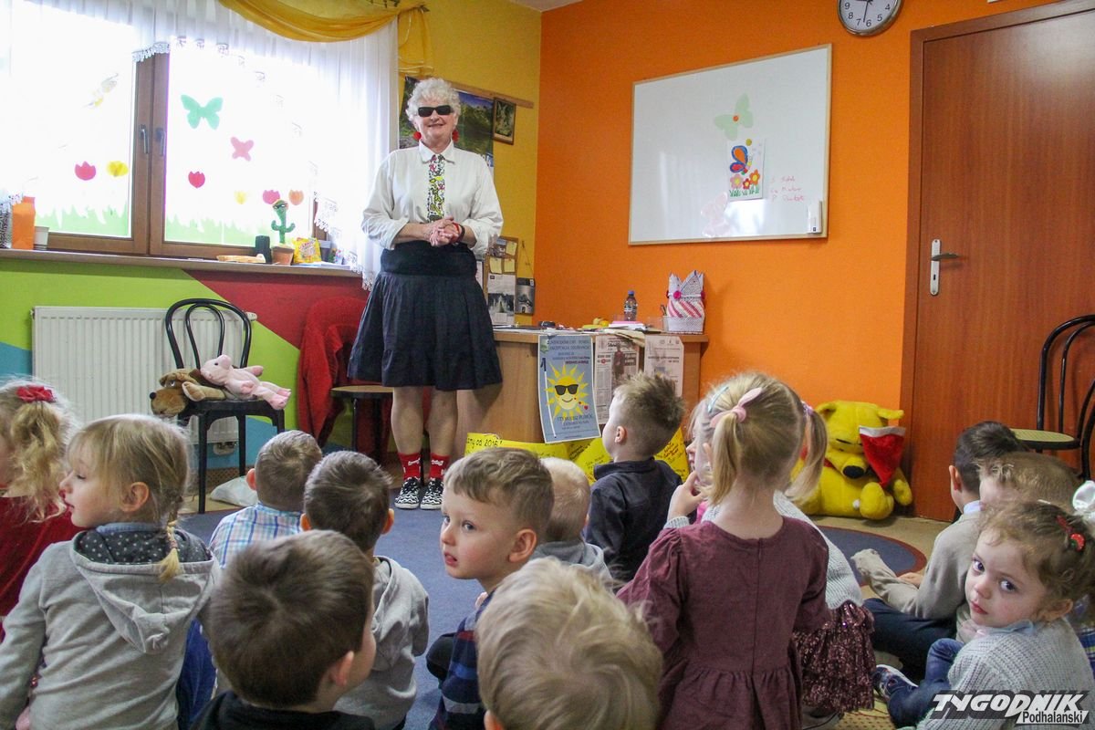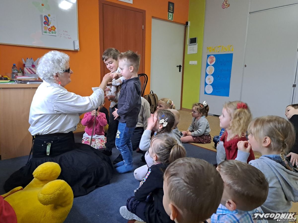 Początkowa rezerwa u maluchów szybko znika, gdy Pani Basia w ciemnych okularach prosi by zaśpiewać piosenkę, a potem siada z nimi na dywanie i opowiada o swoim świecie. Świecie, w którym nie widać nic, trzeba się umieć odnaleźć, a także potrafić prosić o pomoc. I tego jak pomóc niewidomemu uczyła przedszkolaki.