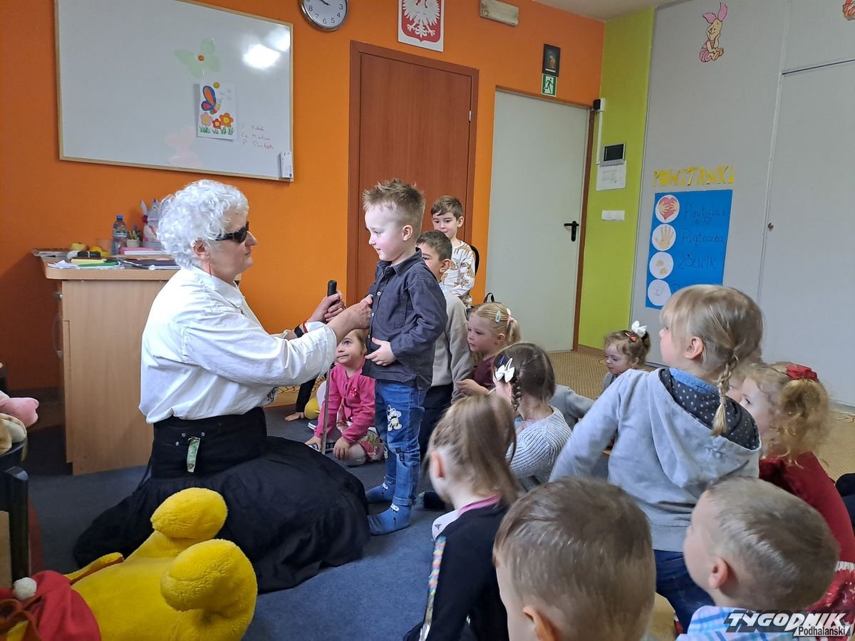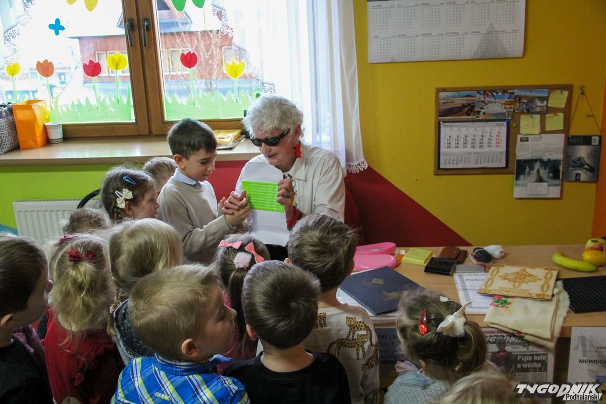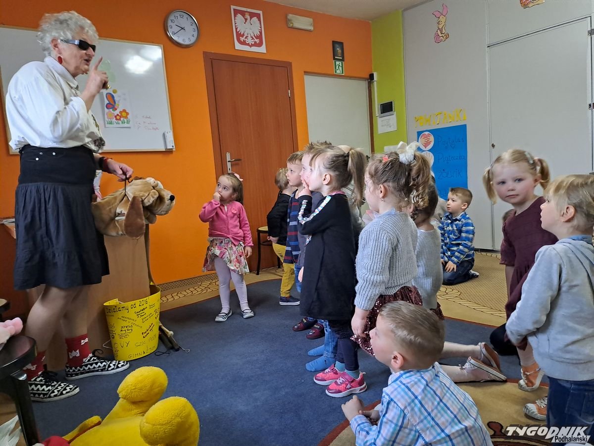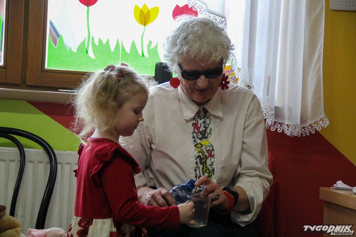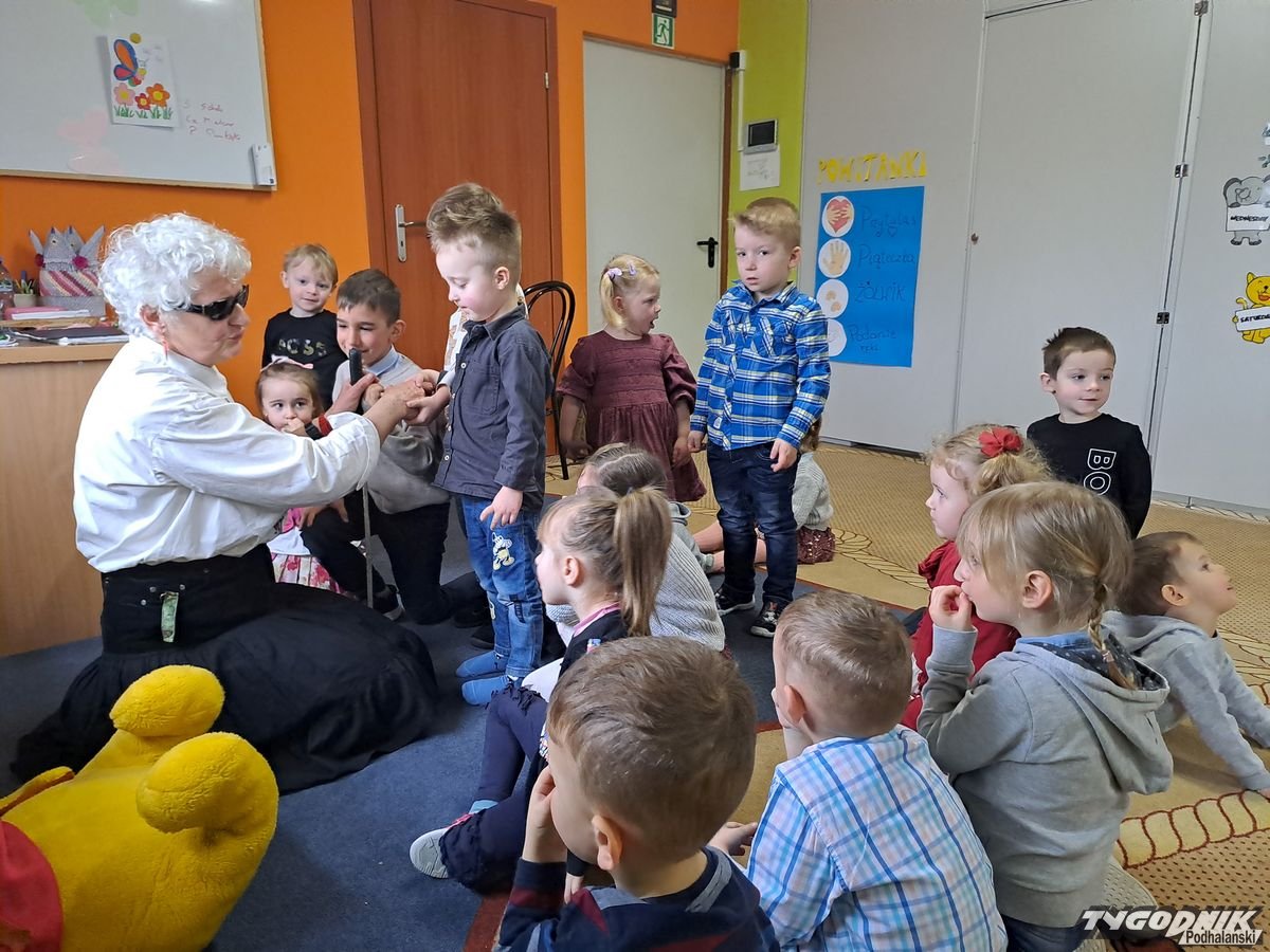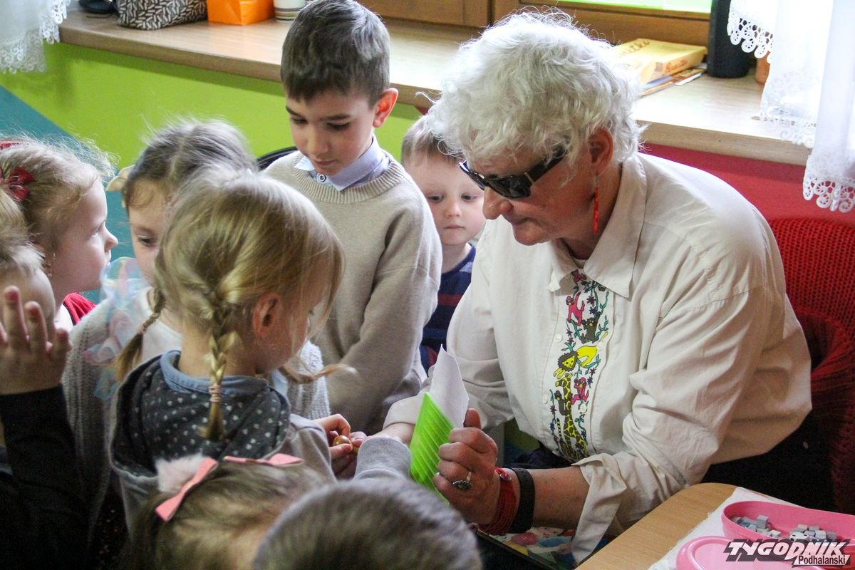 Początkowa rezerwa u maluchów szybko znika, gdy Pani Basia w ciemnych okularach prosi by zaśpiewać piosenkę, a potem siada z nimi na dywanie i opowiada o swoim świecie. Świecie, w którym nie widać nic, trzeba się umieć odnaleźć, a także potrafić prosić o pomoc. I tego jak pomóc niewidomemu uczyła przedszkolaki.
