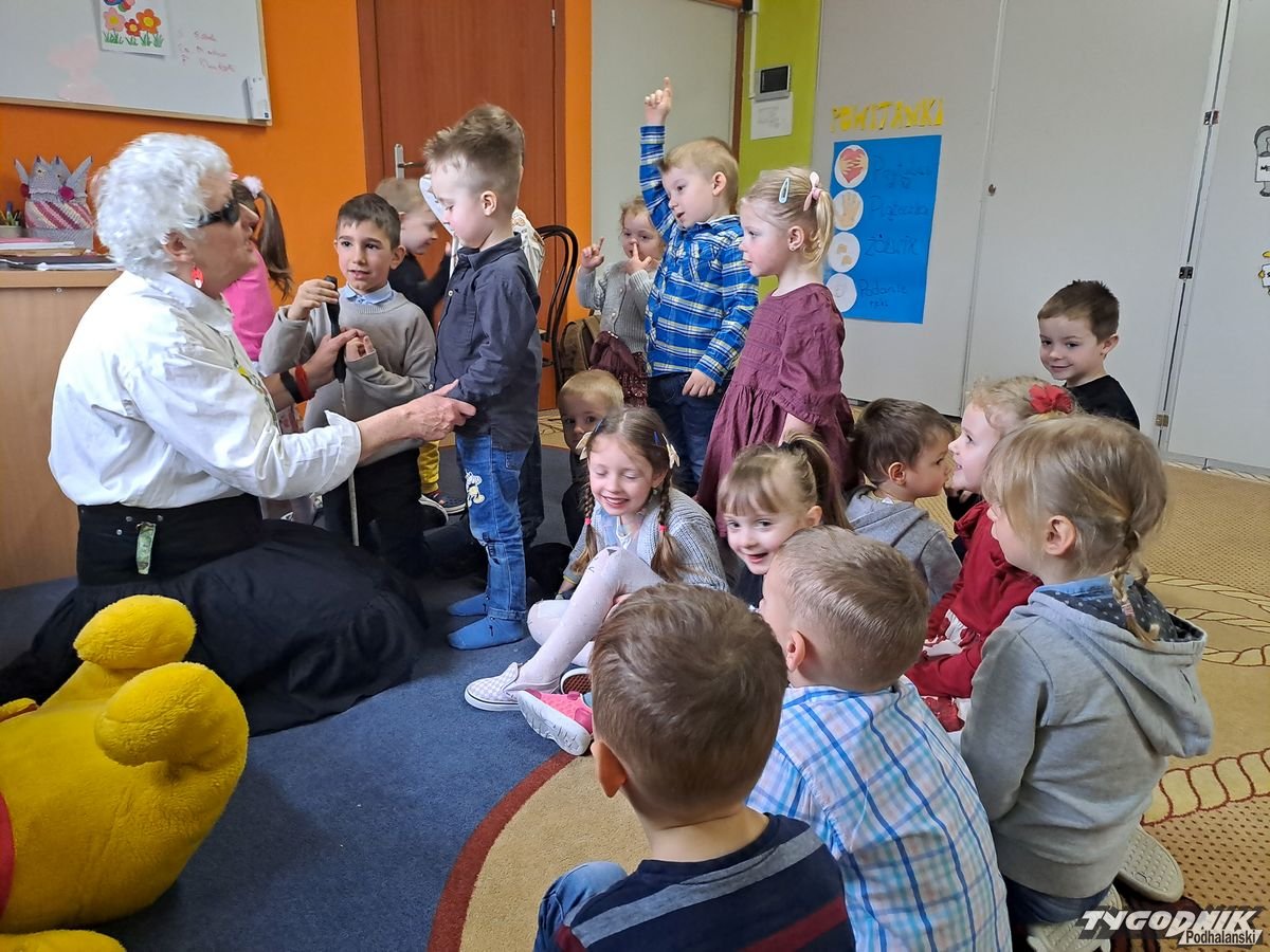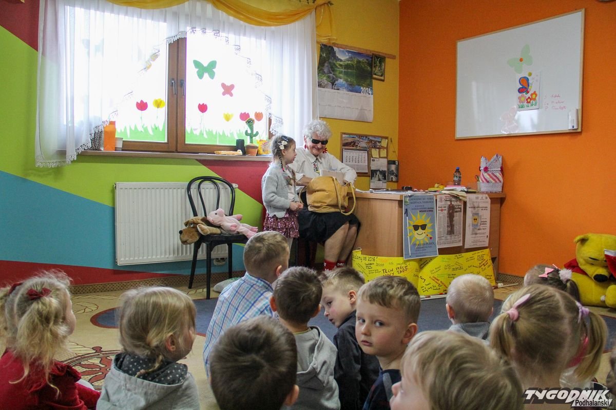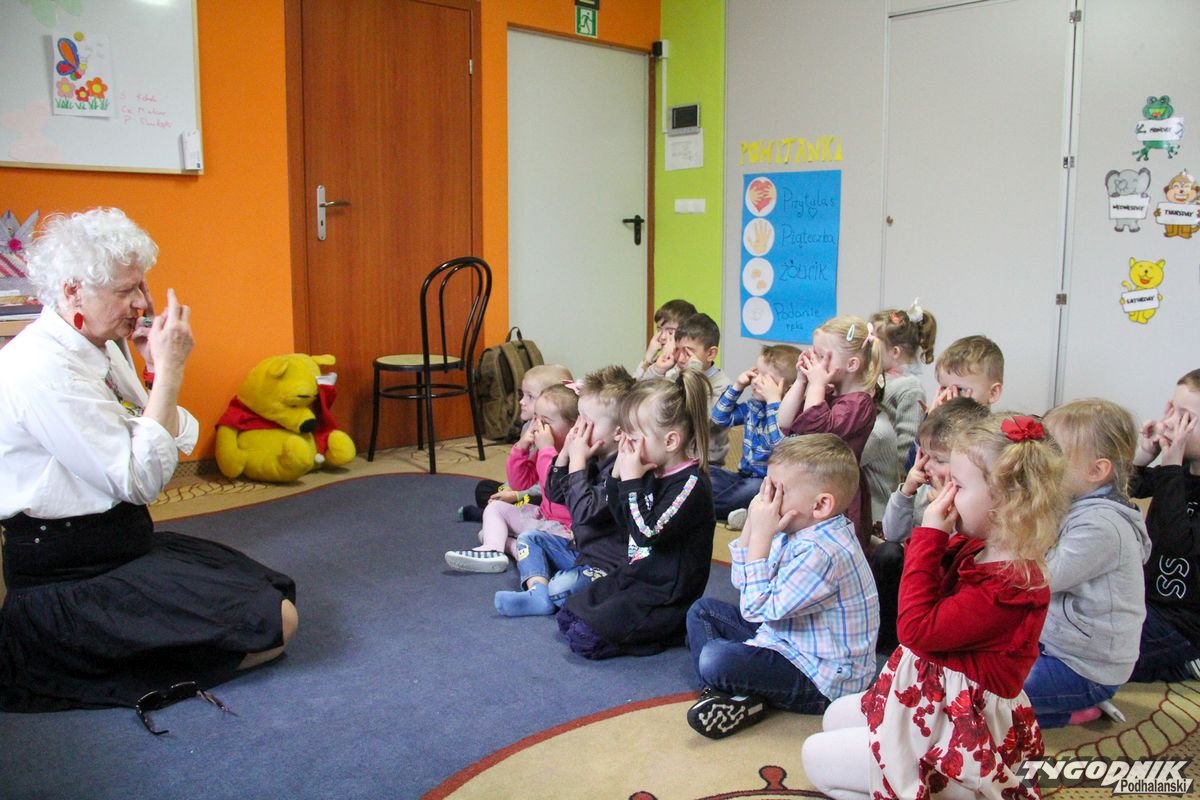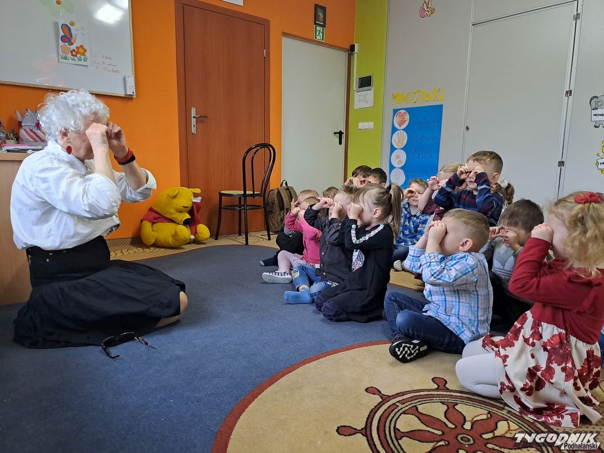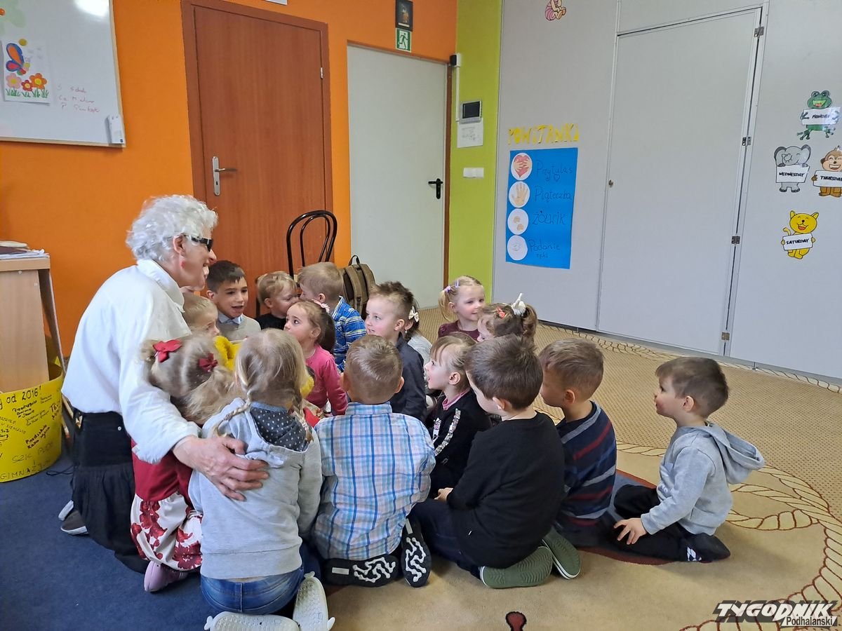 Początkowa rezerwa u maluchów szybko znika, gdy Pani Basia w ciemnych okularach prosi by zaśpiewać piosenkę, a potem siada z nimi na dywanie i opowiada o swoim świecie. Świecie, w którym nie widać nic, trzeba się umieć odnaleźć, a także potrafić prosić o pomoc. I tego jak pomóc niewidomemu uczyła przedszkolaki.