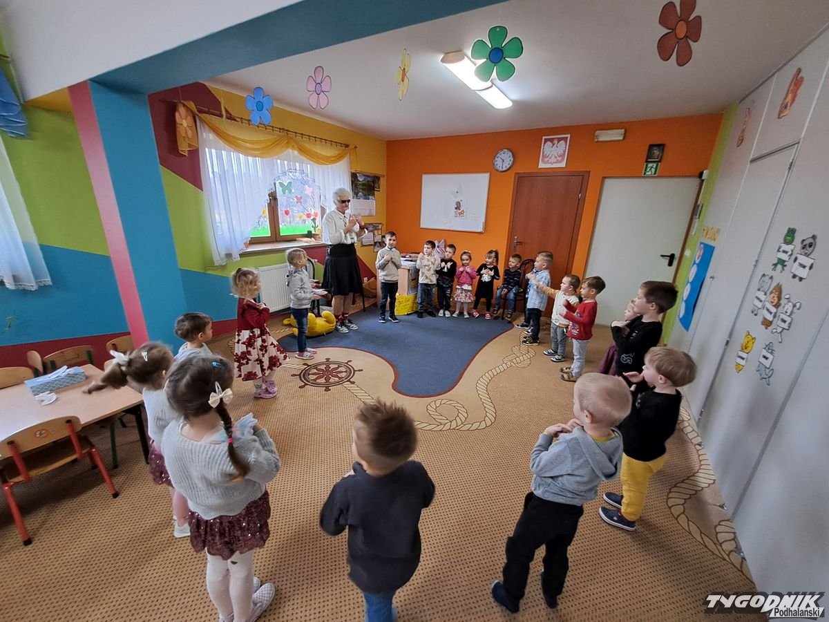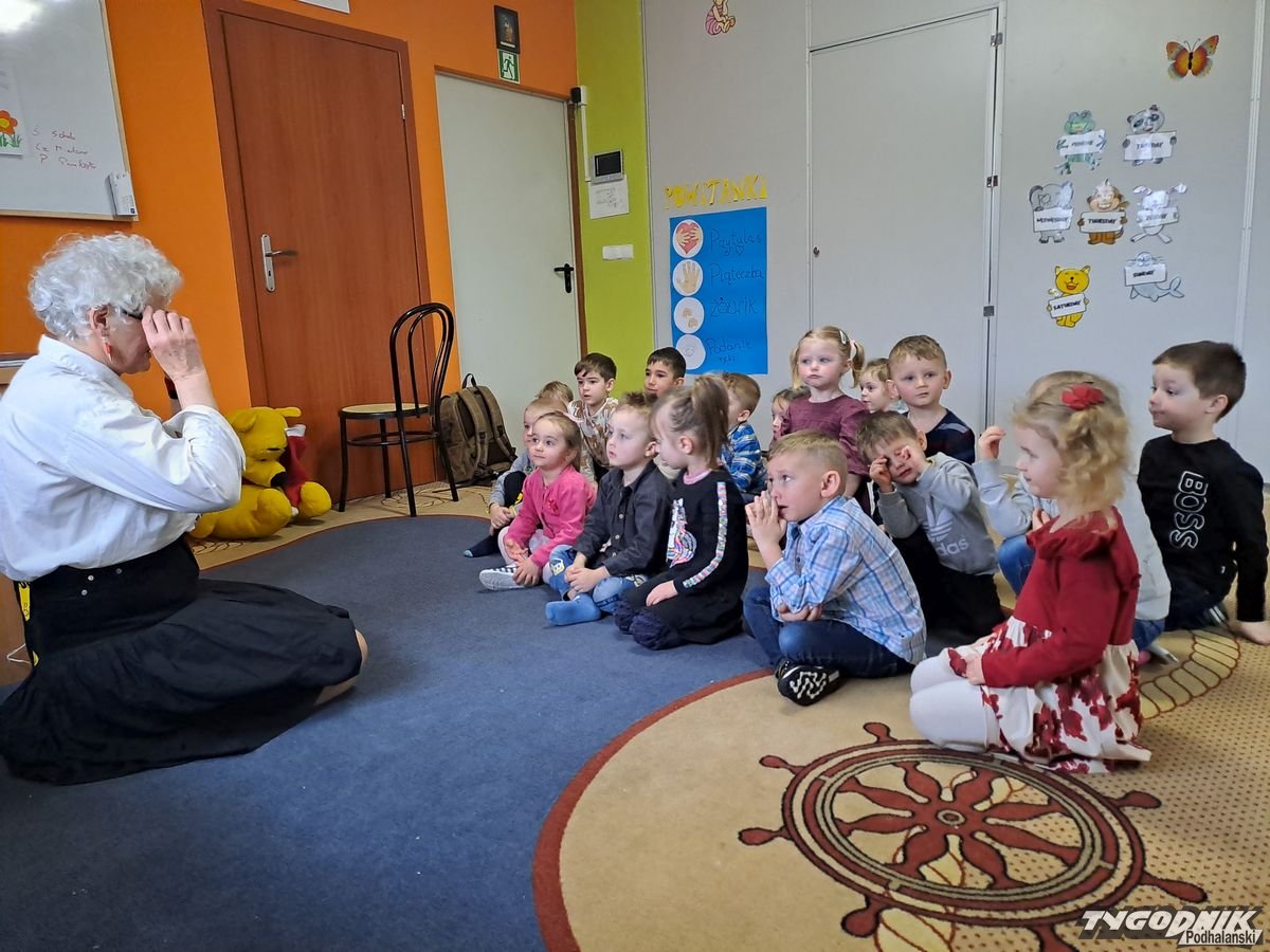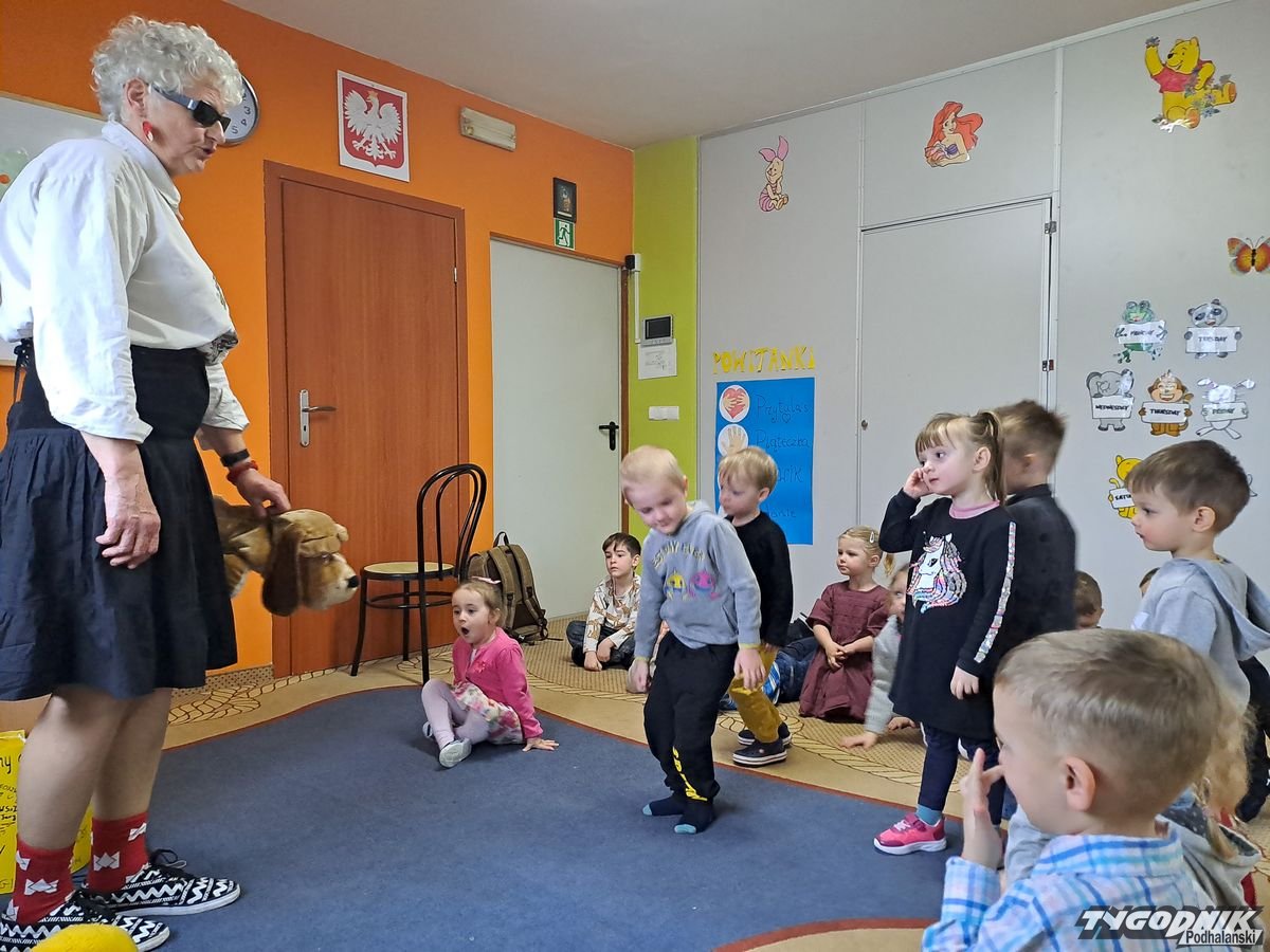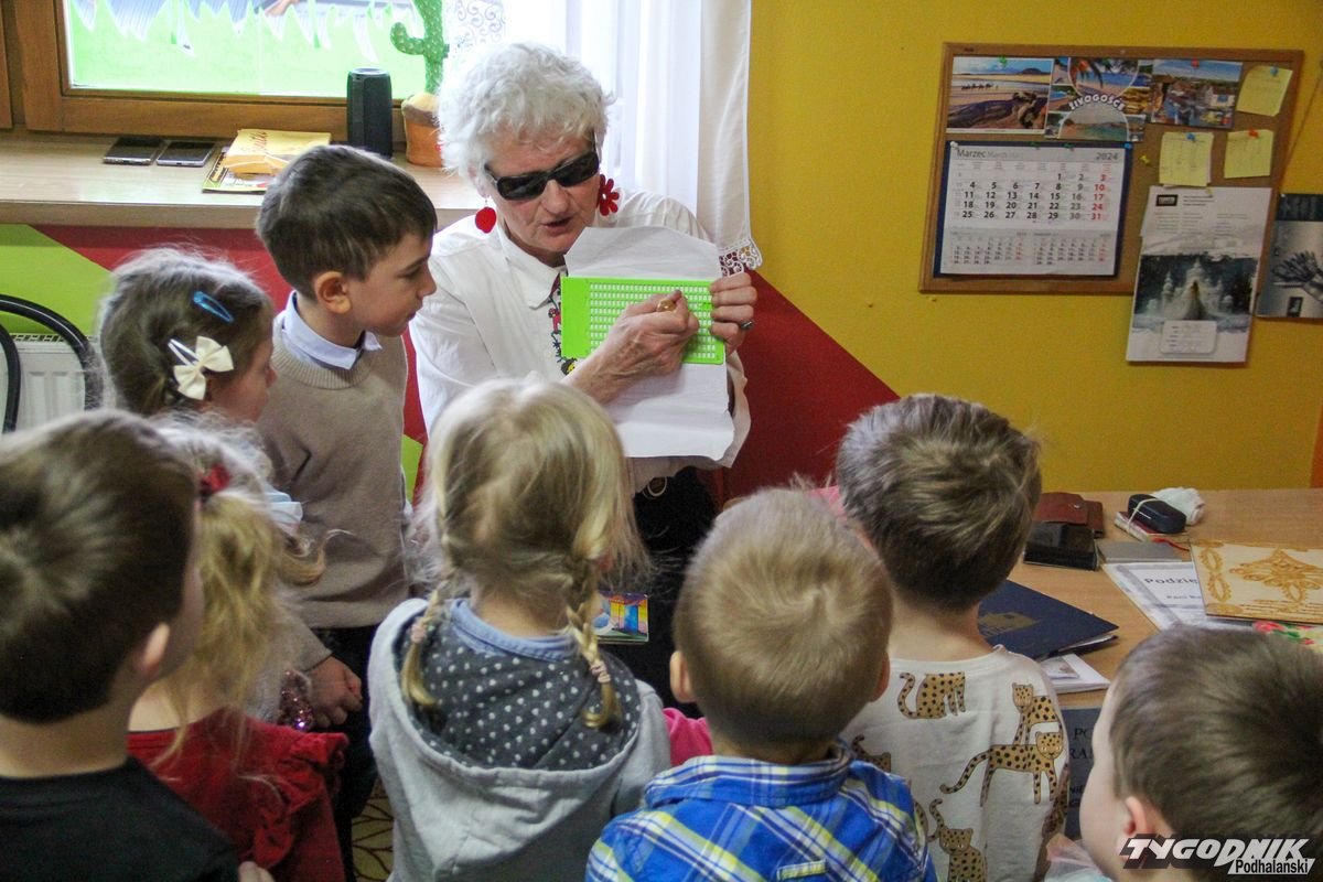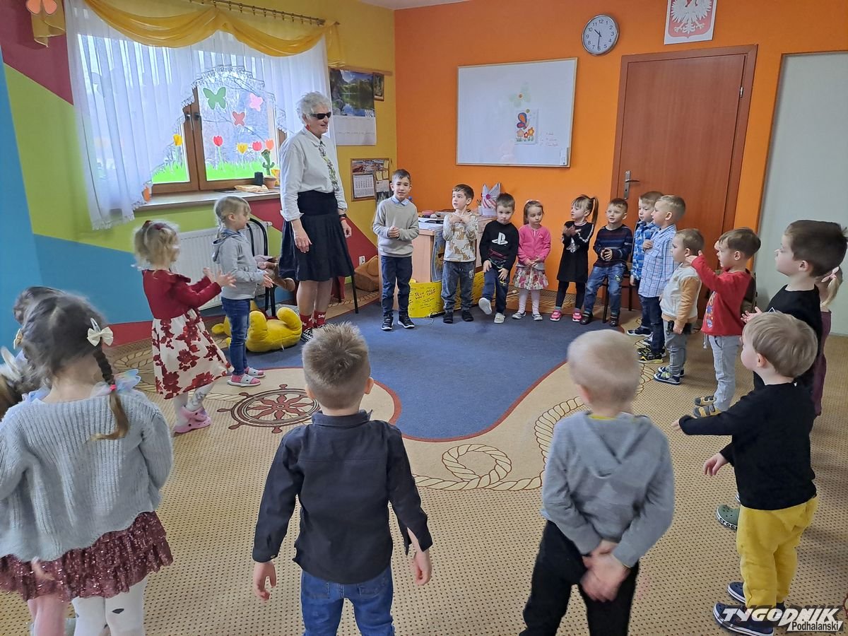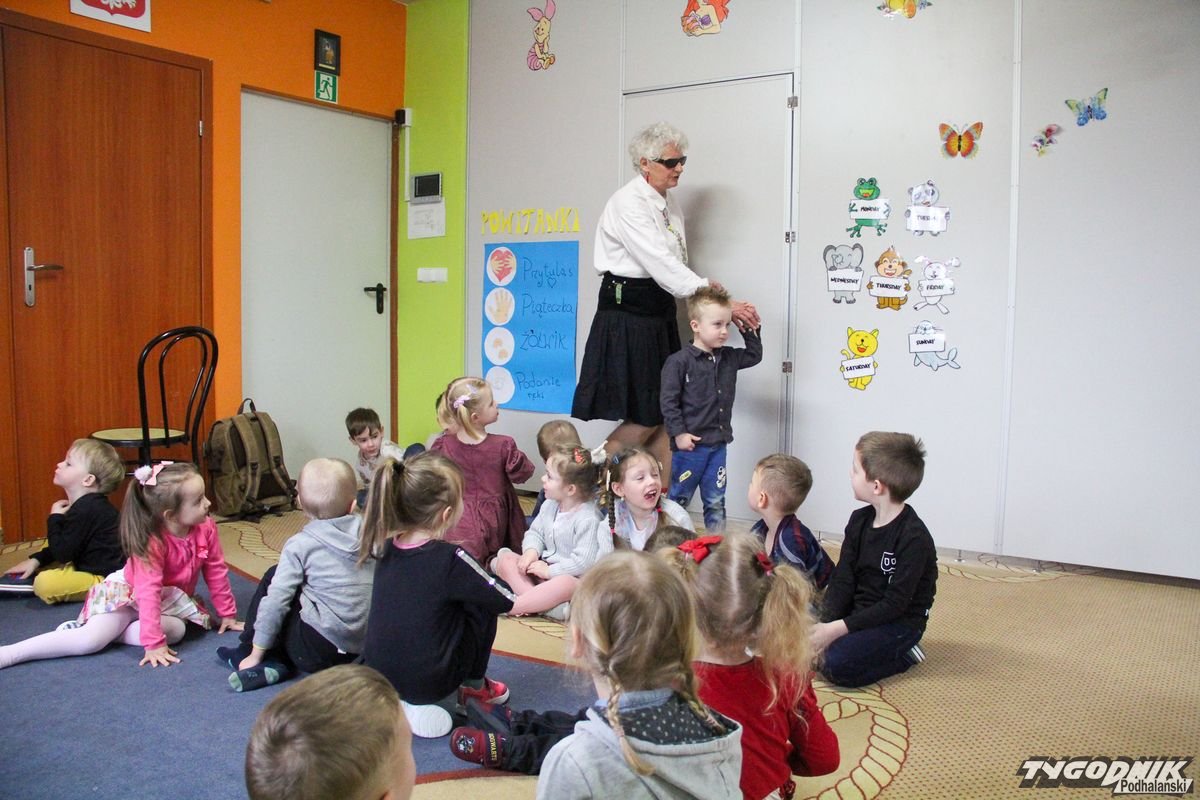 Początkowa rezerwa u maluchów szybko znika, gdy Pani Basia w ciemnych okularach prosi by zaśpiewać piosenkę, a potem siada z nimi na dywanie i opowiada o swoim świecie. Świecie, w którym nie widać nic, trzeba się umieć odnaleźć, a także potrafić prosić o pomoc. I tego jak pomóc niewidomemu uczyła przedszkolaki.