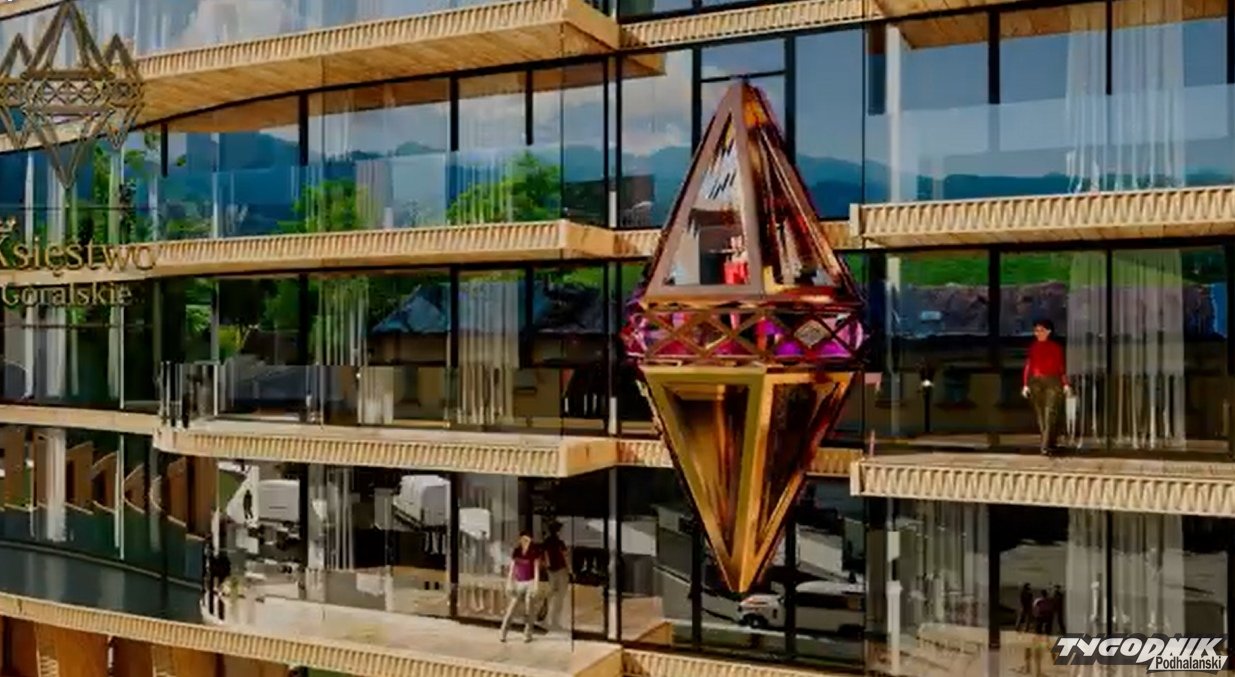 Złota winda w kształcie diamentu wzorowanego na oscypku. Taki projekt w centrum Zakopanego (WIDEO)