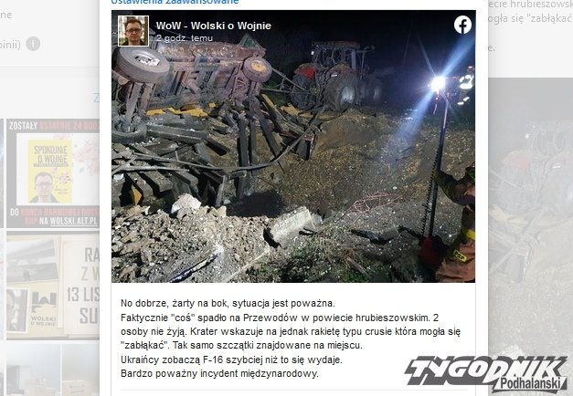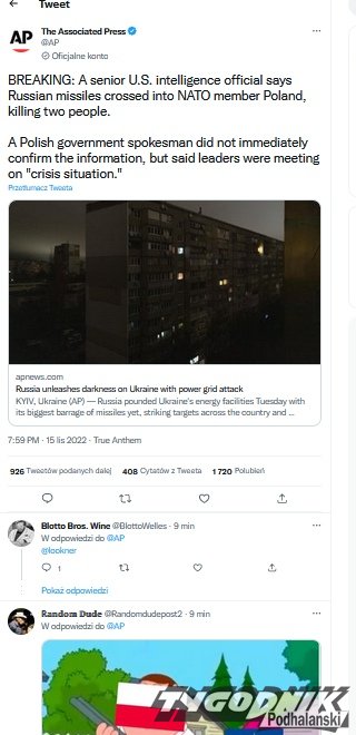 Media społecznościowe i ogólnopolskie portale podają niepokojące wiadomości o zbłąkanej rakiecie, która uderzyć miała w terytorium Polski. Informacje o rakiecie podała też ok. godz. 20 światowa agencja AP. W środę rano agencja AP podała, że na Polskę spadła ukraińska rakieta wystrzelona w rosyjskie pociski.