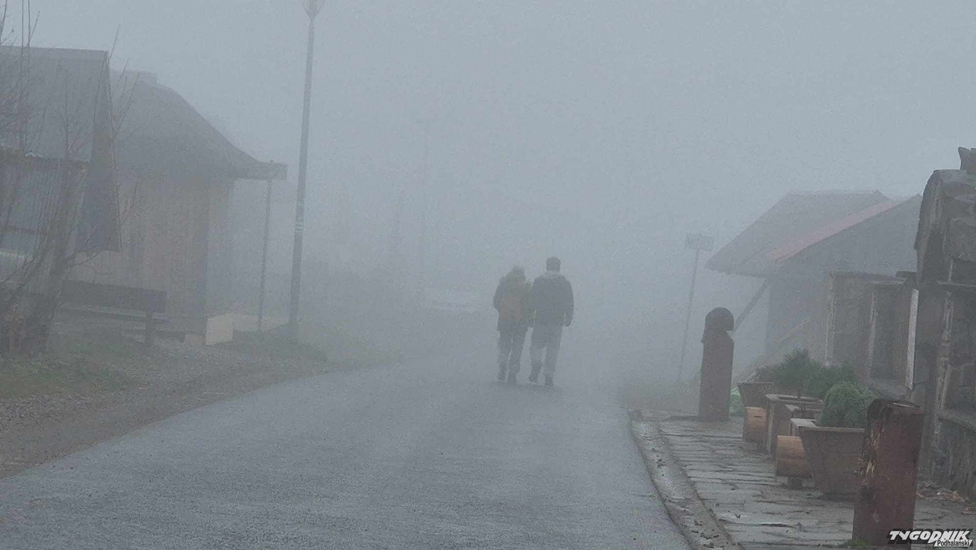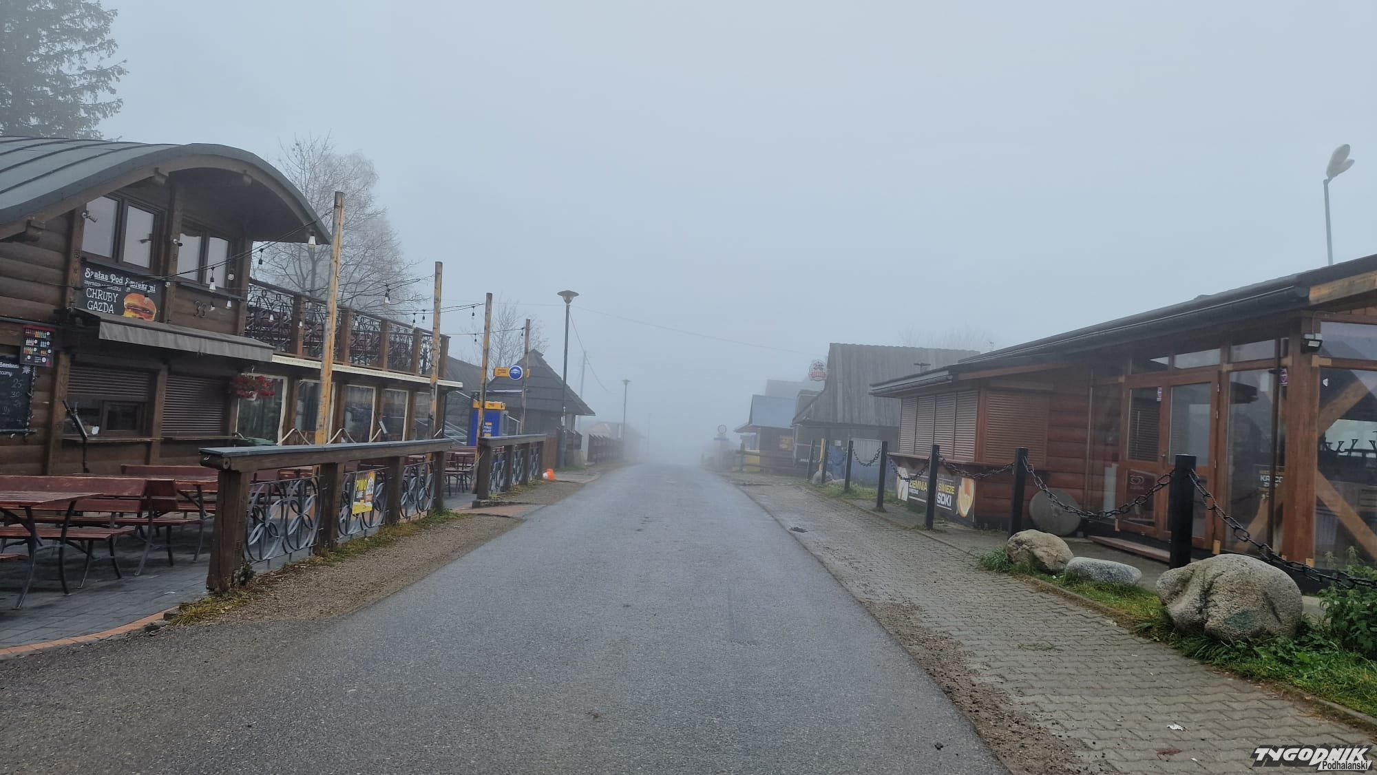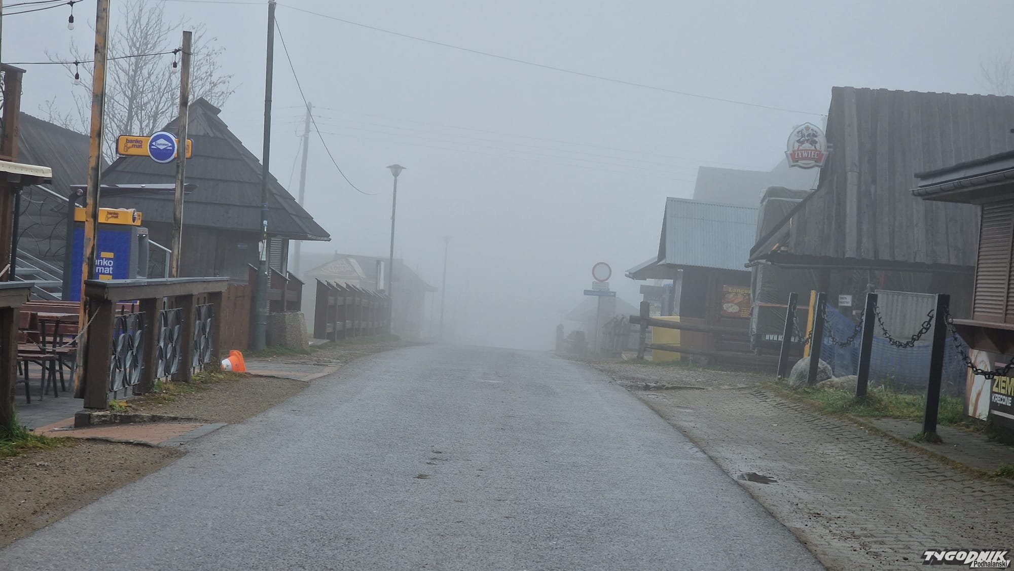 Zobaczcie, jaka pogoda dziś na Gubałówce. Chociaż niewiele widać, bo widoki zasłania mgła i chmury. Z mgły wyłaniają się budki jak z horroru, a turystów brak.