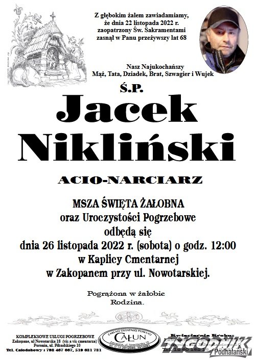 Wczoraj w nowotarskim szpitalu zmarł Jacek Nikliński z Zakopanego. To on ustanowił rekord Polski w najszybszym zjeździe na nartach. Na Beskidzie osiągnął prędkość 180 km/h. Odszedł w wieku 68 lat. Pogrzeb odbędzie się w sobotę.