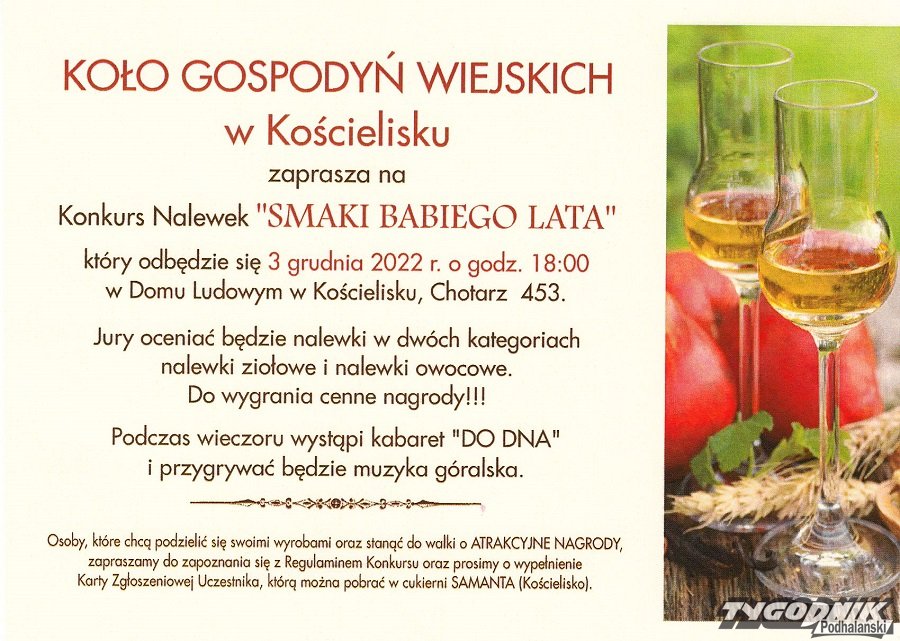 Gaździny z Koła Gospodyń Wiejskich w Kościelisku zapraszają do udziału w wielkim konkursie z atrakcyjnymi nagrodami - będą degustacje nalewek i nie tylko.