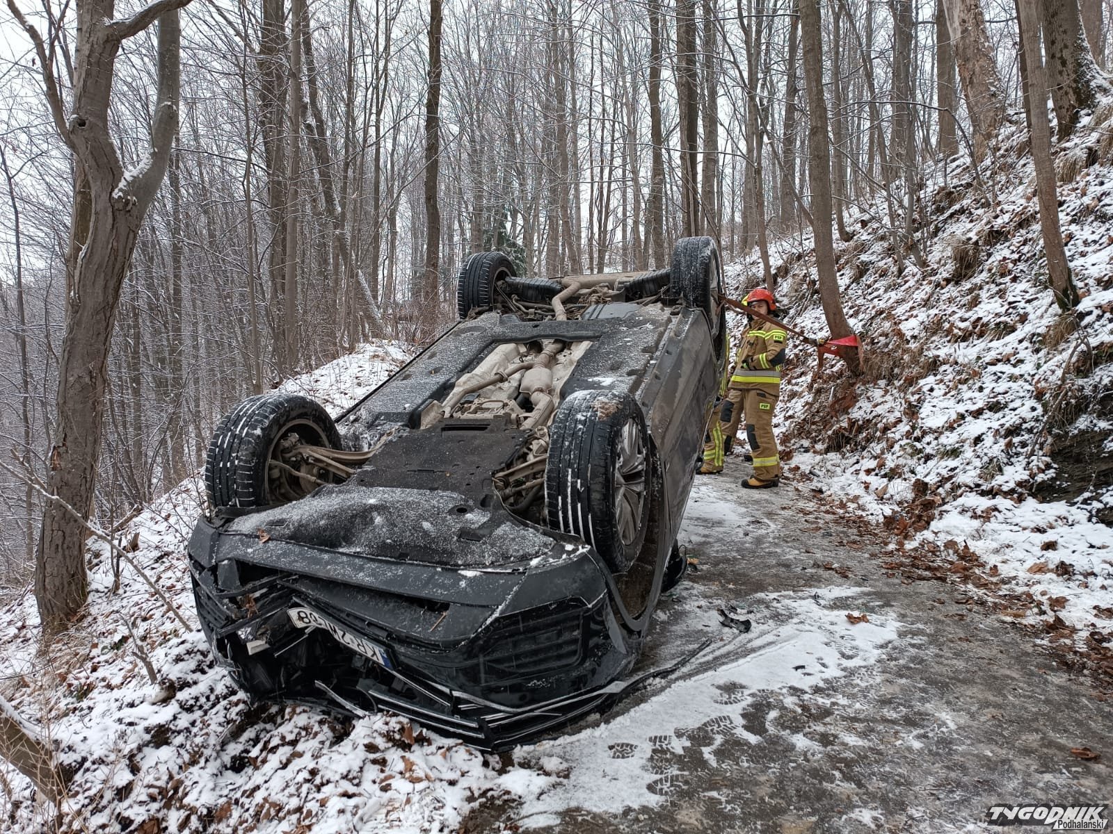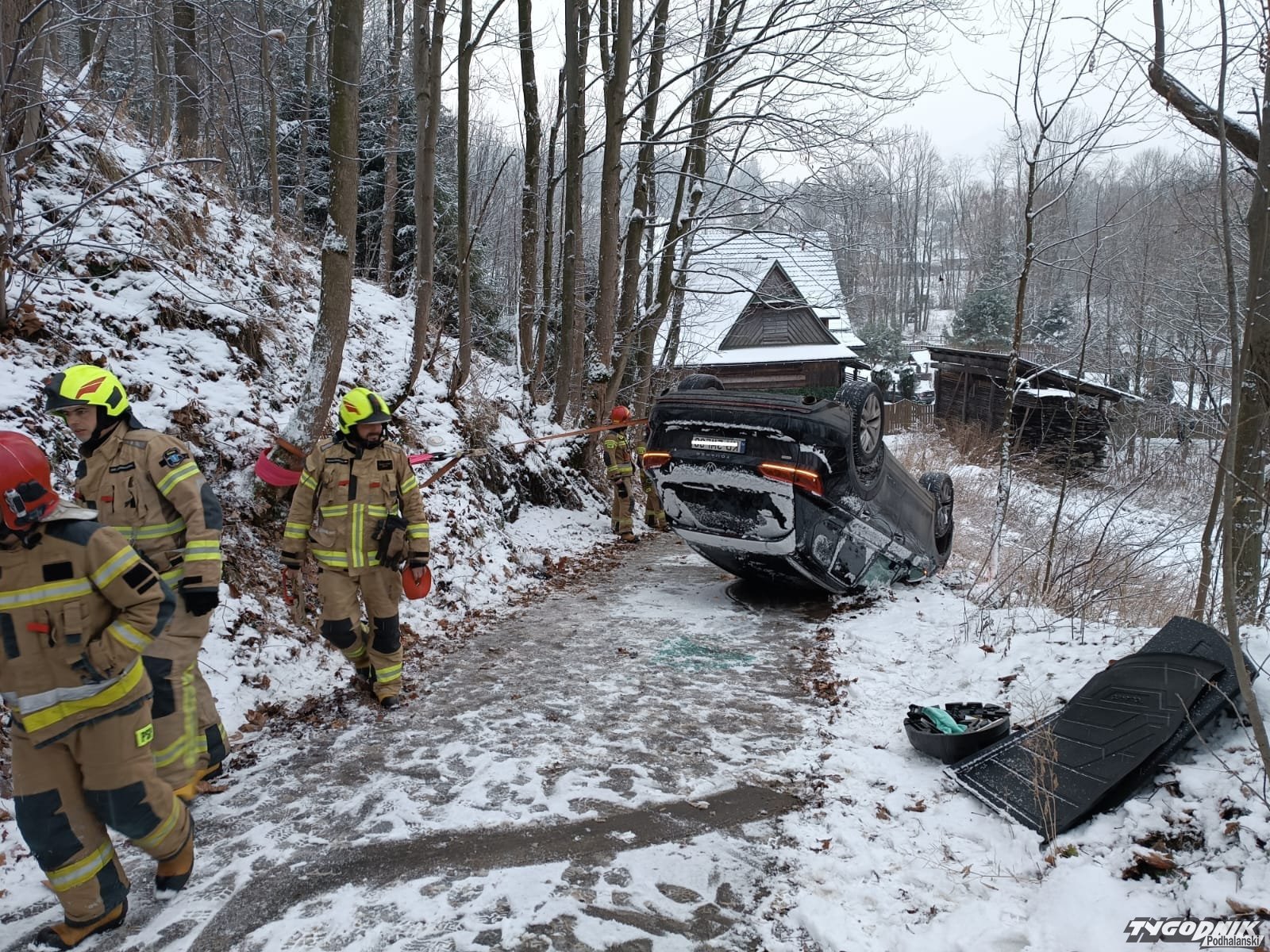 Dachowanie samochodu. Poszkodowana kobieta (ZDJĘCIA)