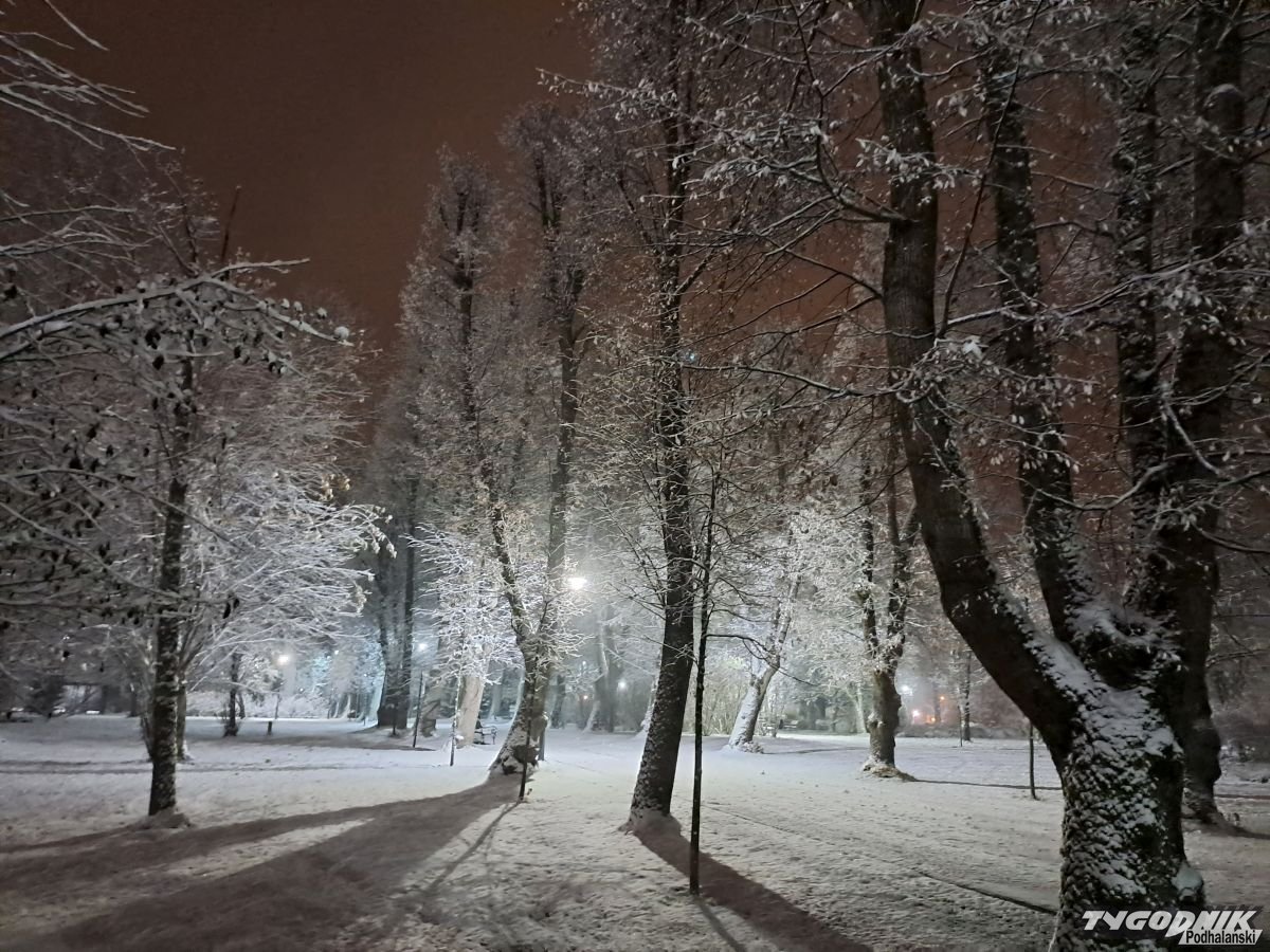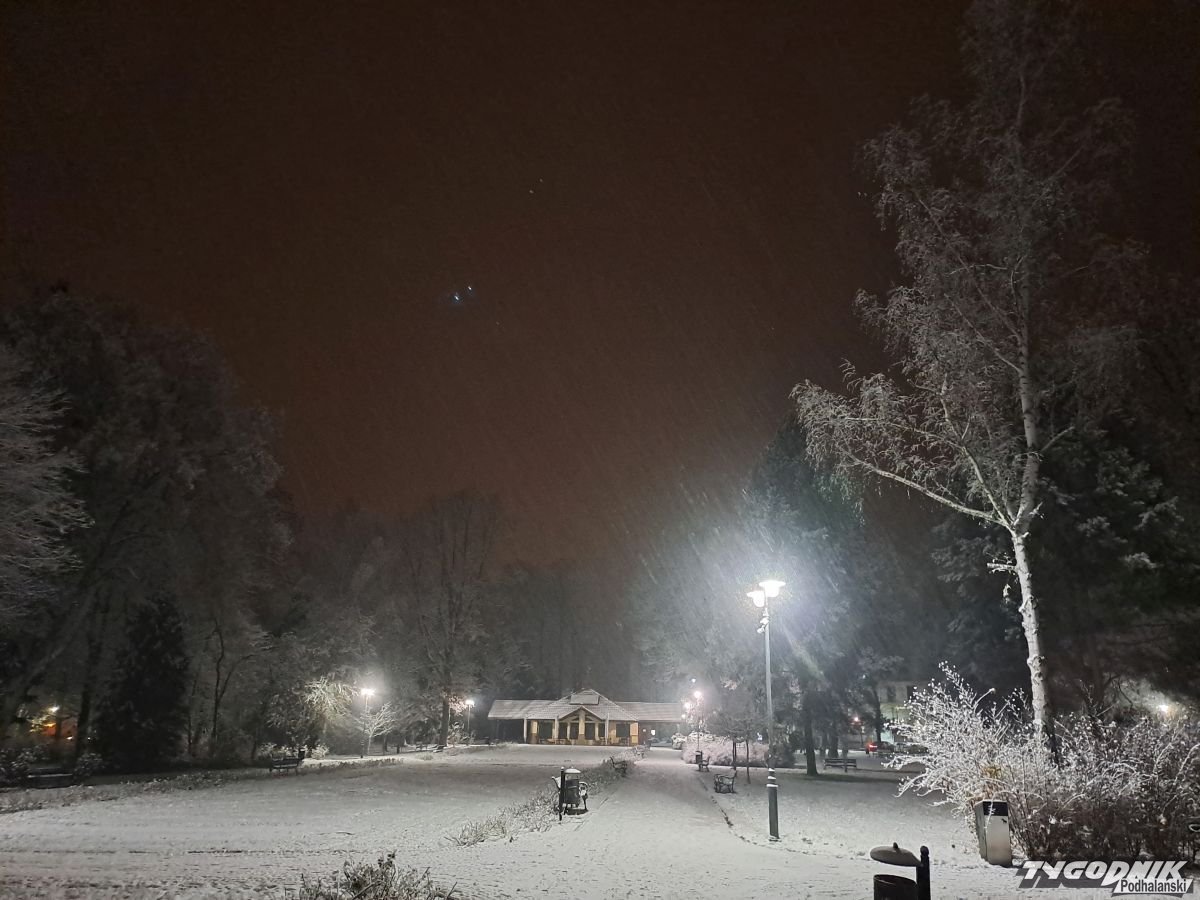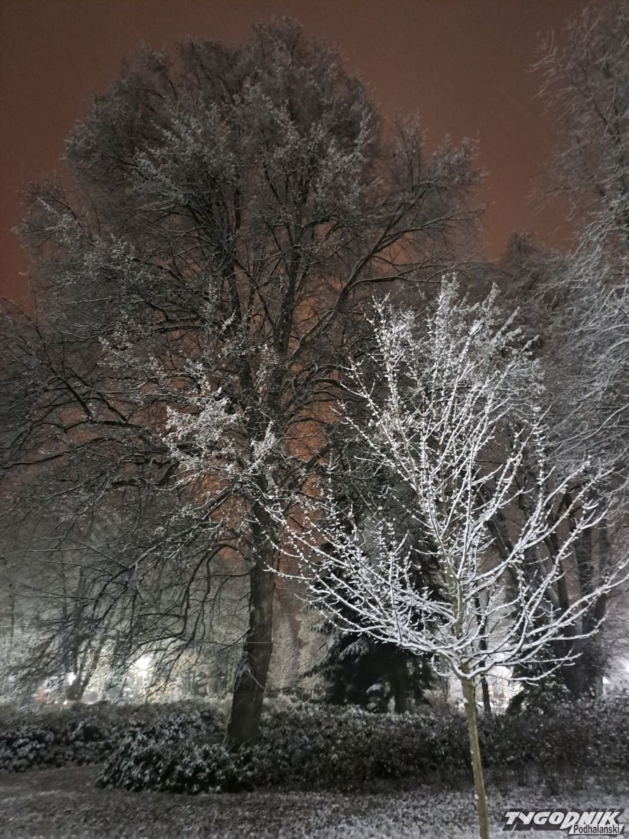 Śniegu wciąż jest niewiele, a mokre płatki oblepiły gałęzie zmieniając drzewa w białe struktury na tle ciemnego nieba. Temperatura wciąż jest na lekkim plusie, nocą ma oscylować w okolicach zera, by jutro podskoczyć do 4 stopni. To nie wróży, by śnieg utrzymał się na dłużej. Warto więc mimo późnej pory udać się na spacer. Tym bardziej, że także jakość powietrza nie jest zła - wskaźnik pyłu zawieszonego PM10 mieści się w dopuszczalnych normach - wieczorem wskazuje 34 µg/m3.