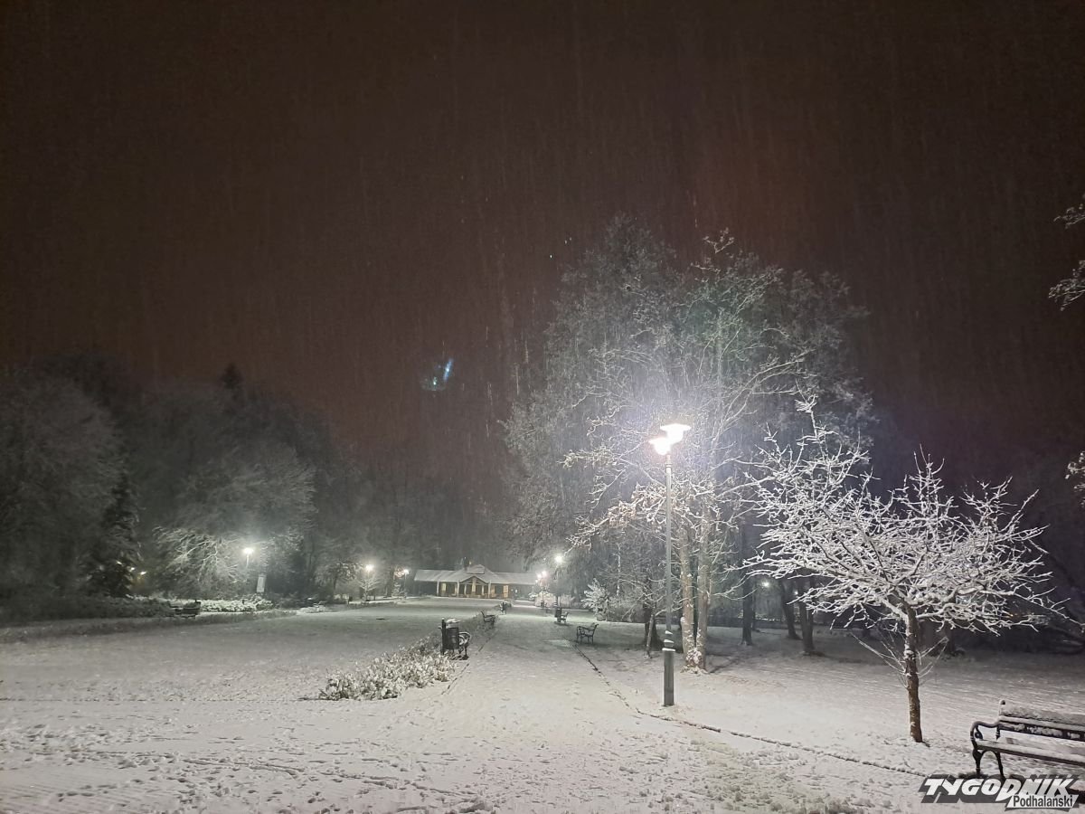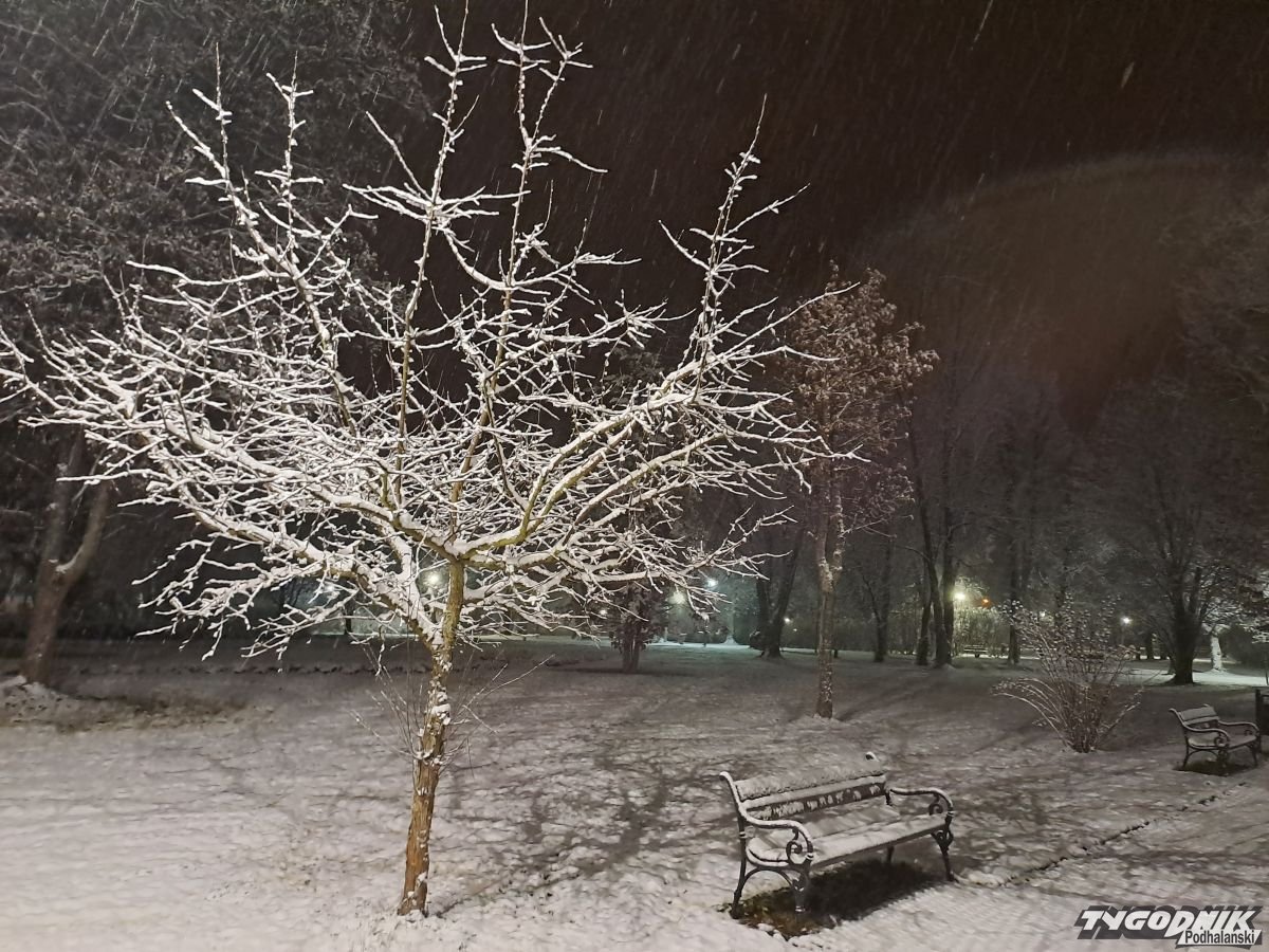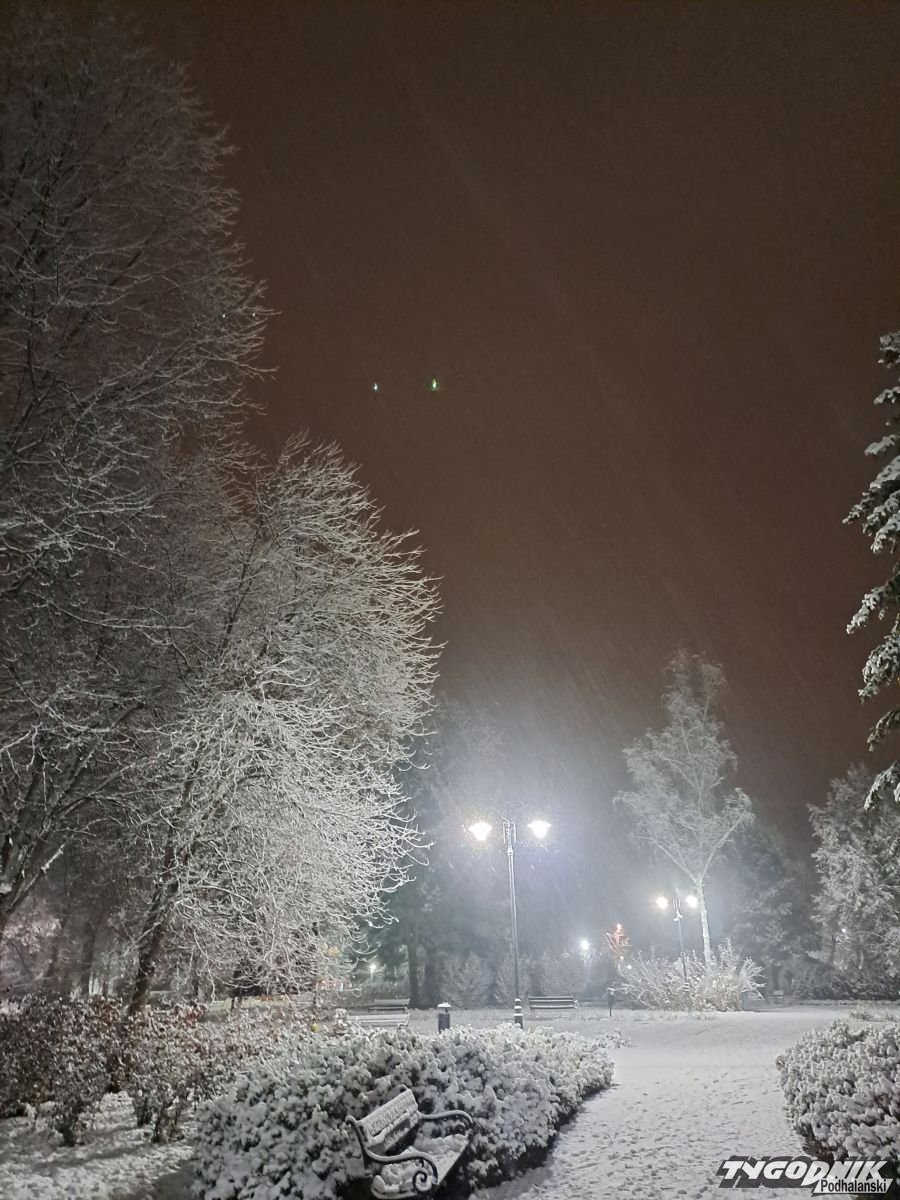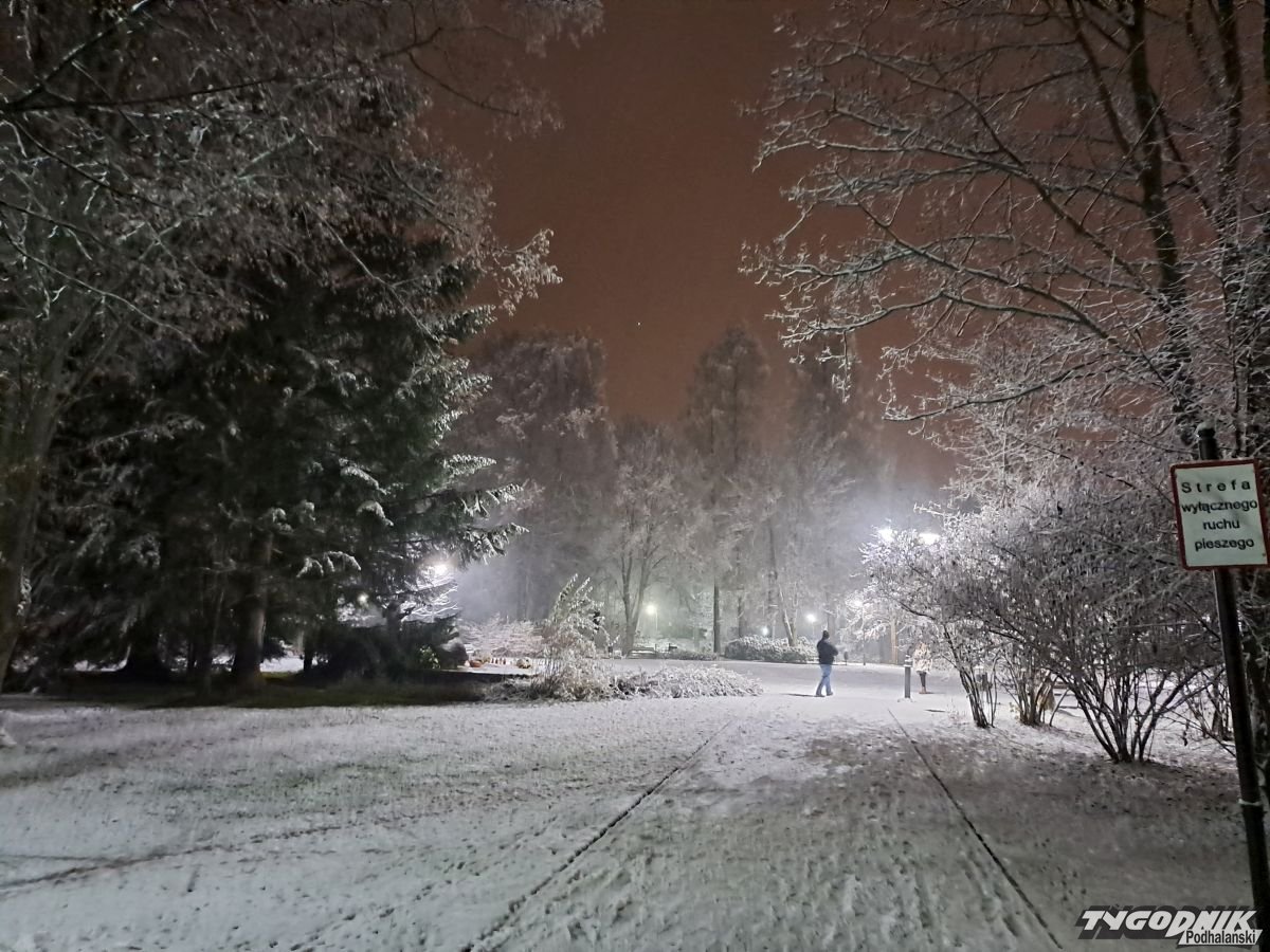 Śniegu wciąż jest niewiele, a mokre płatki oblepiły gałęzie zmieniając drzewa w białe struktury na tle ciemnego nieba. Temperatura wciąż jest na lekkim plusie, nocą ma oscylować w okolicach zera, by jutro podskoczyć do 4 stopni. To nie wróży, by śnieg utrzymał się na dłużej. Warto więc mimo późnej pory udać się na spacer. Tym bardziej, że także jakość powietrza nie jest zła - wskaźnik pyłu zawieszonego PM10 mieści się w dopuszczalnych normach - wieczorem wskazuje 34 µg/m3.