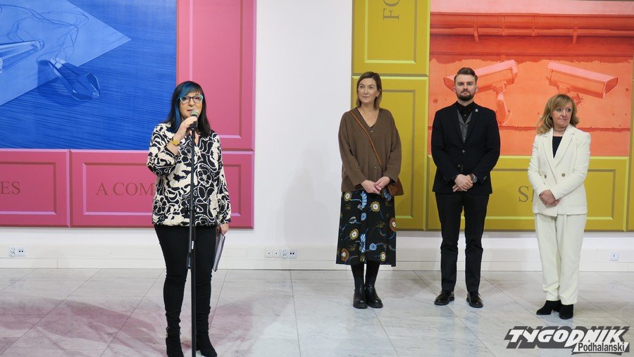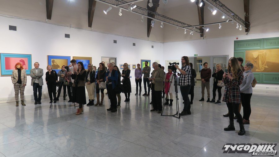 Prawda nie istnieje, prawda jest jak sztuka - wielkie napisy w języku angielskim na obramowaniach dużych obrazów dopełniają wizję artystyczną dzieł Arkadiusza Karapudy.