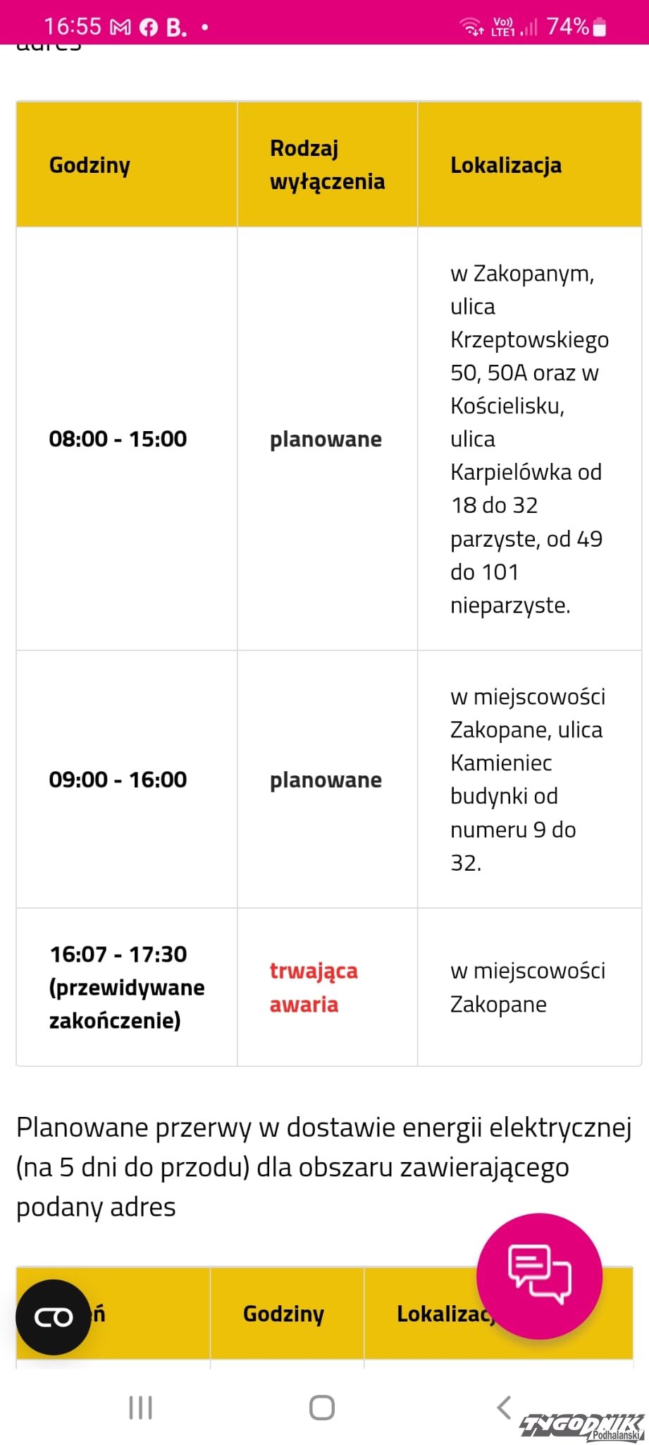 Awaria prądu na Kamieńcu w Zakopanem