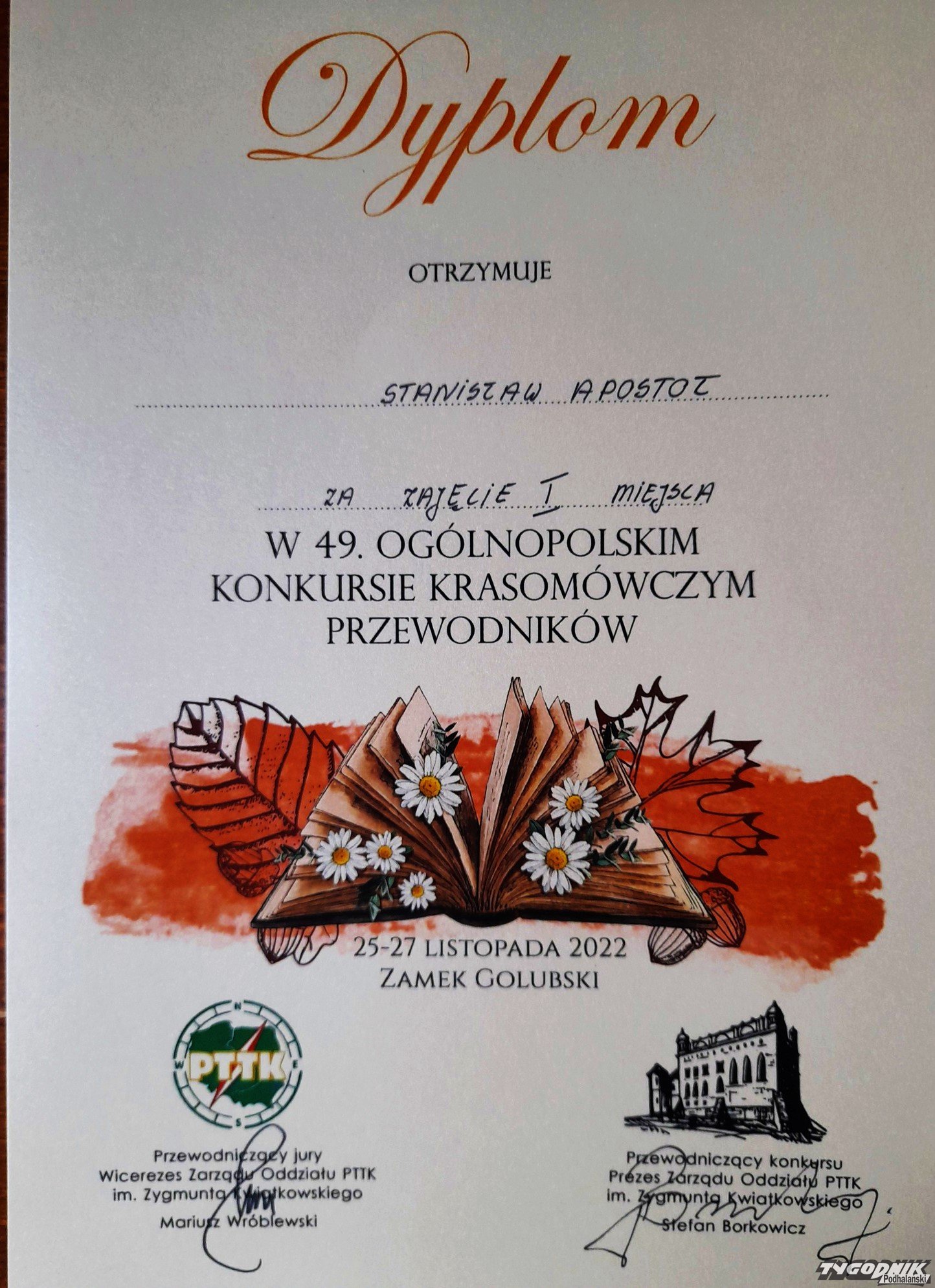 Stanisław Apostoł zajął pierwsze miejsce w 49. Ogólnopolskim Konkursie Krasomówczym Przewodników Turystycznych w Golubiu-Dobrzyniu.
