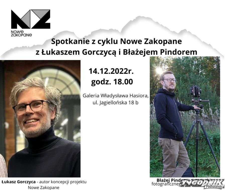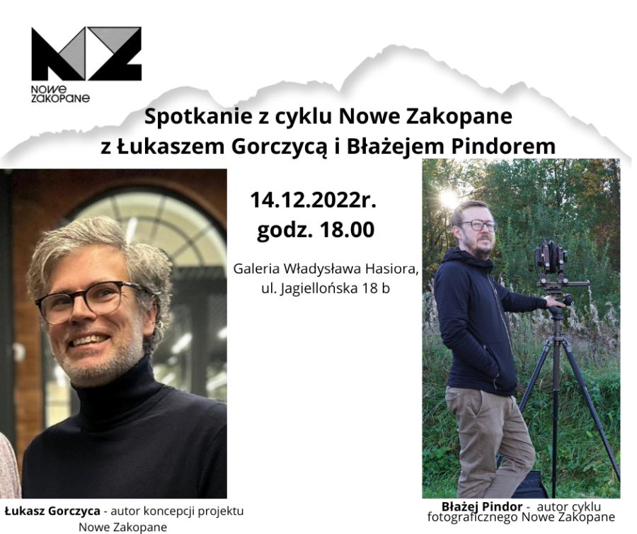 Czwarte ze spotkań zaplanowano na środę 14.12. Rozpocznie się o godzinie 18. Tym razem w Galerii Władysława Hasiora gościć będą Łukasz Gorczyca – autor koncepcji projektu Nowe Zakopane i Błażej Pindor – autor cyklu fotograficznego Nowe Zakopane.