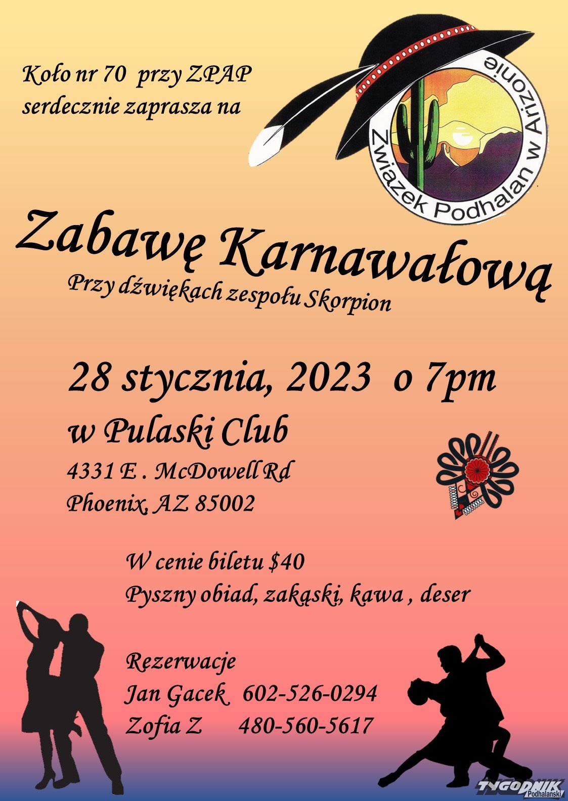 Serdecznie zapraszamy na zabawę karnawałową 28 stycznia 2023 r. w klubie Pułaski w Phoenix.