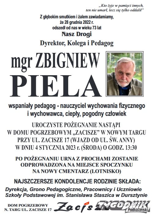 Zbigniew Piela był wieloletnim dyrektorem, nauczycielem wychowania fizycznego i wychowawcą w szkole w Dursztynie. Wychował wiele pokoleń uczniów. Uroczystości pogrzebowe odbędą się w Domu Pogrzebowym Zacisze przy ul. Zacisze 17 w Nowym Targu. Później zmarły spocznie na nowym cmentarzu przy lotnisku.