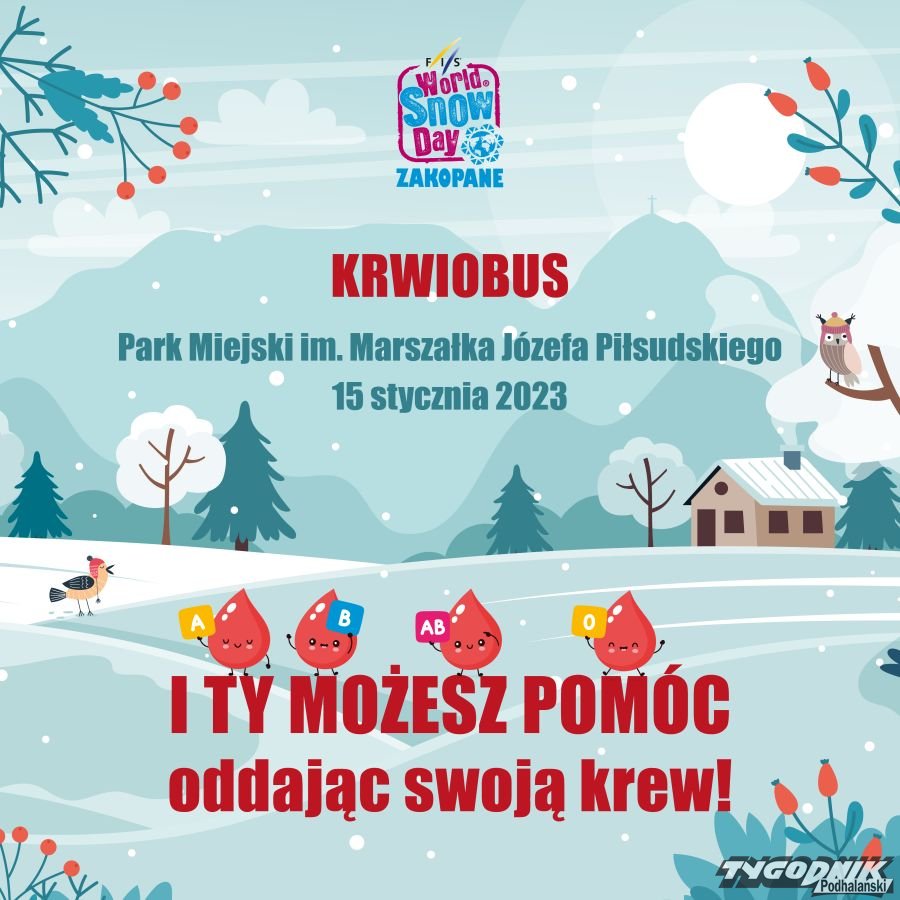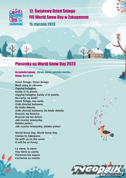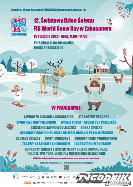 Zakopiański Światowy Dzień Śniegu to święto sportu, dzieci i śniegu, które odbędzie się w niedzielę 15 stycznia w parku miejskim im. Marszałka Józefa Piłsudskiego (liczne atrakcje, konkursy i zabawy) organizowane przez Urząd Miasta Zakopane - Wydział Kultury, Wydział Ochrony Środowiska, Wydział Kultury Fizycznej i Komunikacji Społecznej - wraz z Partnerami: Tatrzańskim Parkiem Narodowym, Tatrzańskim Ochotniczym Pogotowiem Ratunkowym, Instytutem Meteorologii i Gospodarki Wodnej – Państwowym Instytutem Badawczym, Komendą Powiatową Policji w Zakopanem, Komendą Wojewódzką Policji w Krakowie oraz Biurem Prewencji Komendy Głównej Policji w Warszawie.