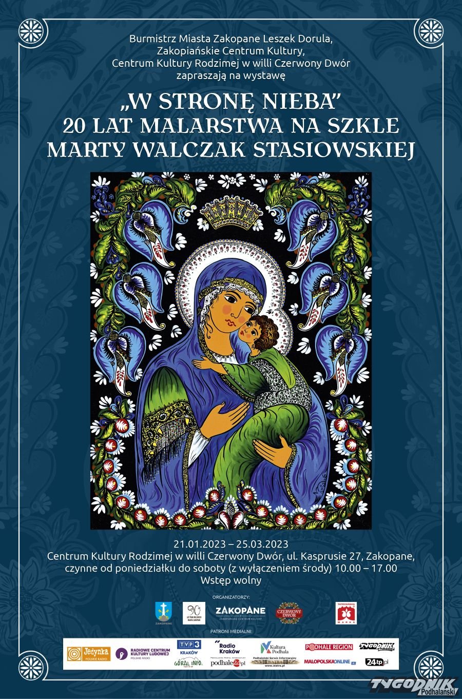 Miasto Zakopane, Zakopiańskie Centrum Kultury i Centrum Kultury Rodzimej w willi Czerwony Dwór zapraszają w piątek 20.01 o godz. 18 na wernisaż wystawy malarstwa na szkle Marty Walczak Stasiowskiej "W stronę nieba", która jest zwieńczeniem 20 lat jej pracy twórczej.