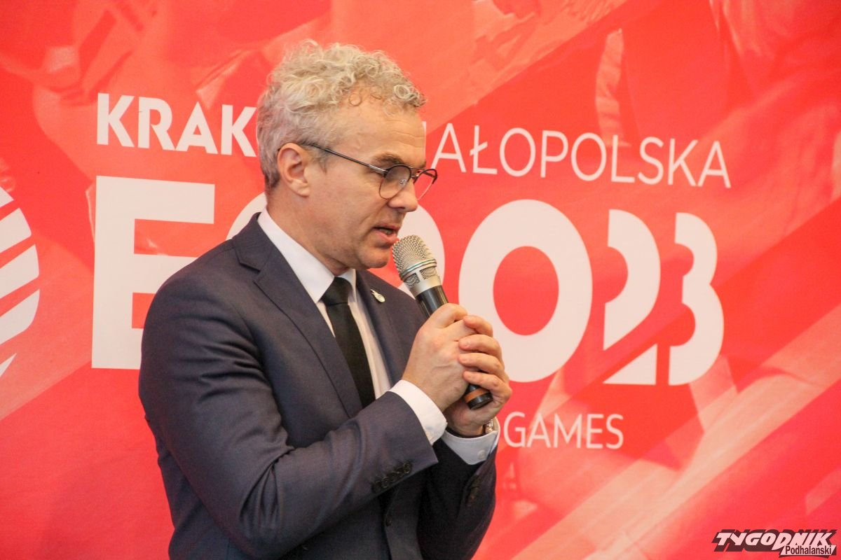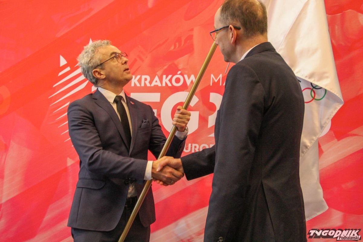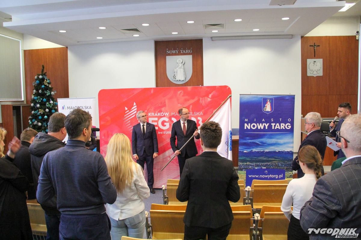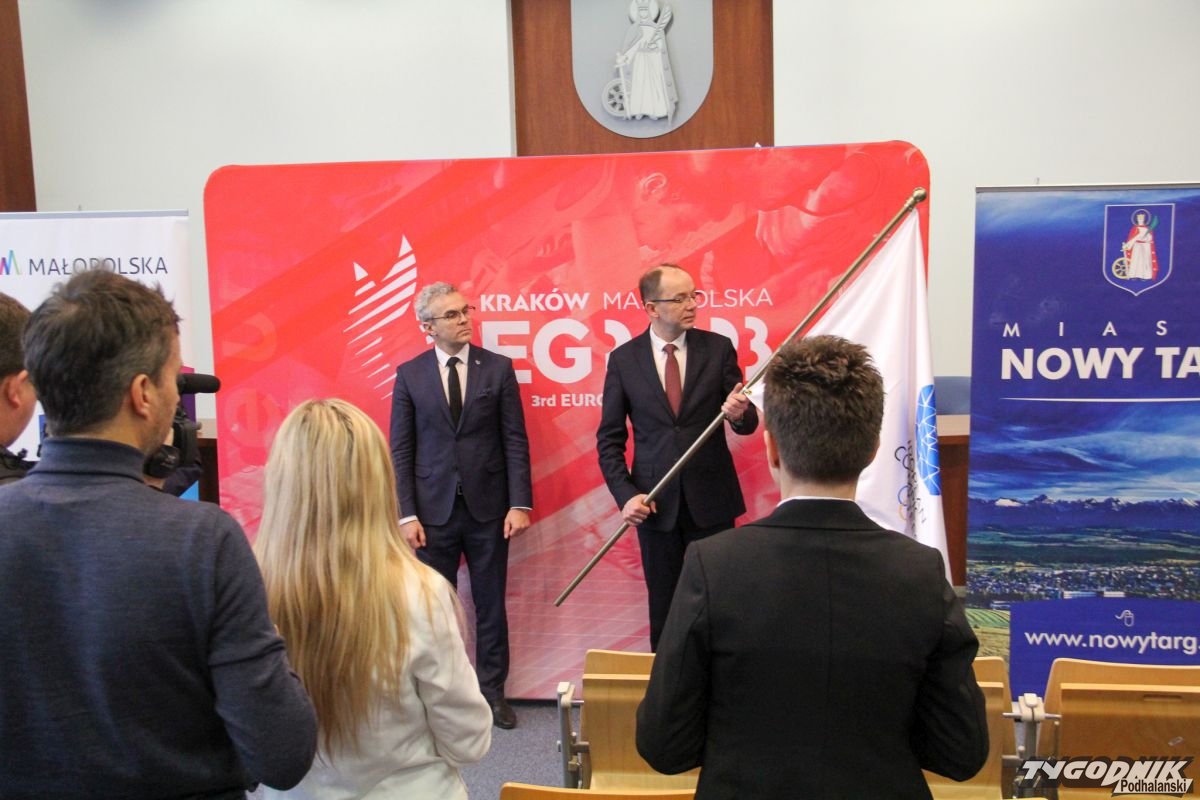 Dziś Witold Kozłowski, marszałek województwa małopolskiego przekazał nowotarżanom sztandar Igrzysk Europejskich, które rozgrywać się będą w tym roku na arenach sportowych Małopolski. Jedną z nich będzie nowotarska hala lodowa, która tym razem zamieni się w bokserski ring. Będą to prestiżowe i ważne zawody, bo pięściarze rywalizować będą dodatkowo o 44 kwalifikacje do igrzysk olimpijskich w Paryżu.