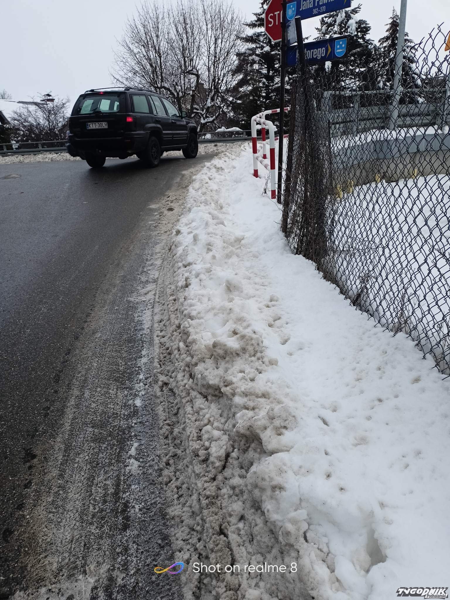 Na poboczach i chodnikach dużo śniegu. Dzieci muszą ulicą iść do szkoły