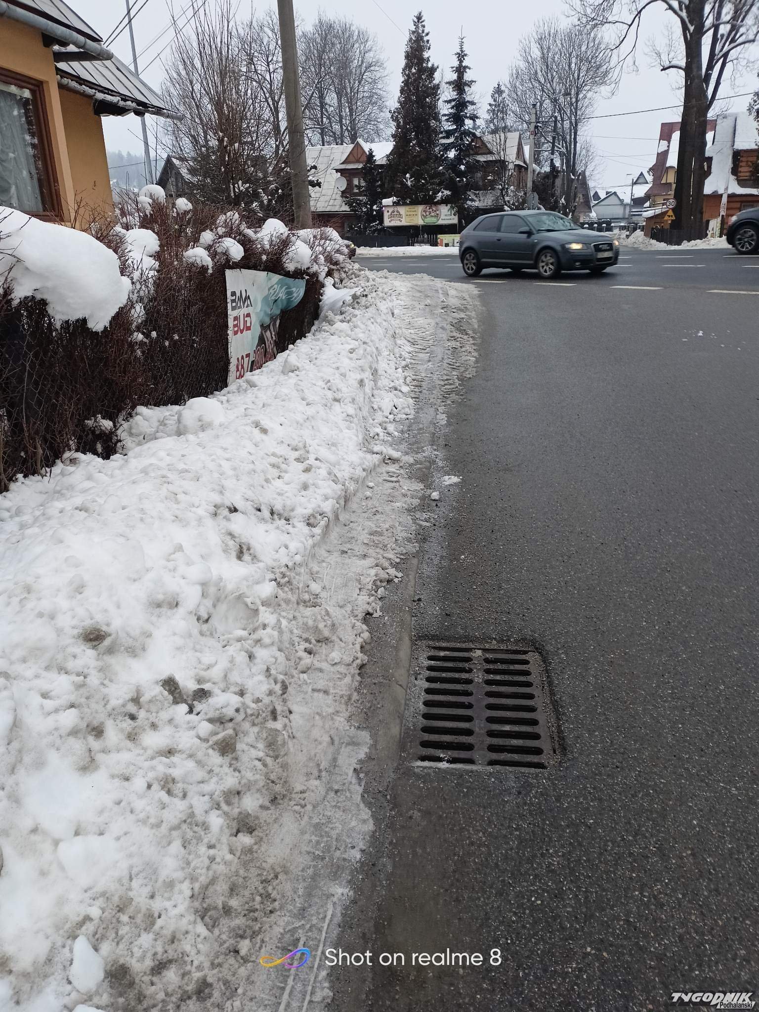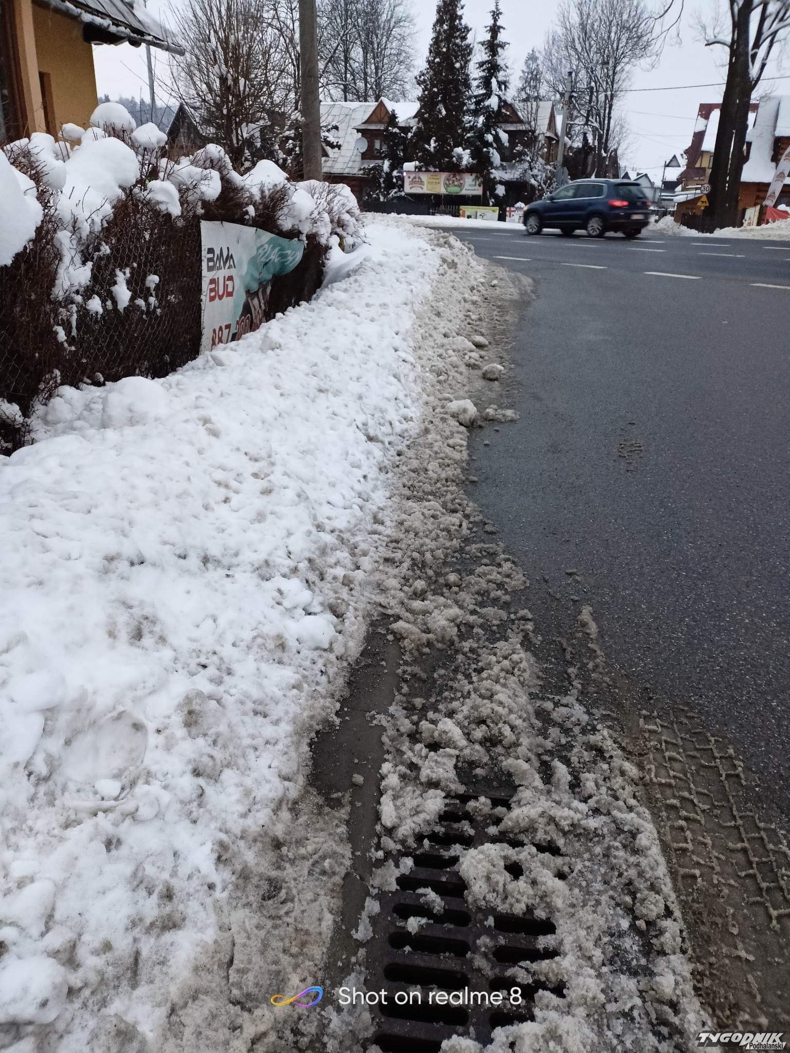 Na chodnikach i poboczach ulic w Białym Dunajcu zalegają pryzmy ze śniegu.