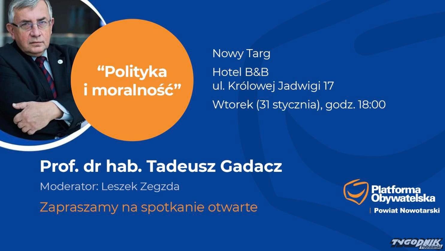 Dlaczego brakuje w niej zrozumienia drugiego człowieka? Na to i na wiele innych pytań spróbuje odpowiedzieć prof. dr hab. Tadeusz Gadacz podczas spotkania pt."Polityka i moralność" w najbliższy wtorek 31 stycznia w hotelu B&B w Nowym Targu.