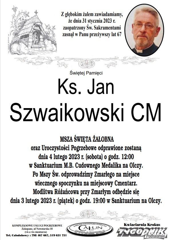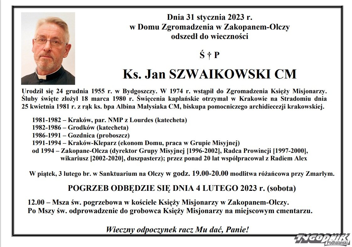 W piątek 3 lutego modlitwa różańcowa i czuwanie przy zmarłym, a w sobotę lokalna społeczność na Olczy pożegna zmarłego kapłana.