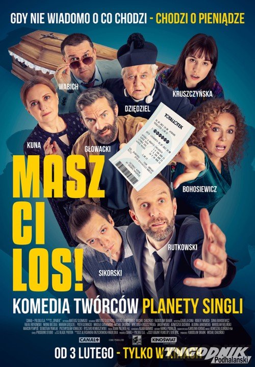To oczywiście niejedyna premiera w kinie „Giewont”. Znajdzie się też coś dla wielbicieli polskich komedii. W sobotę 4.02 o godzinie 18.10 obejrzycie tu „Masz ci los” – zabawną historię pewnej rodziny, która przyjeżdża na pogrzeb ukochanego dziadka. W trakcie stypy okazuje się jednak, że w loterii padły numery, którymi zmarły grał przez całe życie, a zwycięski kupon… został pochowany wraz z nim.