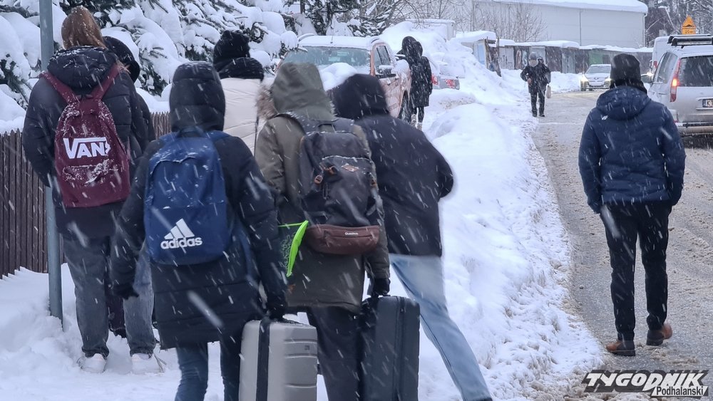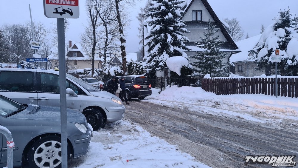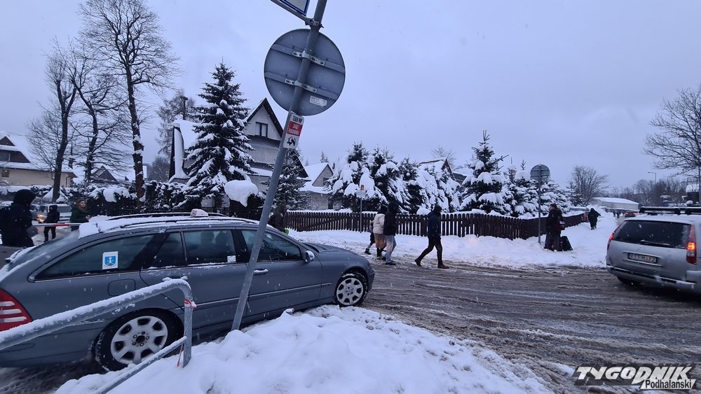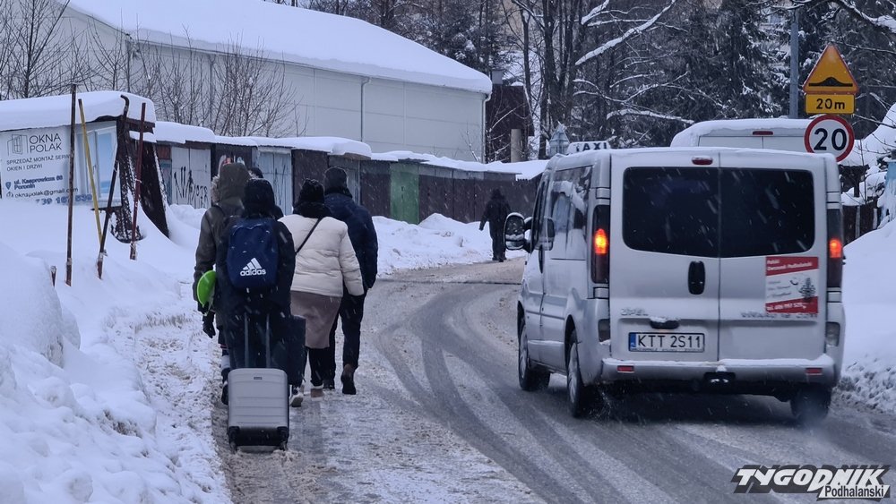 Latem byli pracownicy PKP, którzy wskazywali pasażerom, gdzie mają iść. Teraz mamy mały komunikacyjny chaos, taksówki parkujące gdzie popadnie i do tego dochodzi droga bez chodników, ze zwałami śniegu na poboczach. Tak wyglądają okolice tymczasowego dworca PKP w Zakopanem, gdy przyjeżdża pociąg.